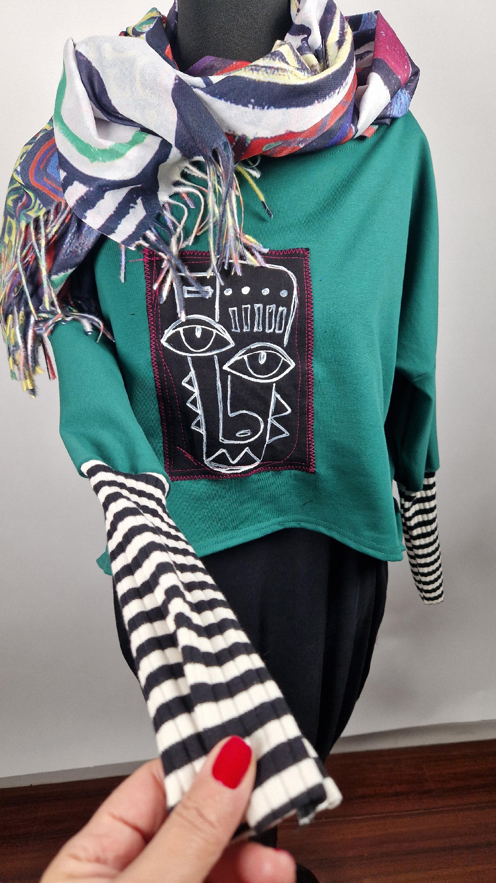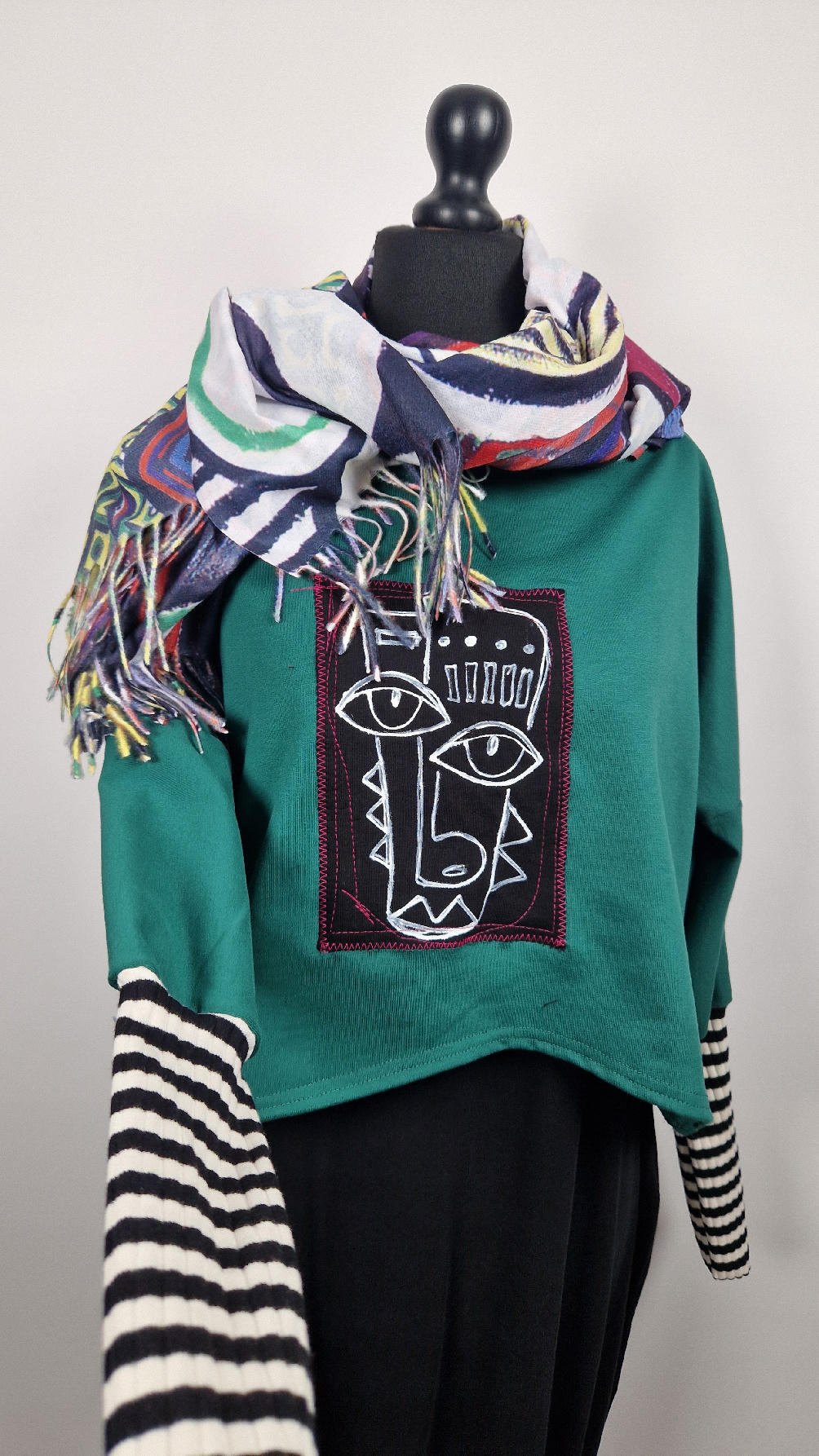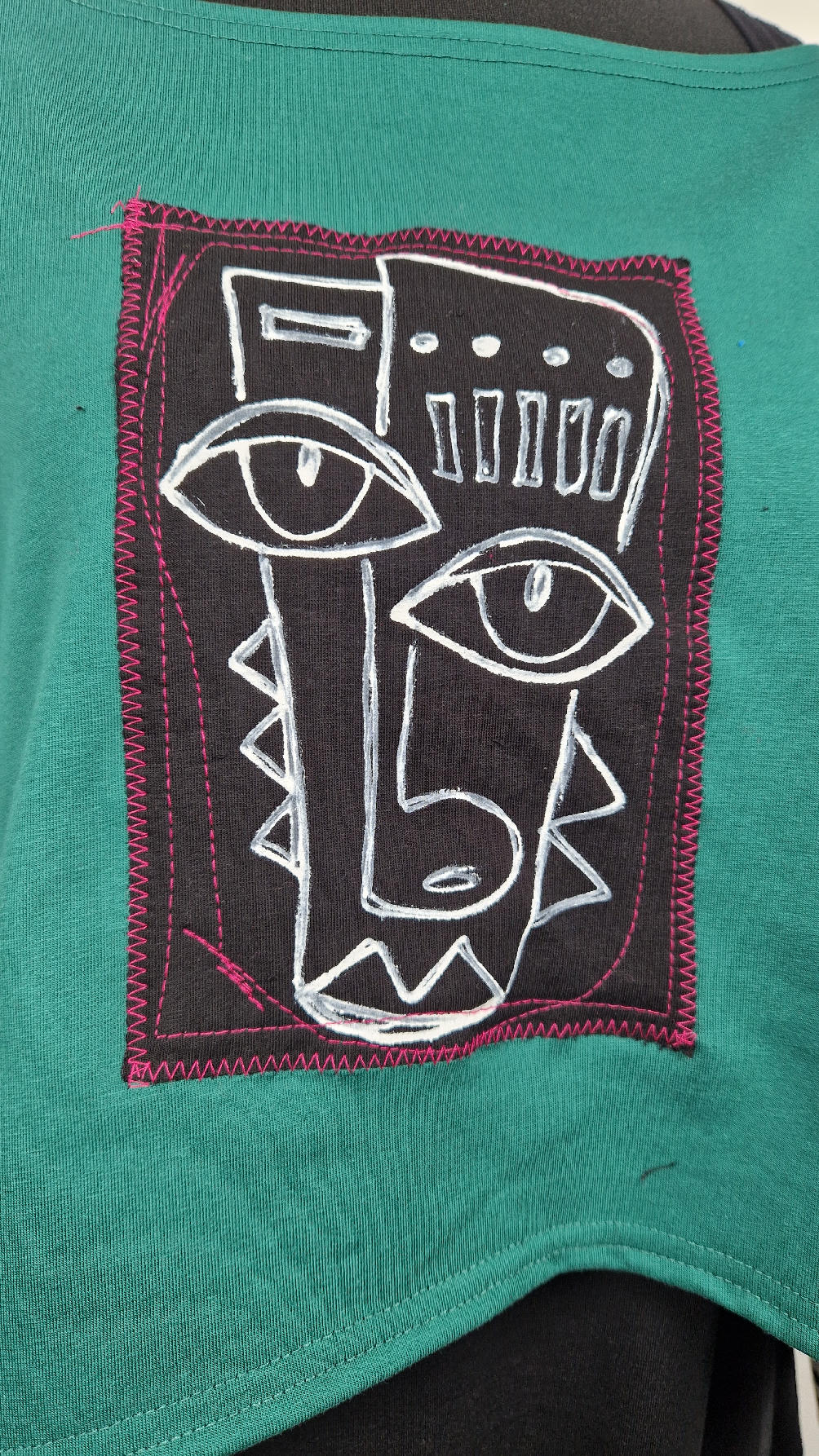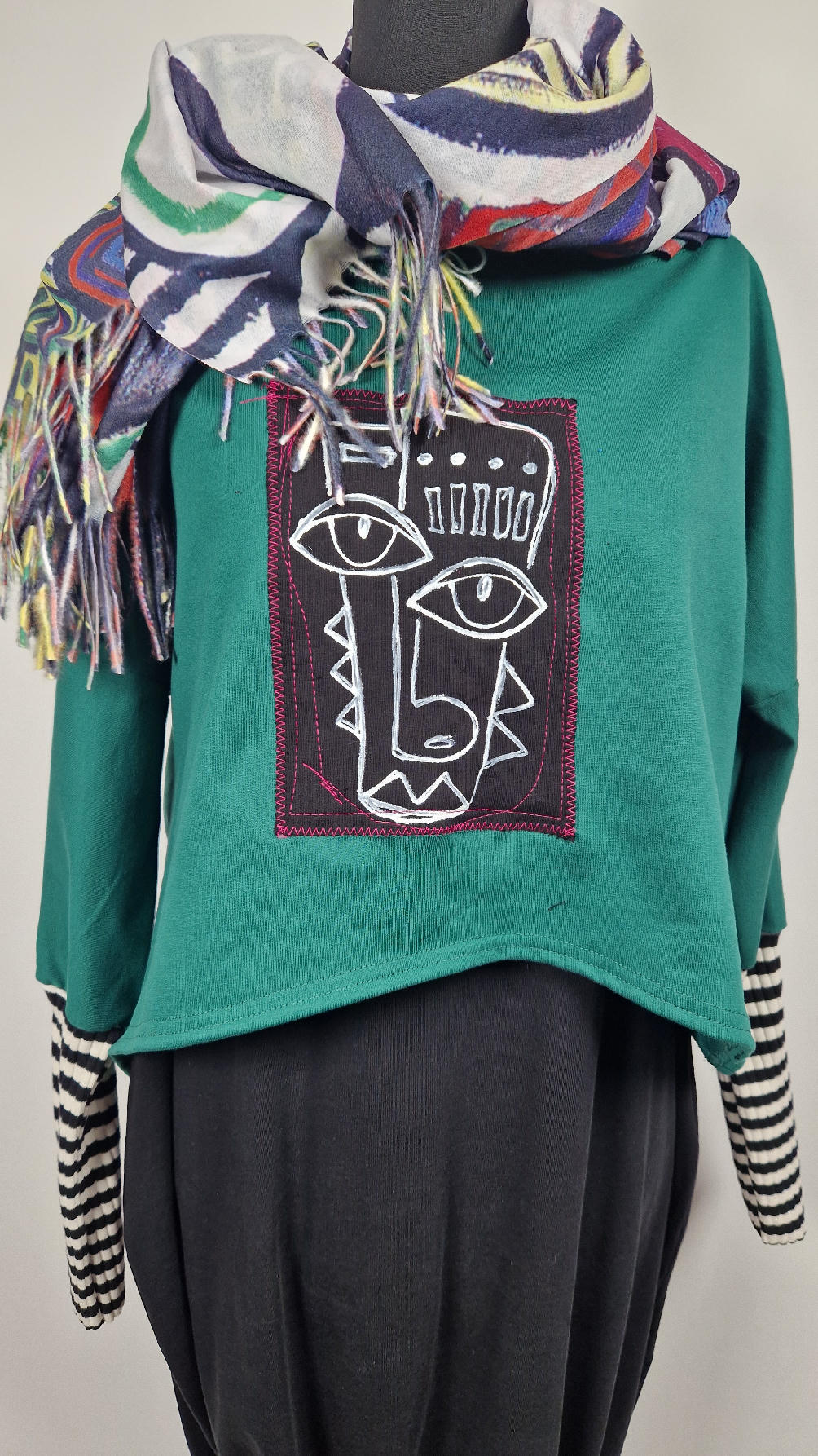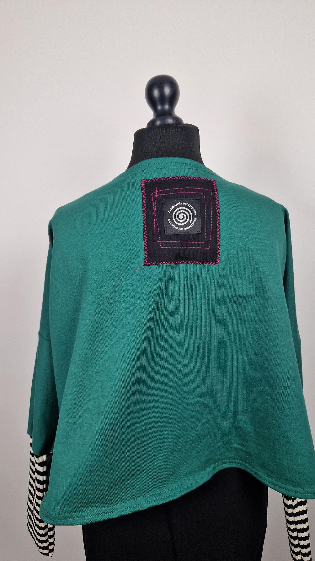 Krótka, ręcznie malowana i poprzeszywana kontrastową nitką, ciemno-zielona luźna w biuście bluzka typu NIETOPERZ, ale taki niewielki….bluzka uszyta z wysokiej jakości bawełny z pętelką, z długalaśnymi , elastycznymi , mankietami w paski… prosta, bez kieszeni – tak specjalnie, żeby nic nie odstawało ale z dużym dekoltem typu ,,łódka”, który możesz opuścić na jedno ramię, lub nosić symetrycznie…Każdy,,portret” jest namalowany ręcznie przeze mnie, na czarnej bawełnie , następnie przyszyty do bluzki