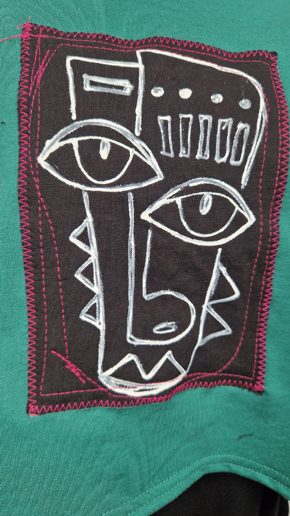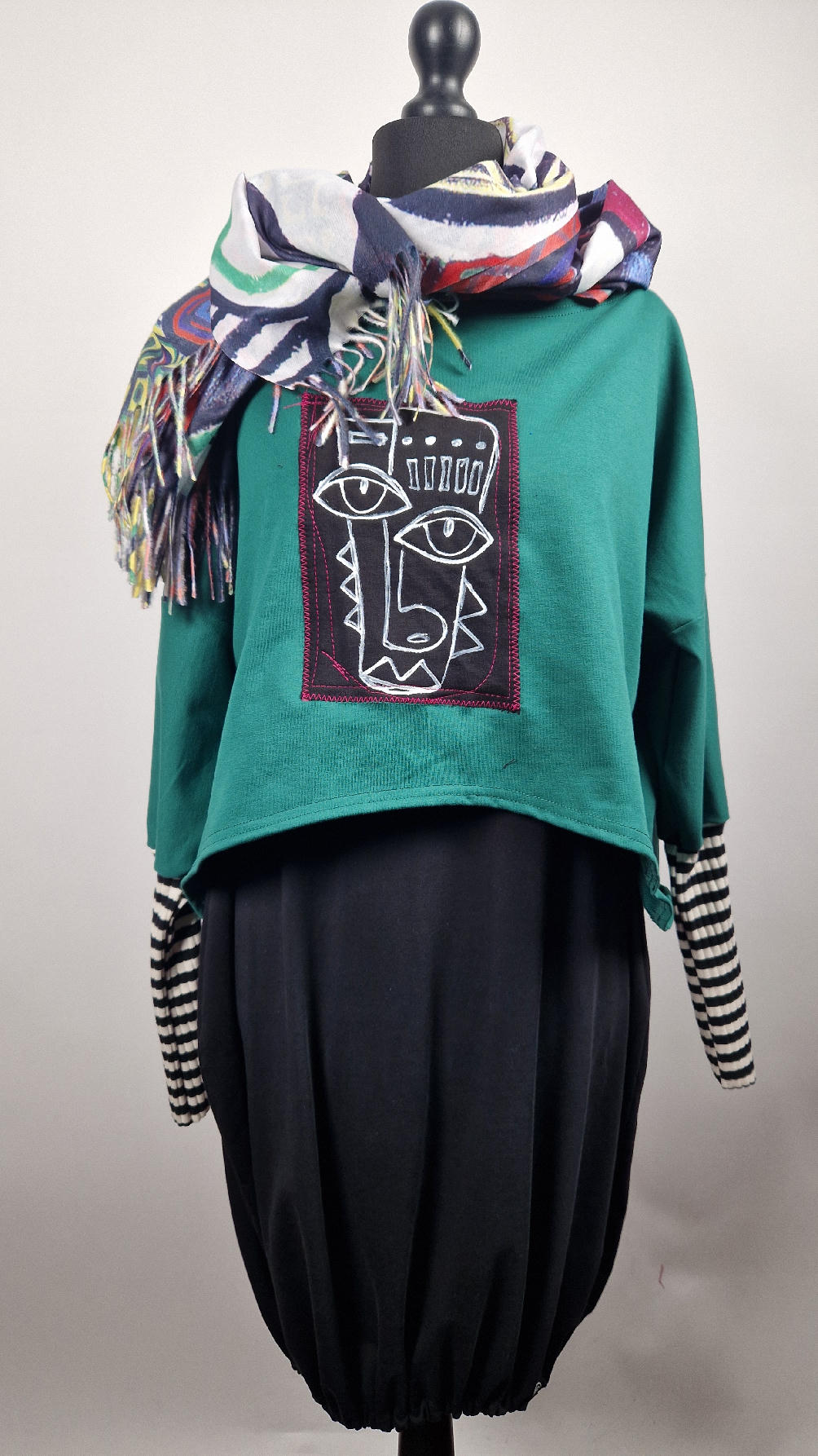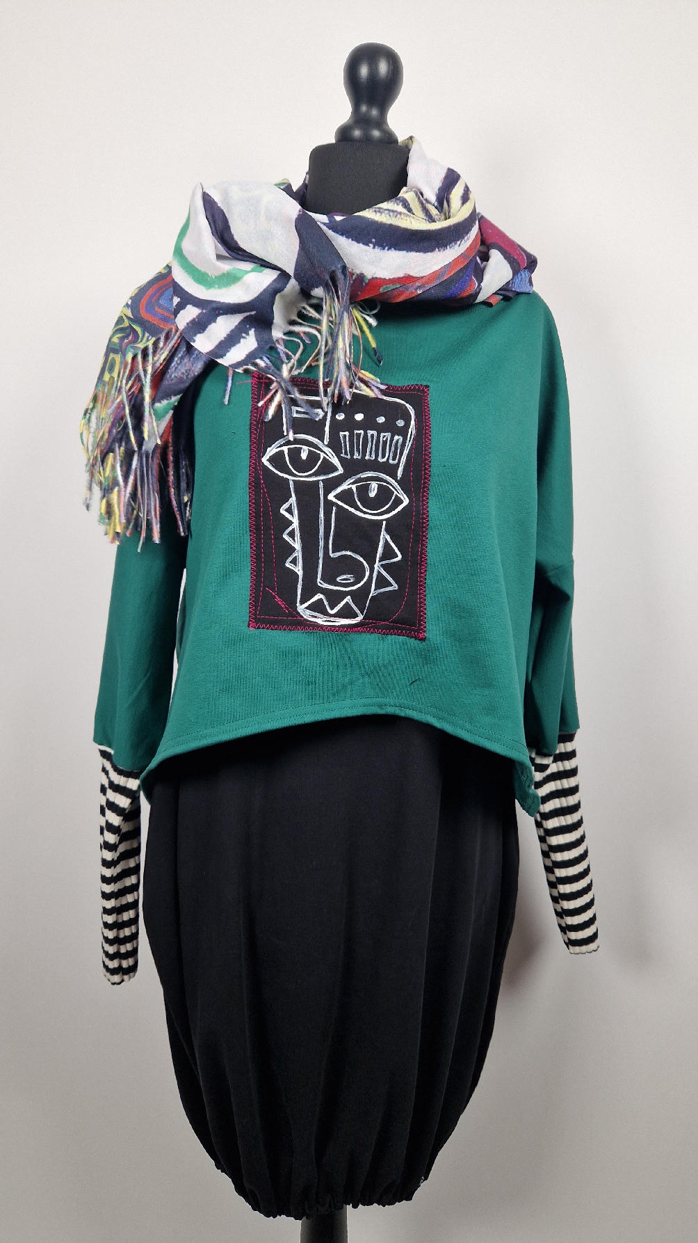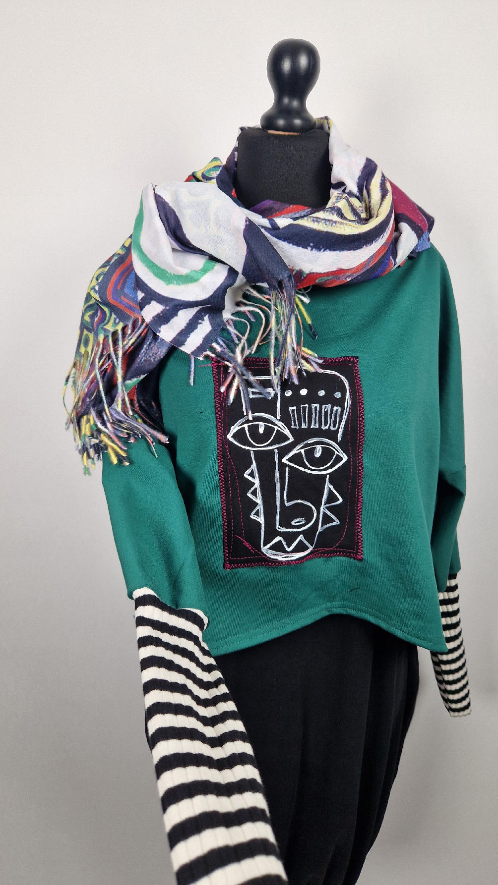 Krótka, ręcznie malowana i poprzeszywana kontrastową nitką, ciemno-zielona luźna w biuście bluzka typu NIETOPERZ, ale taki niewielki….bluzka uszyta z wysokiej jakości bawełny z pętelką, z długalaśnymi , elastycznymi , mankietami w paski… prosta, bez kieszeni – tak specjalnie, żeby nic nie odstawało ale z dużym dekoltem typu ,,łódka”, który możesz opuścić na jedno ramię, lub nosić symetrycznie…Każdy,,portret” jest namalowany ręcznie przeze mnie, na czarnej bawełnie , następnie przyszyty do bluzki