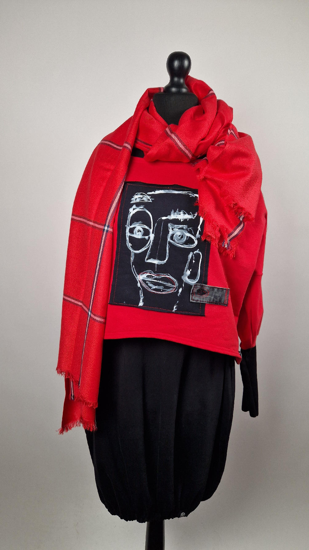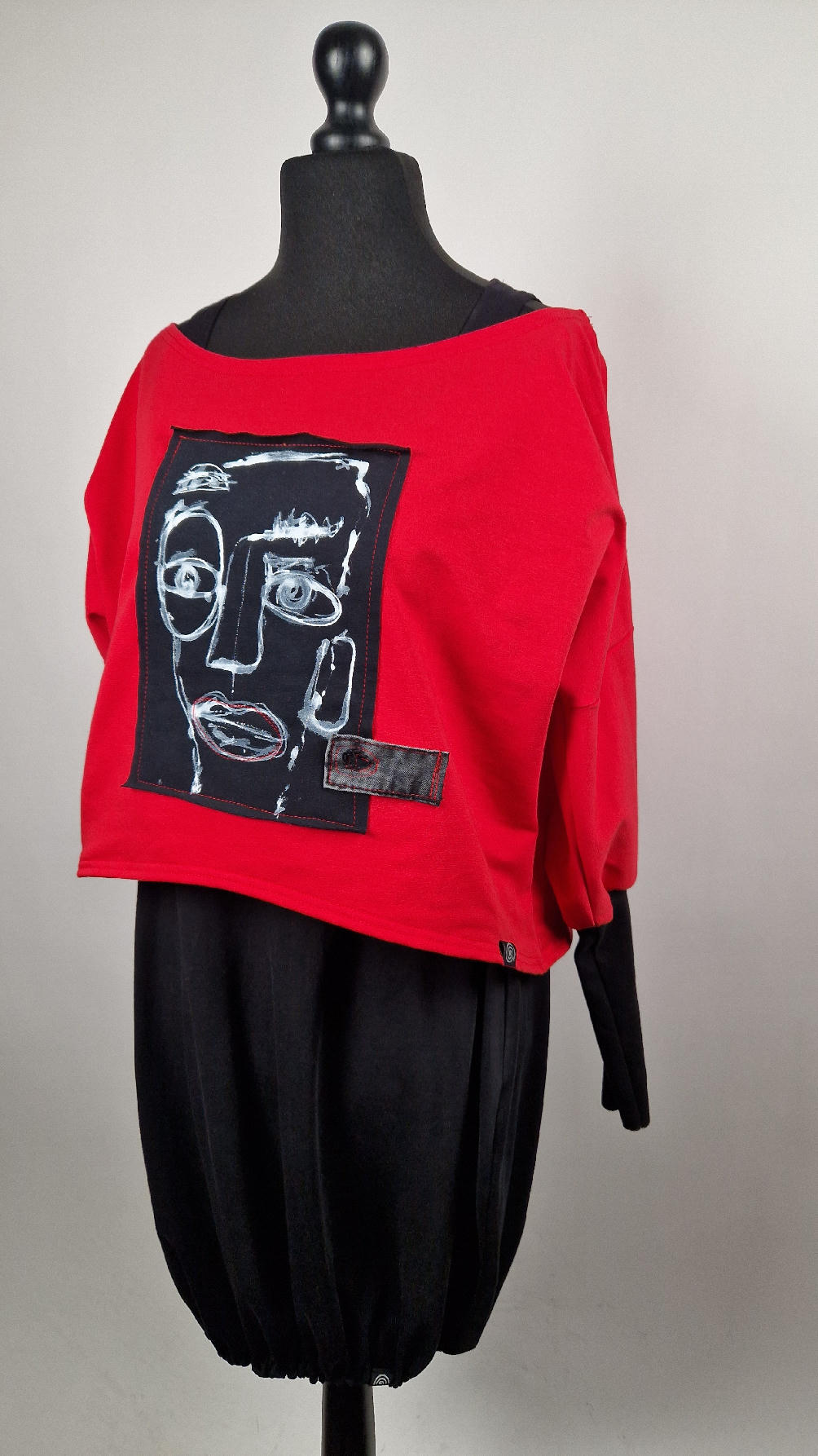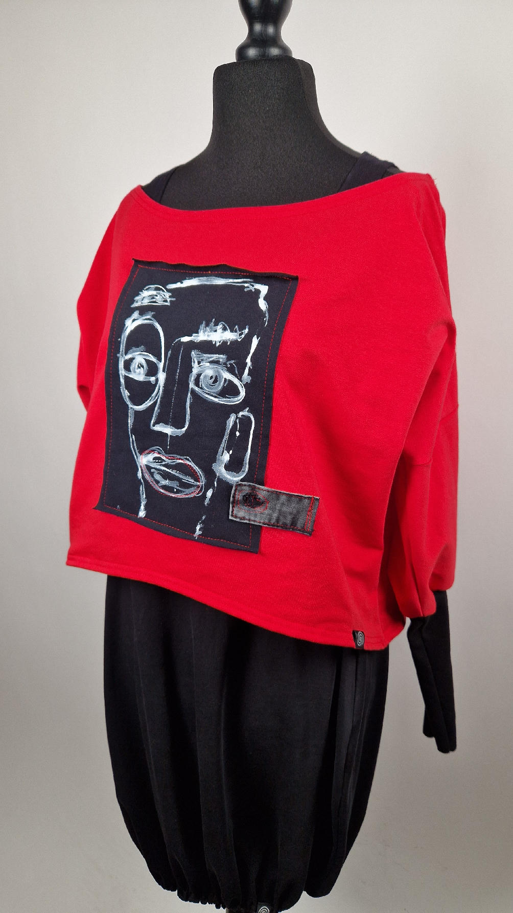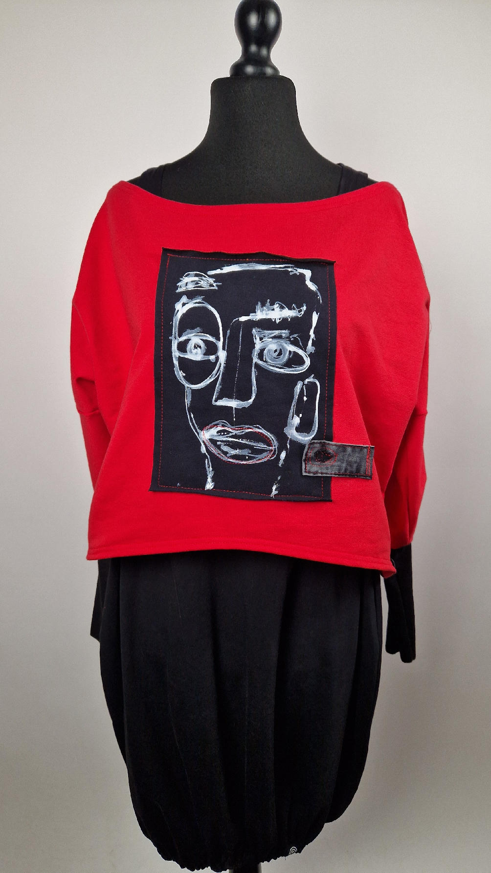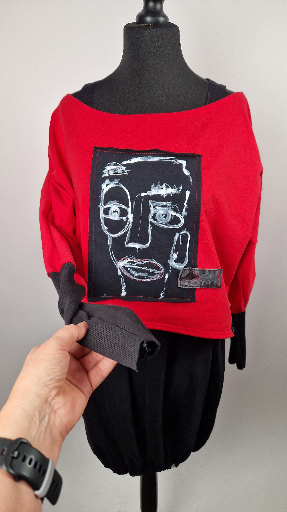 Krótka, czerwona Laila Lu z długimi, czarnymi mankietami, z namalowanym przeze mnie portrecikiem. trzyokiej Lu..taka ,,luzacka”, luźna w biuście bluzka typu NIETOPERZ, ale taki niewielki….bluzka uszyta z wysokiej jakości bawełny z pętelką, z długalaśnymi , elastycznymi mankietami … prosta, bez kieszeni – tak specjalnie, żeby nic nie odstawało ale z dużym dekoltem typu ,,łódka”, który możesz opuścić na jedno ramię, lub nosić symetrycznie…świetnie pasuje do niej naszyjnik LA PERLA BIANCA