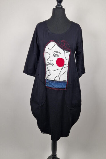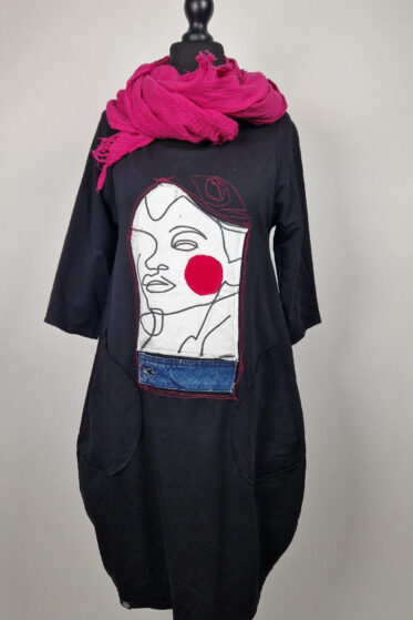 Bawełniana bluzka aczkolwiek z nieelastycznej bawełny, z dużą łódką pod którą można wrzucić top ,lub opuścić dekolt na ramiona…Bluzka malowana ręcznie, z doszytą , ażurową kieszenią, z dużym ozdobnym guziorem i gumką na dole.