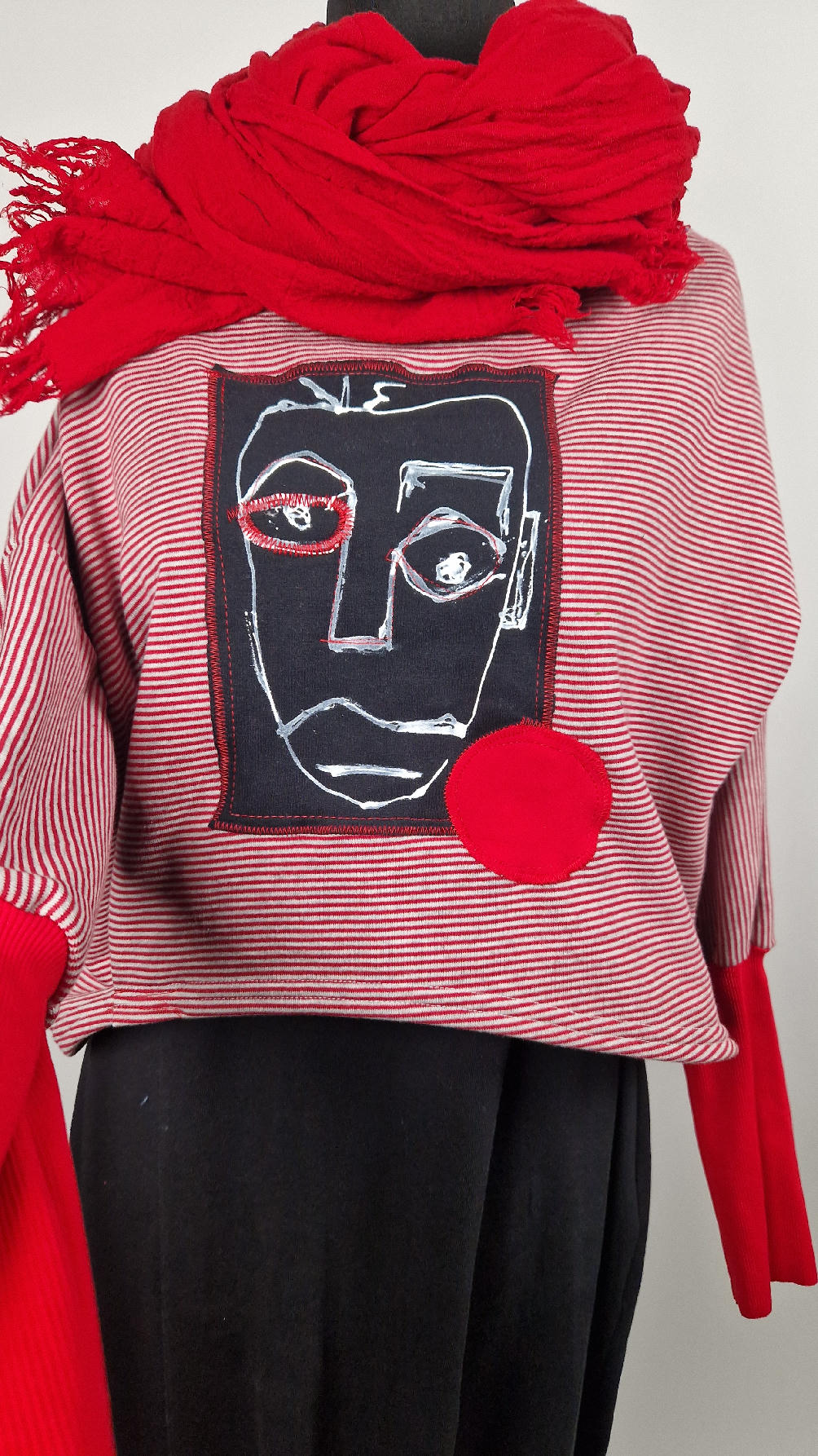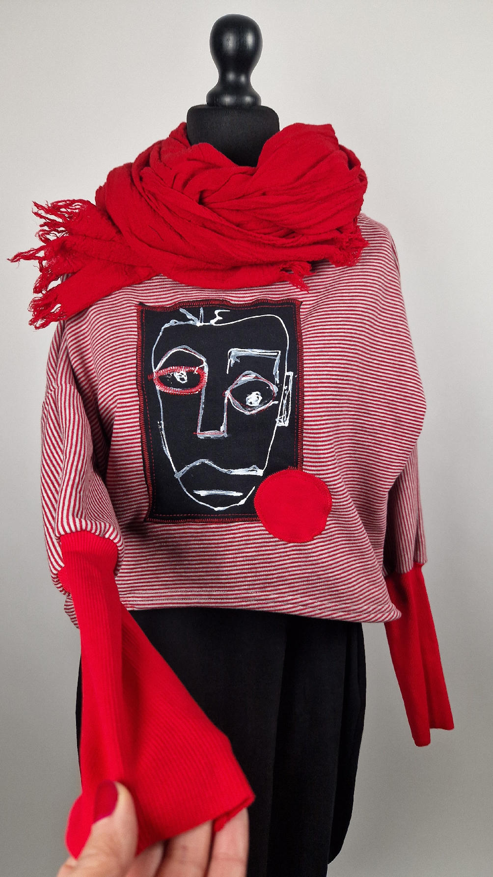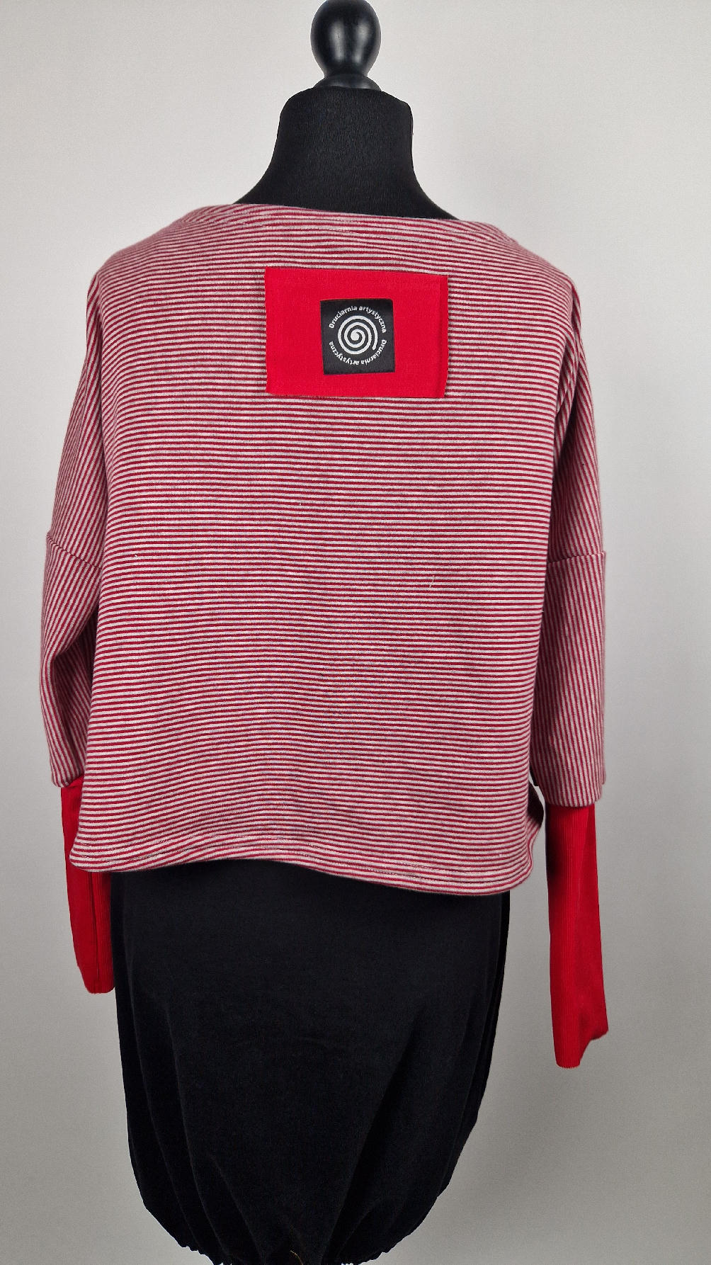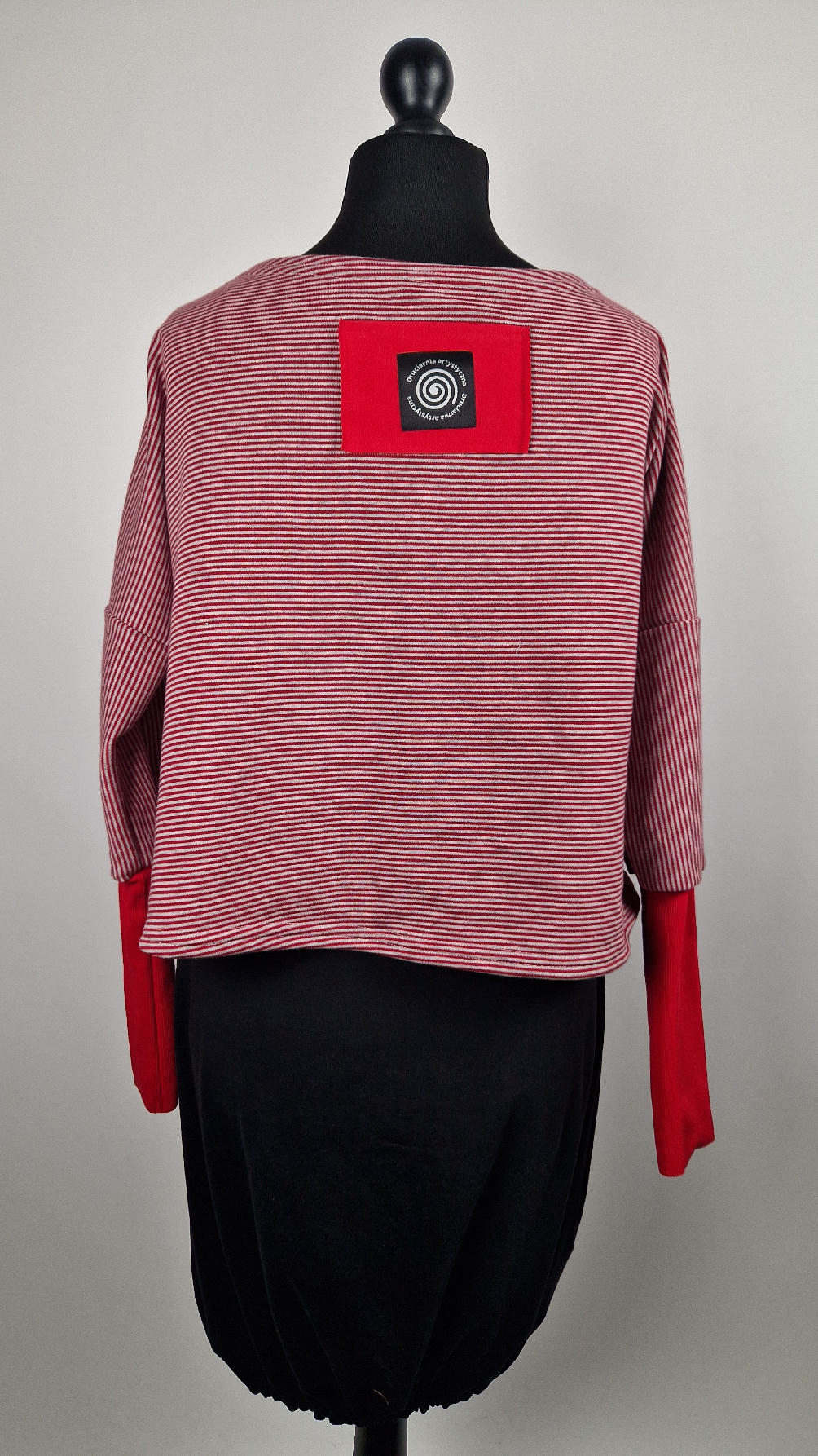 Krótka, czerwono-szara bluzka w cienkie paski z długimi, czerwonymi mankietami, z unikatowym rysunkiem-taka ,,luzacka”, luźna w biuście bluzka typu NIETOPERZ, ale taki niewielki….bluzka uszyta z wysokiej jakości bawełny , z długalaśnymi , elastycznymi mankietami … prosta, bez kieszeni – tak specjalnie, żeby nic nie odstawało , ale z dużym dekoltem typu ,,łódka”, który możesz opuścić na jedno ramię, lub nosić symetrycznie…świetnie pasuje do niej naszyjnik LA PERLA BIANCA