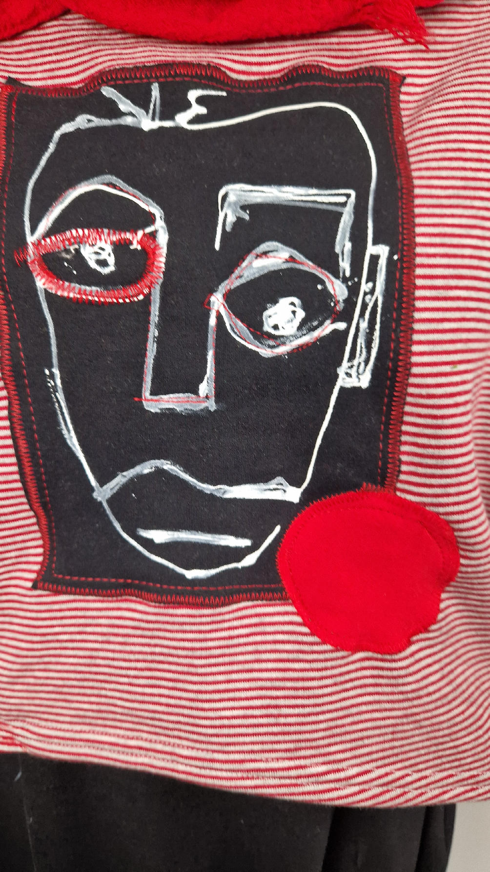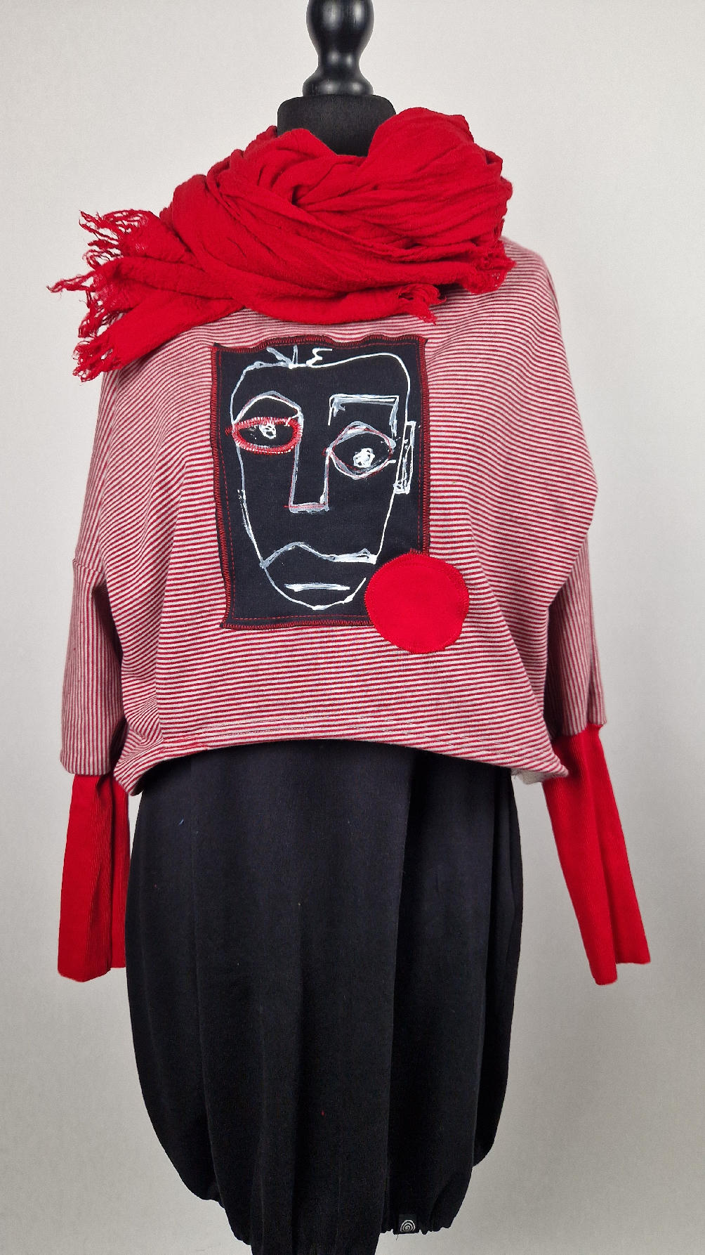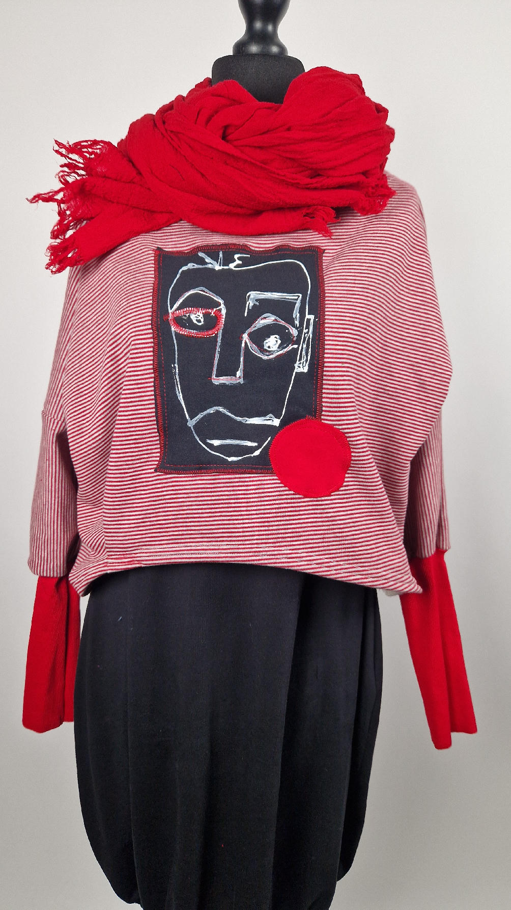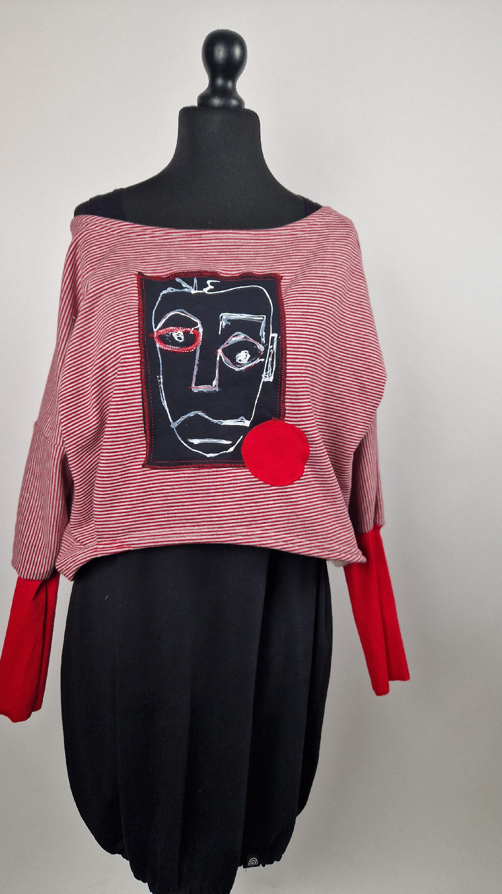 Krótka, czerwono-szara bluzka w cienkie paski z długimi, czerwonymi mankietami, z unikatowym rysunkiem-taka ,,luzacka”, luźna w biuście bluzka typu NIETOPERZ, ale taki niewielki….bluzka uszyta z wysokiej jakości bawełny , z długalaśnymi , elastycznymi mankietami … prosta, bez kieszeni – tak specjalnie, żeby nic nie odstawało , ale z dużym dekoltem typu ,,łódka”, który możesz opuścić na jedno ramię, lub nosić symetrycznie…świetnie pasuje do niej naszyjnik LA PERLA BIANCA
