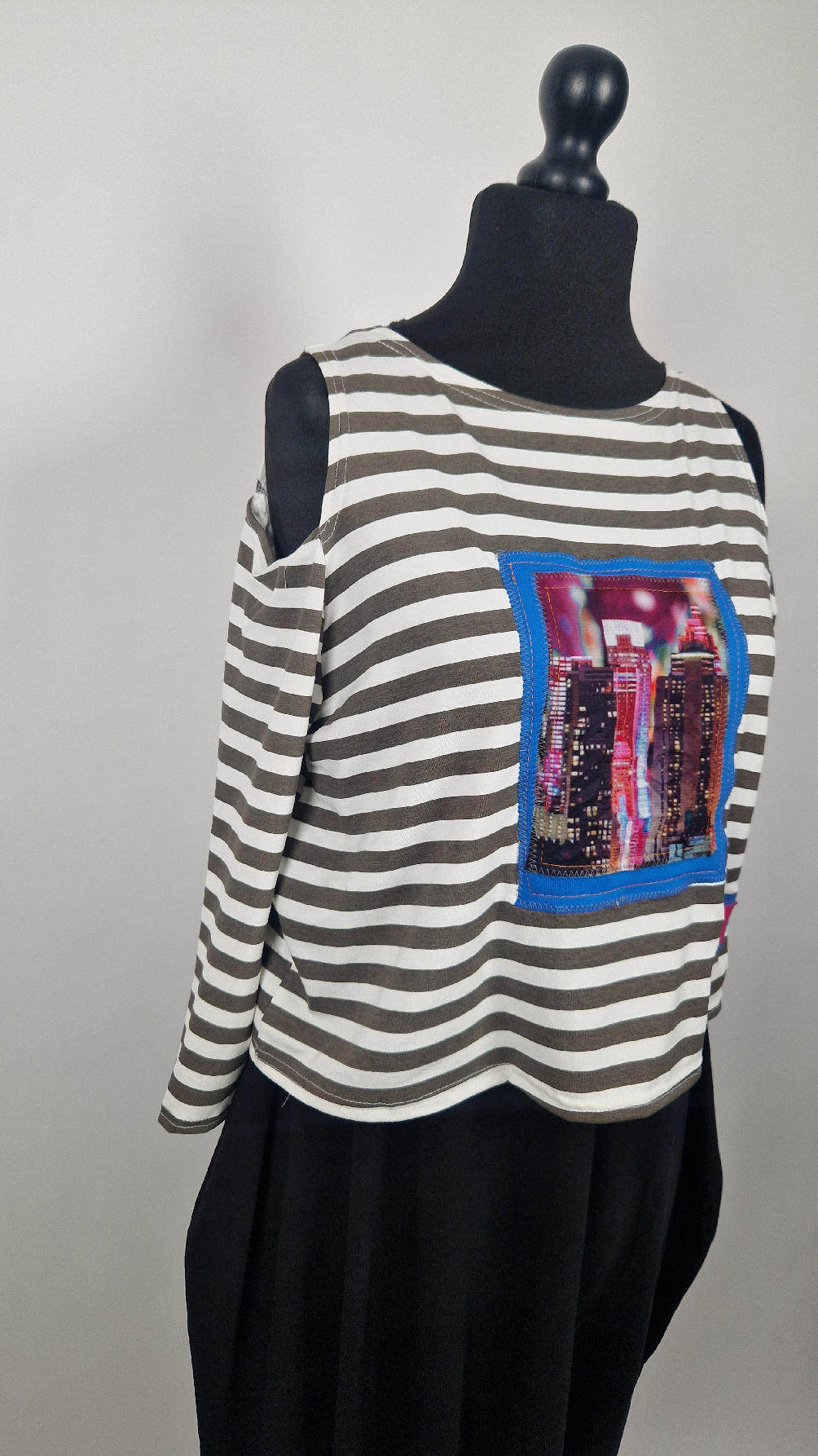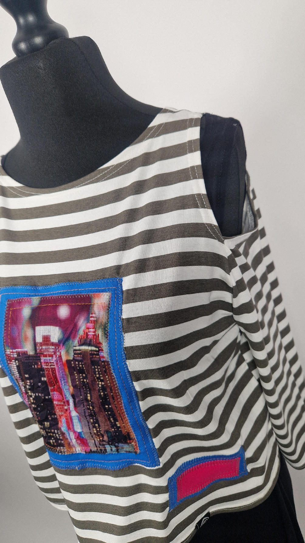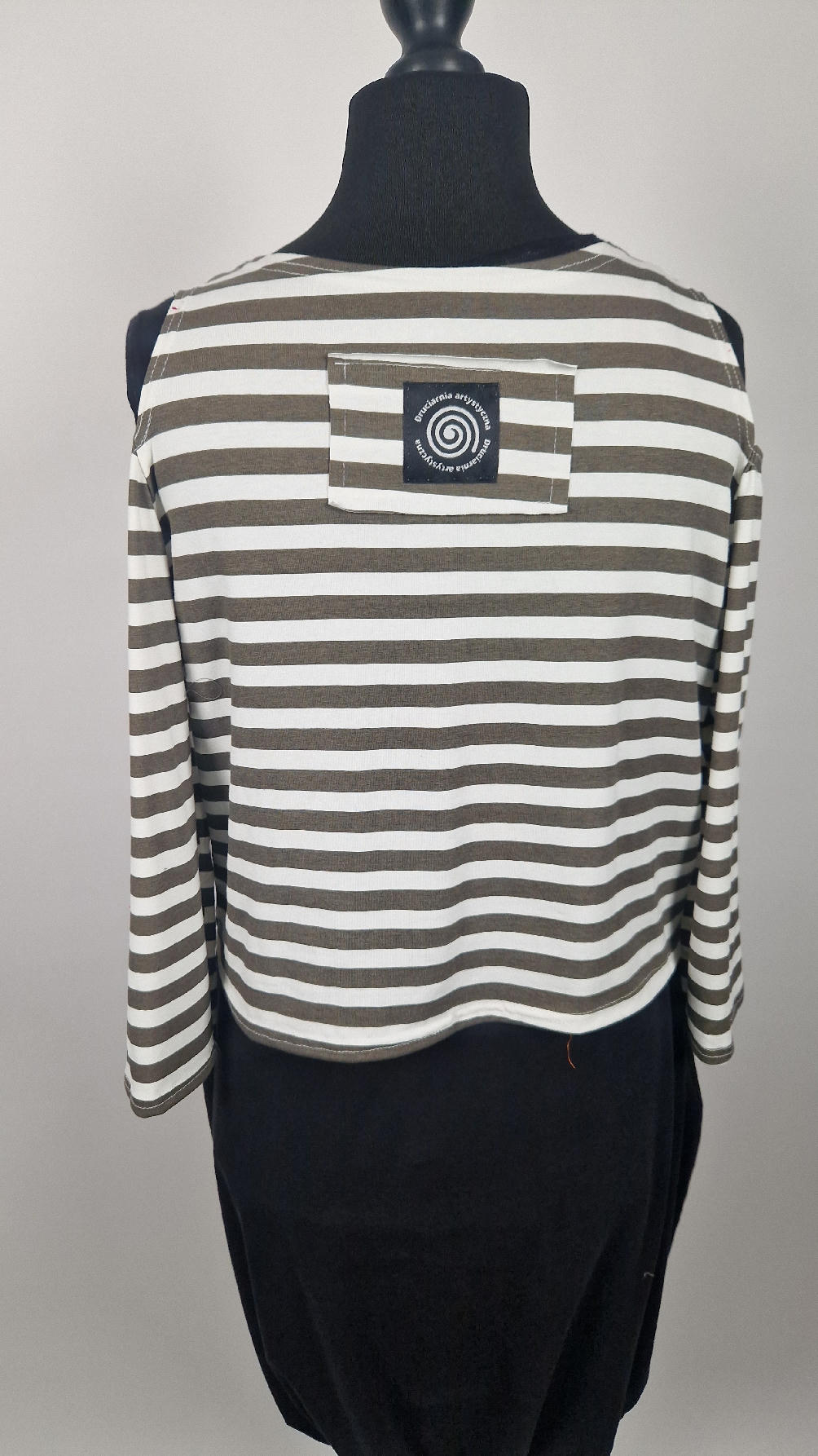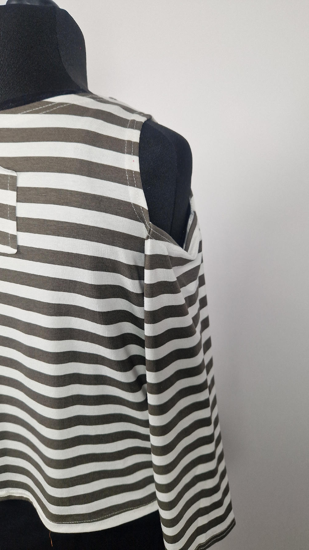Urocza, lekko rozszerzana bluzka w paski, z cieńszej bawełny jersey singiel z kolorowa aplikacją , z rękawem 3/4 z niewielkim dekoltem, a właściwie ,,pod szyjkę” dla równowagi z seksownymi wycięciami na ramionach. Bluzka jest tak skonstruowana, żeby zakryć to, co trzeba…Pokazujesz gładkie ramionko, chowasz ,,pelikany”…
