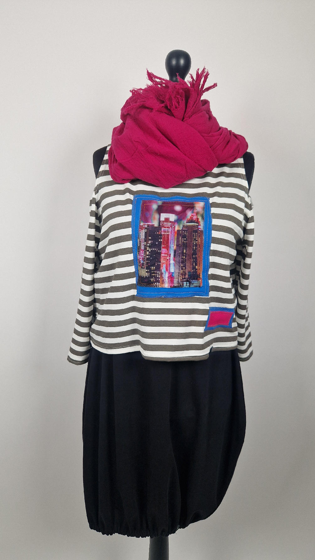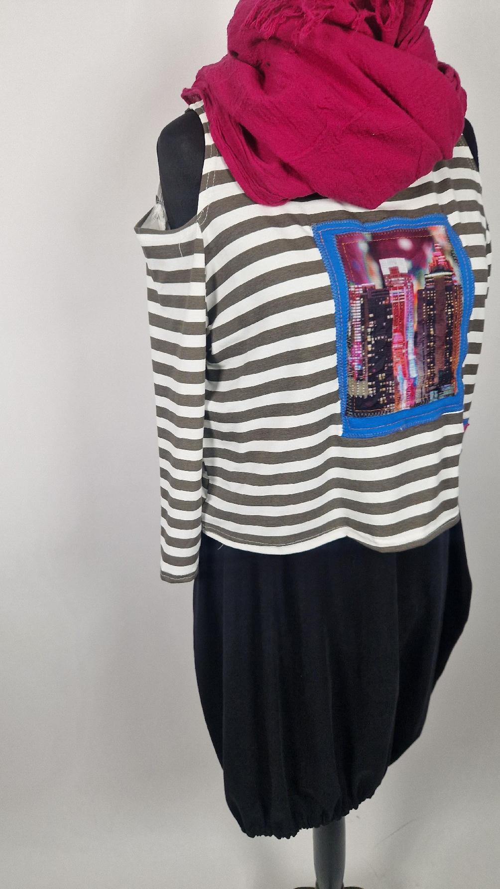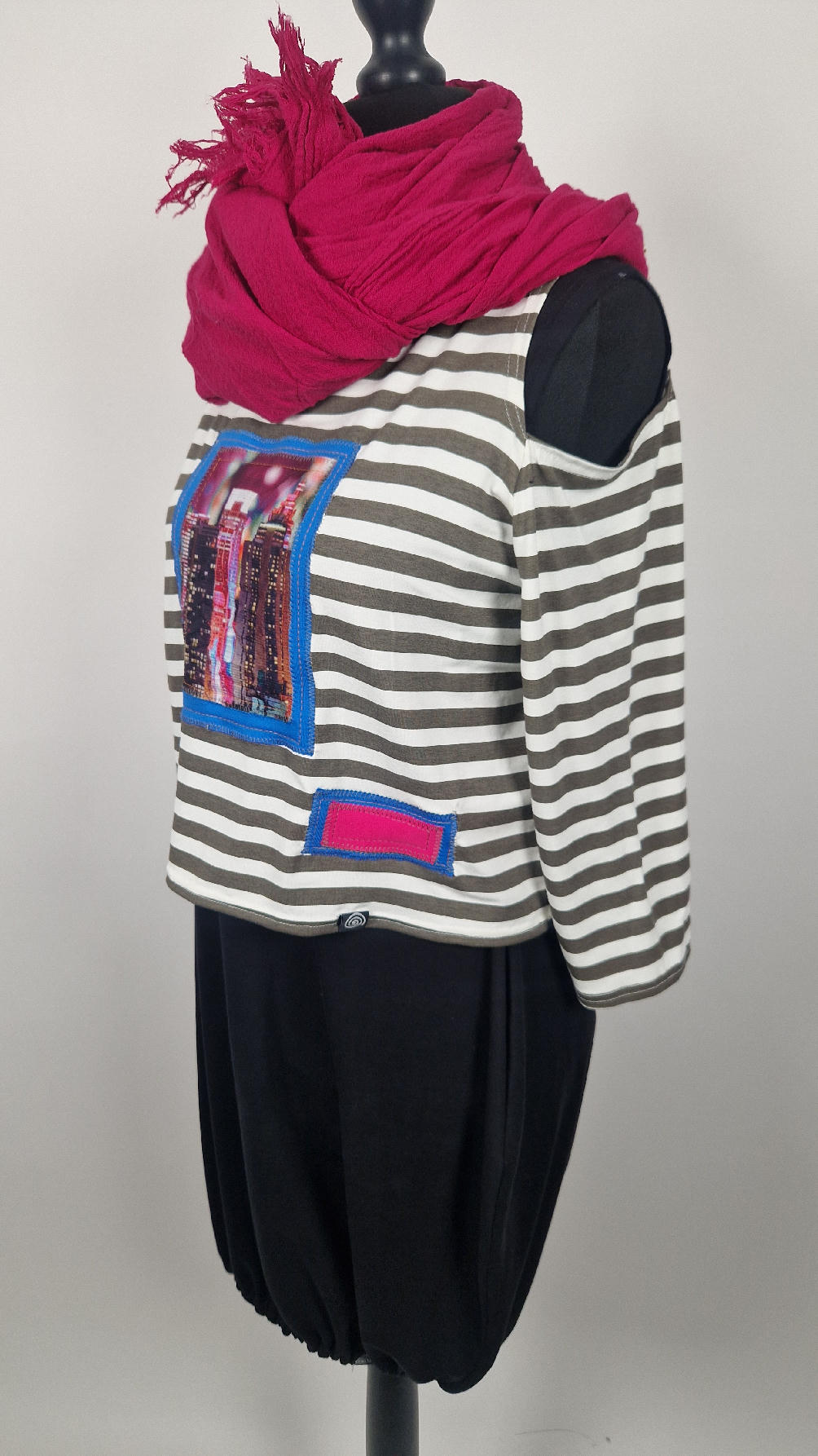 Urocza, lekko rozszerzana bluzka w paski, z cieńszej bawełny jersey singiel z kolorowa aplikacją , z rękawem 3/4 z niewielkim dekoltem, a właściwie ,,pod szyjkę” dla równowagi z seksownymi wycięciami na ramionach. Bluzka jest tak skonstruowana, żeby zakryć to, co trzeba…Pokazujesz gładkie ramionko, chowasz ,,pelikany”…