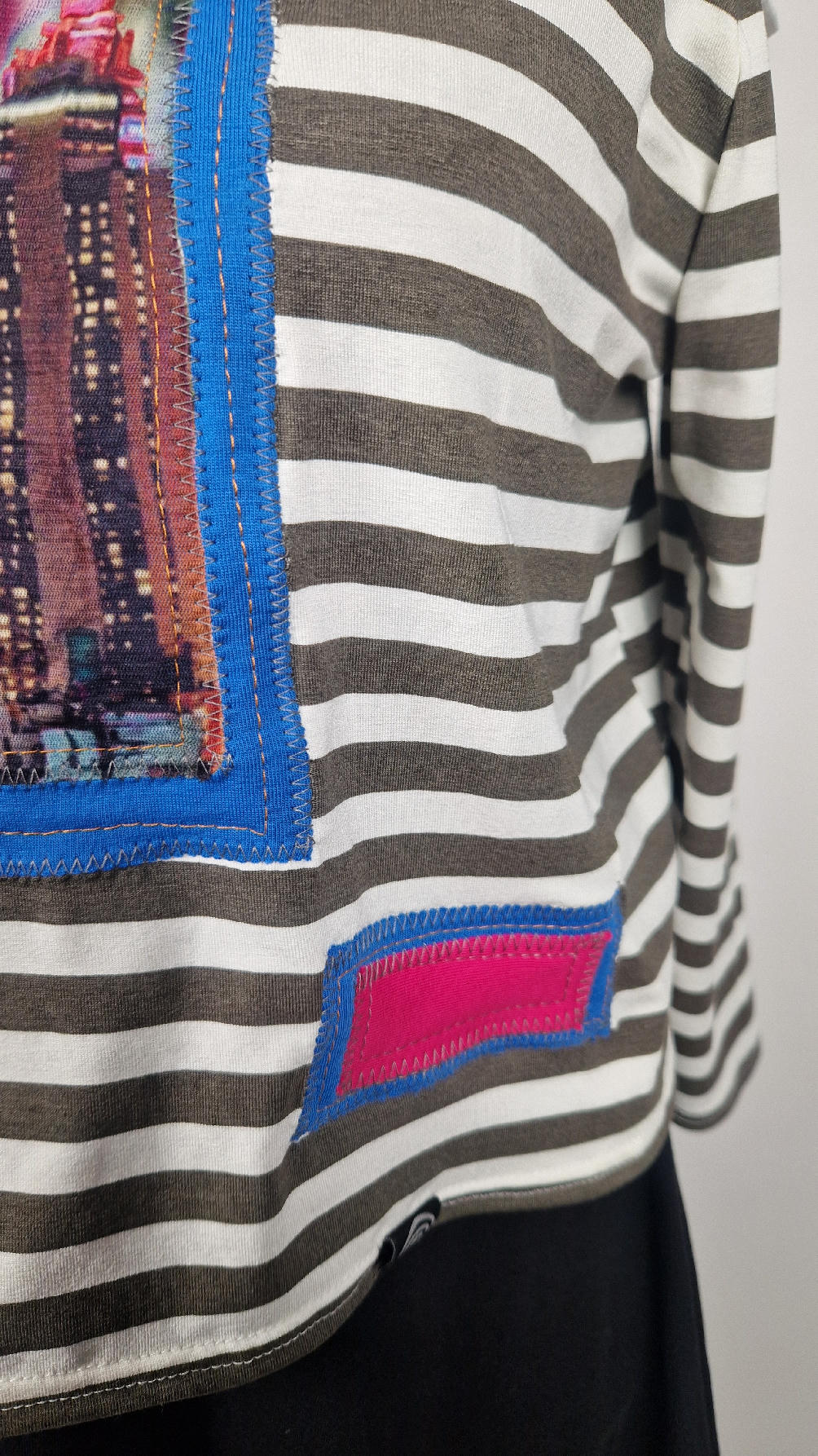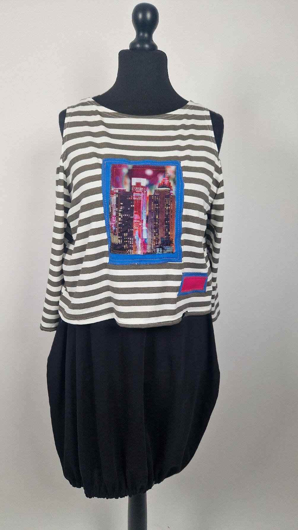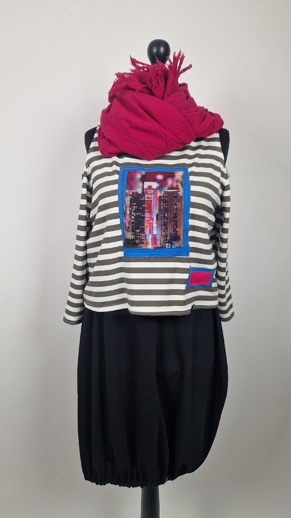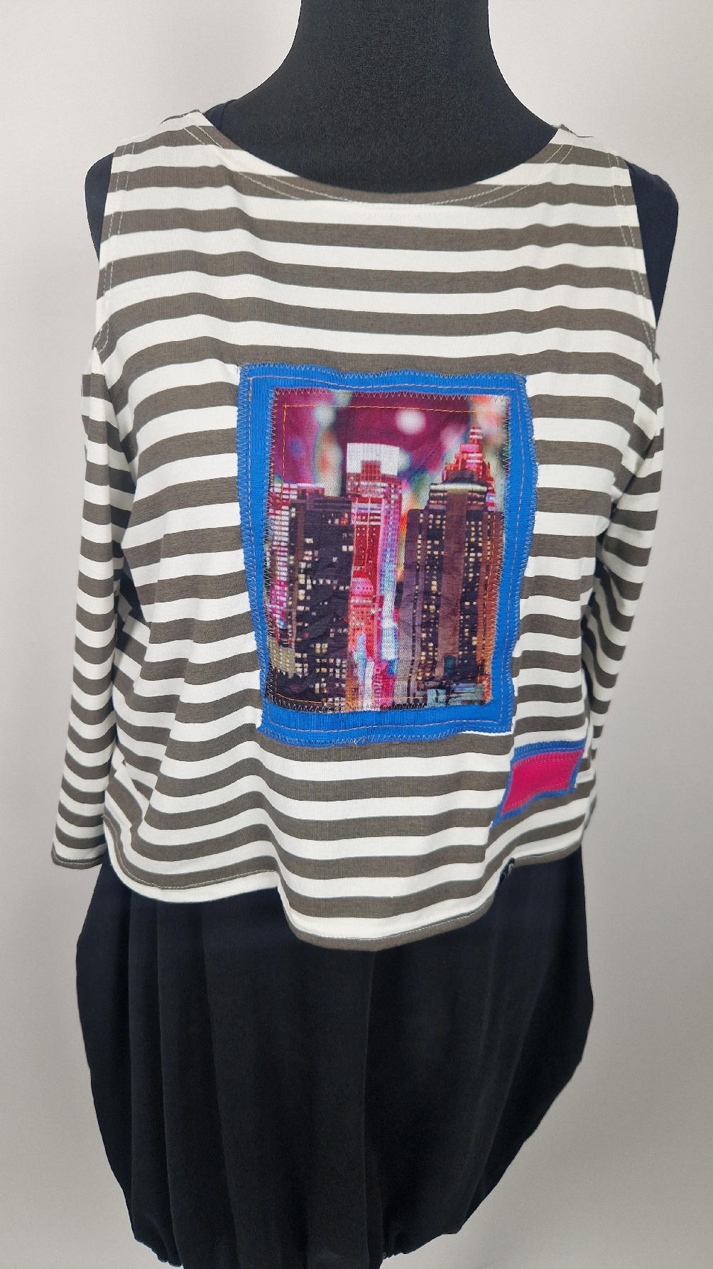 Urocza, lekko rozszerzana bluzka w paski, z cieńszej bawełny jersey singiel z kolorowa aplikacją , z rękawem 3/4 z niewielkim dekoltem, a właściwie ,,pod szyjkę” dla równowagi z seksownymi wycięciami na ramionach. Bluzka jest tak skonstruowana, żeby zakryć to, co trzeba…Pokazujesz gładkie ramionko, chowasz ,,pelikany”…