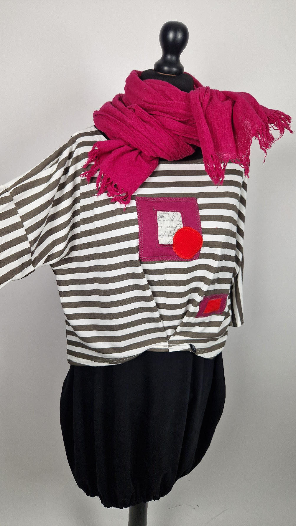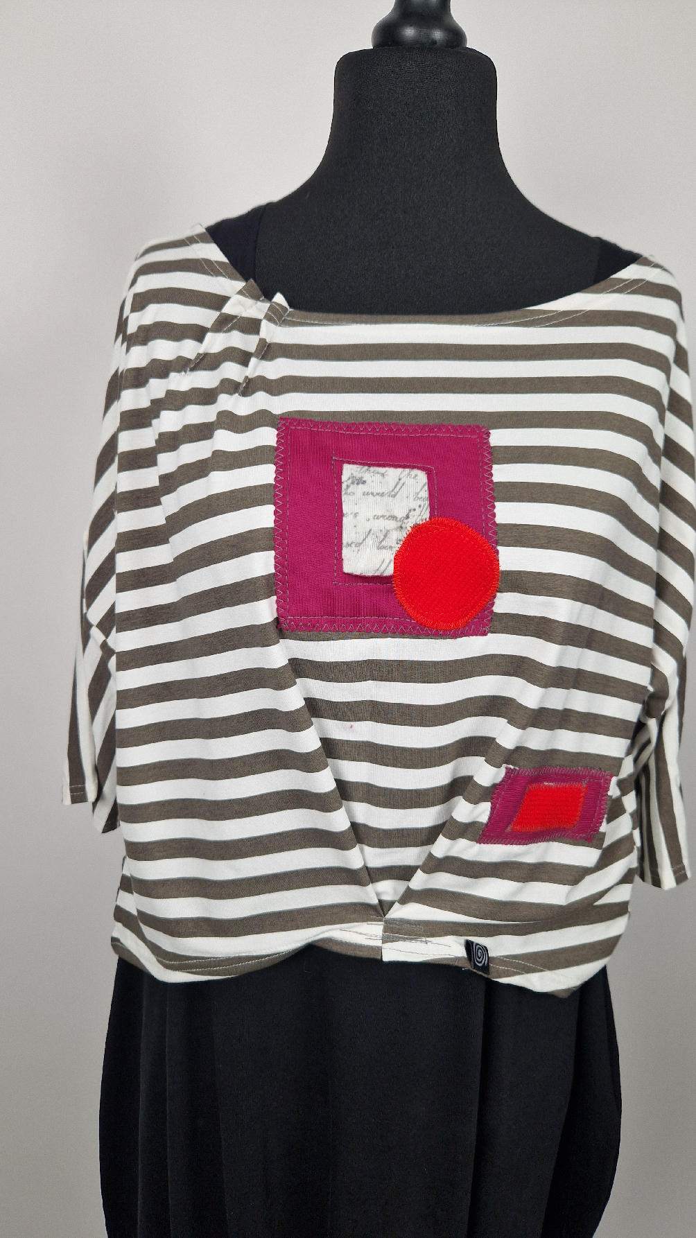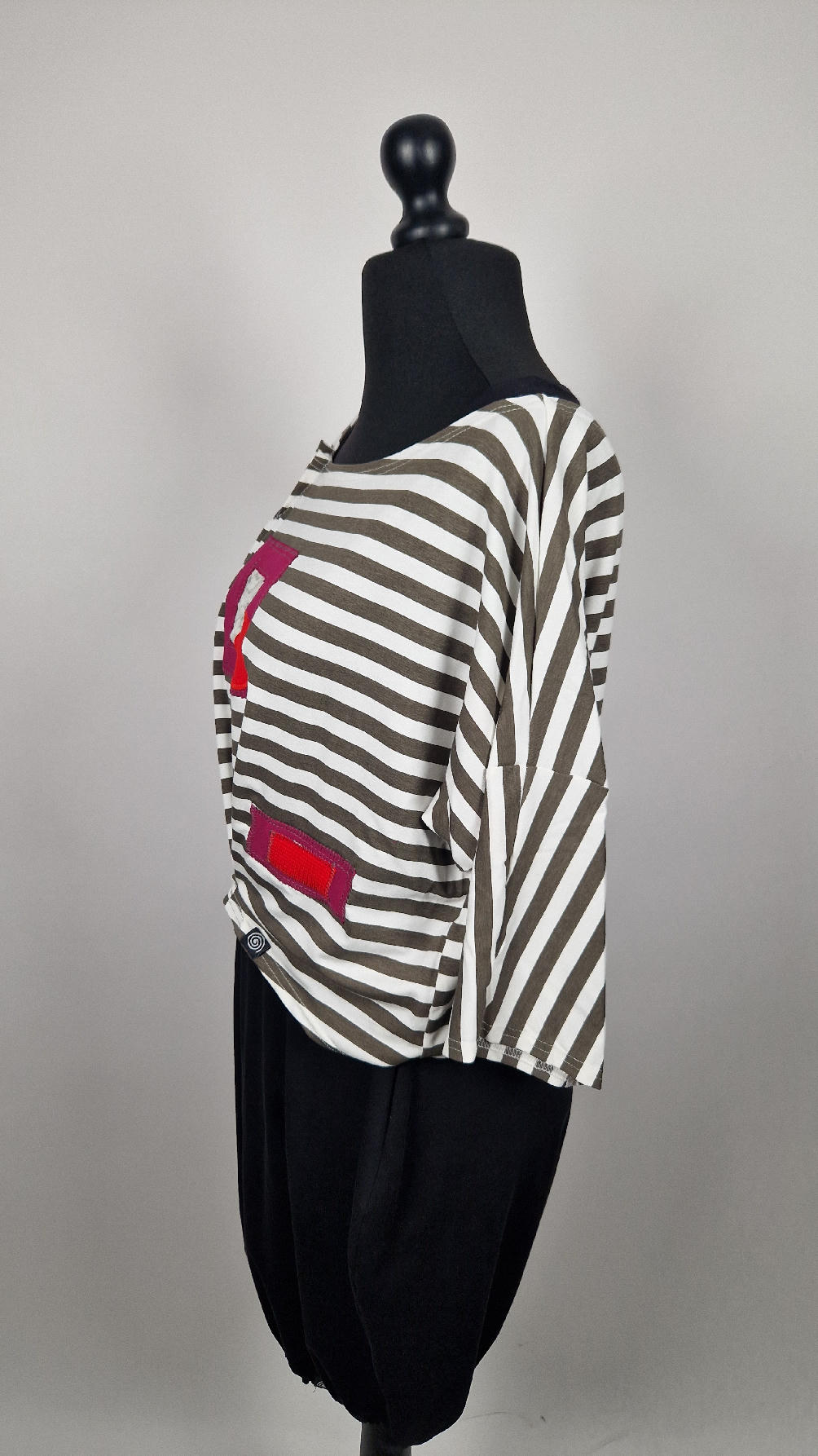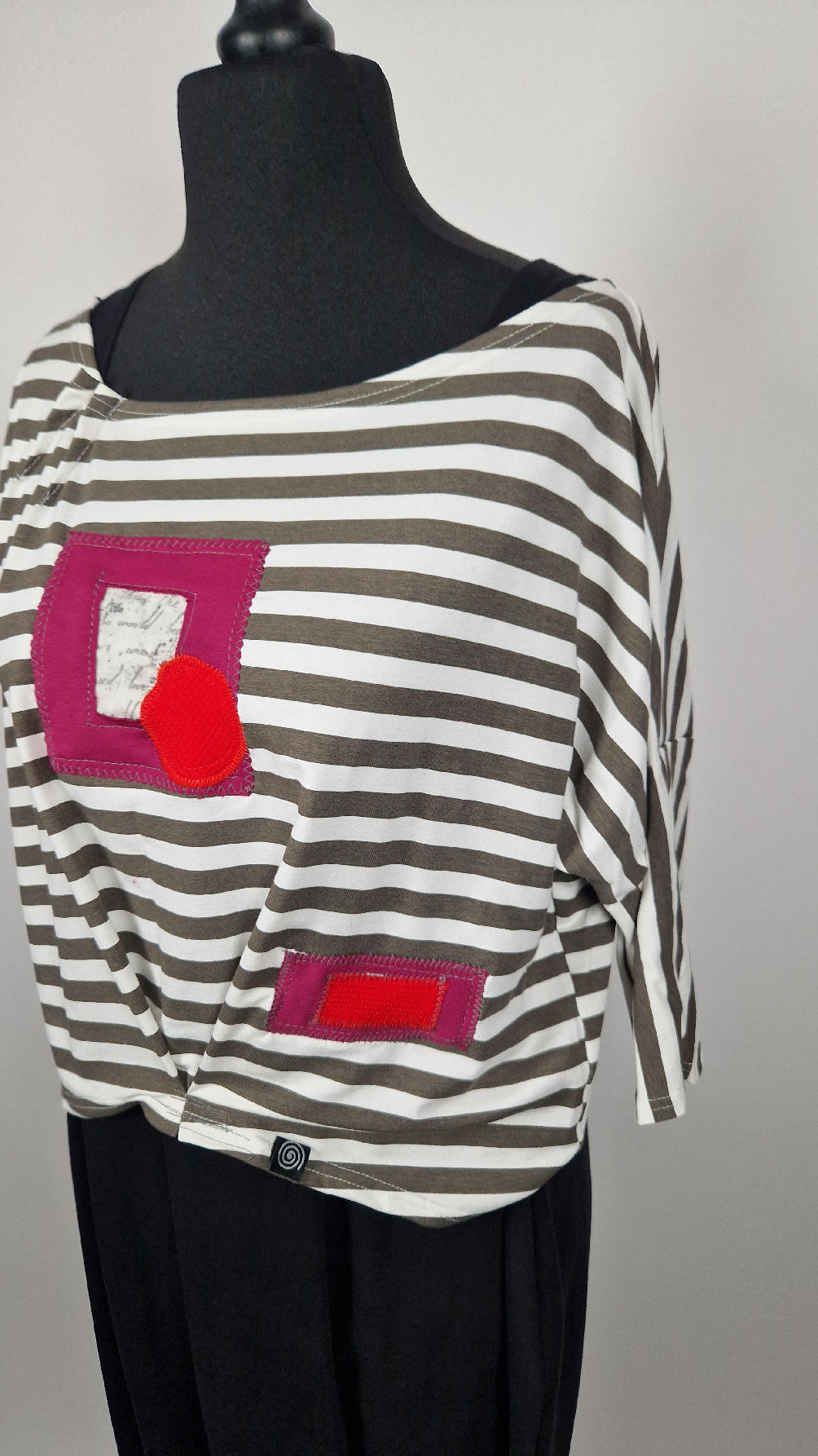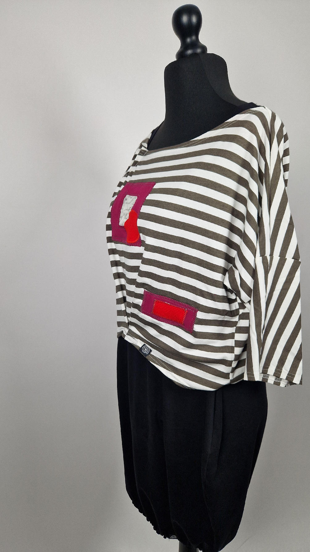 Krótka, lekka, miękka ….taka ,,luzacka”,  jedyna i niepowtarzalna bluzka w paski z niewielka, acz charakterną aplikacją..luźna w biuście bluzka typu NIETOPERZ, ale taki niewielki….bluzka uszyta z  wysokiej jakości bawełny typu jersey,  z rękawem 3/4 …  prosta, bez kieszeni – tak specjalnie, żeby nic nie odstawało  ale z dużym dekoltem  typu ,,łódka”, na tym dekolcie zrobiłam dwie zaszewki, tak dla bajeru i żeby lepiej się trzymała…  na dole też jest duża zaszewka z przodu …dekolt możesz opuścić na jedno ramię, lub nosić symetrycznie…świetnie pasuje do niej naszyjnik LA PERLA BIANCA