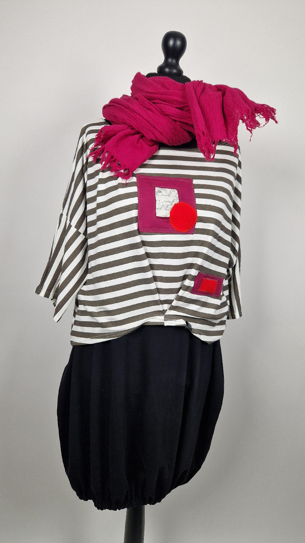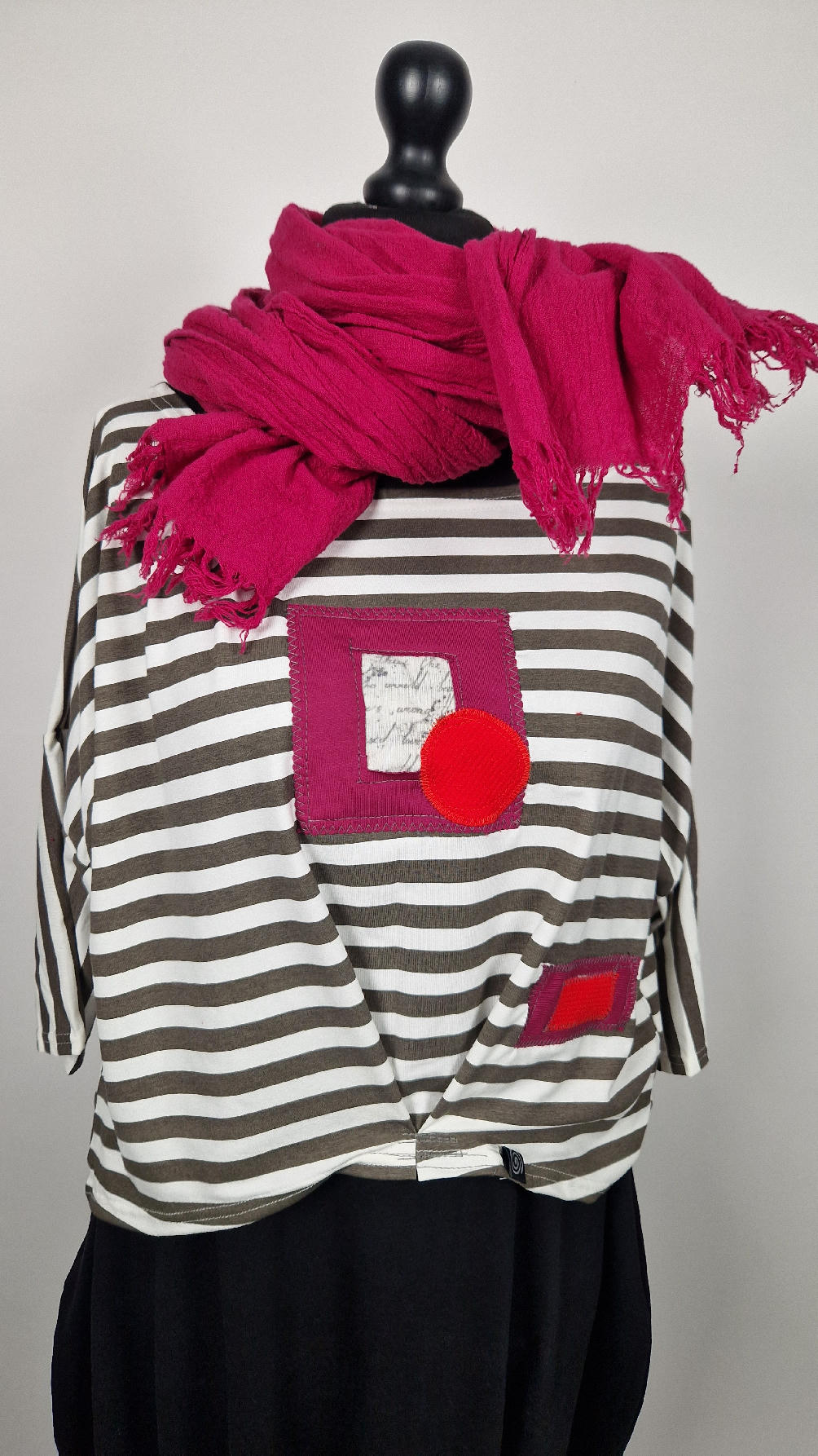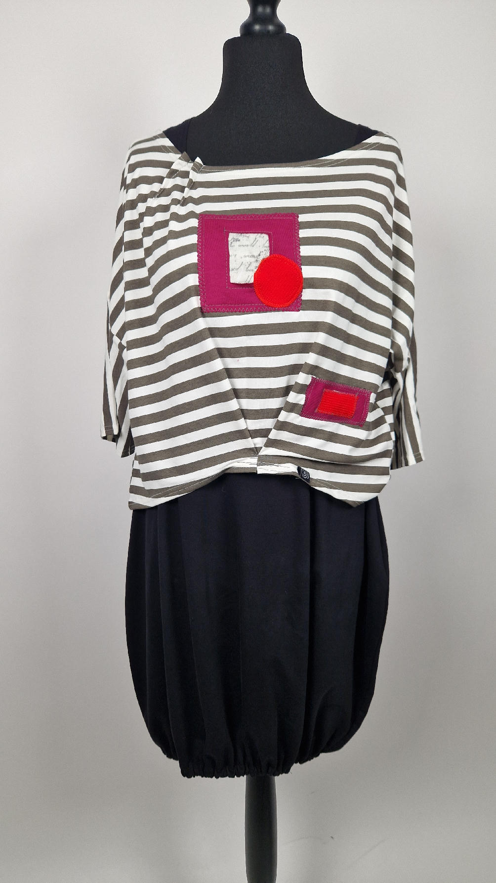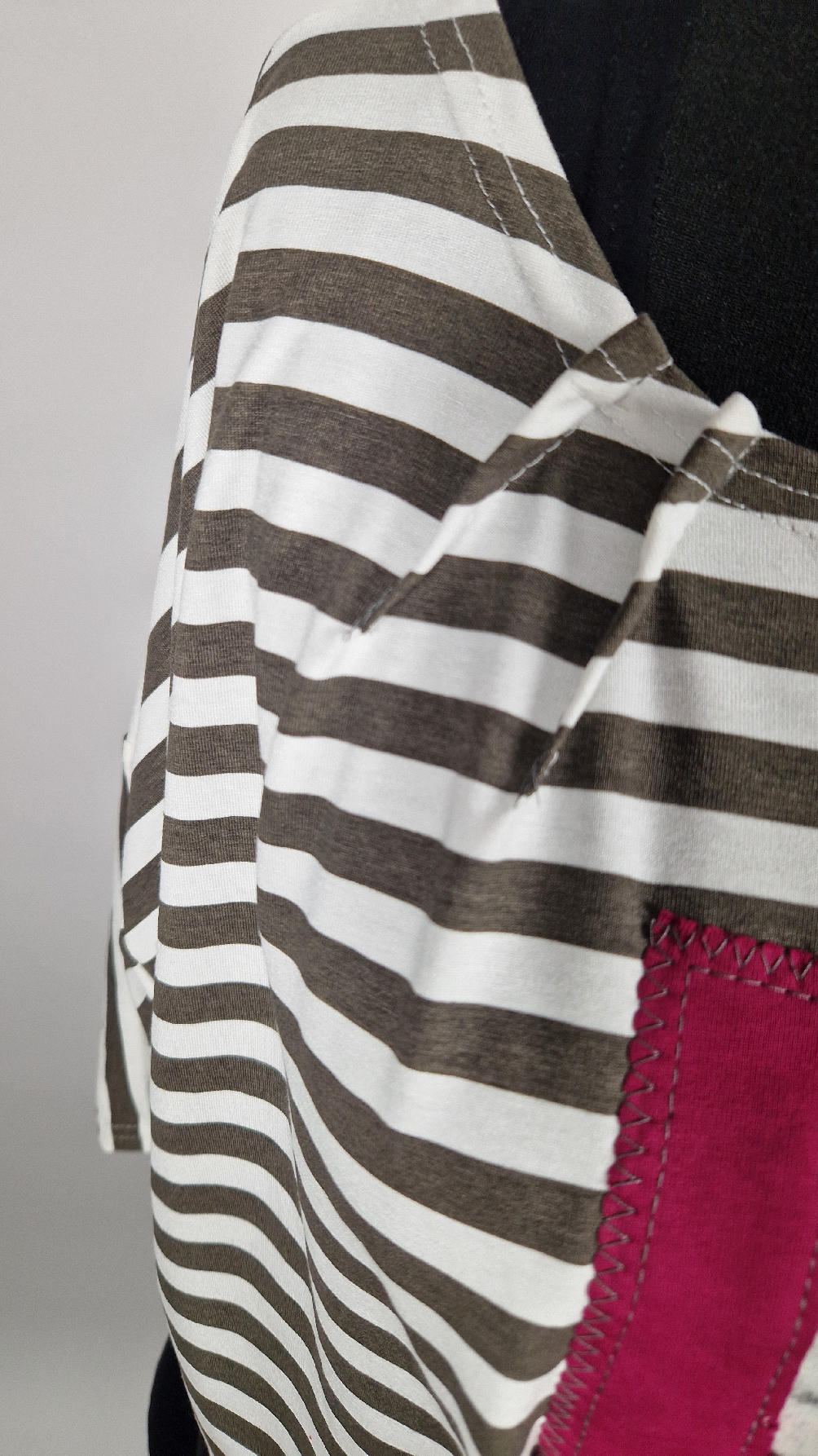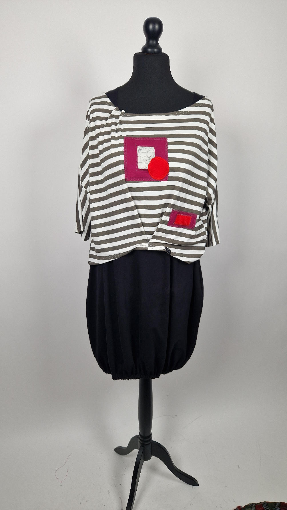 Krótka, lekka, miękka ….taka ,,luzacka”,  jedyna i niepowtarzalna bluzka w paski z niewielka, acz charakterną aplikacją..luźna w biuście bluzka typu NIETOPERZ, ale taki niewielki….bluzka uszyta z  wysokiej jakości bawełny typu jersey,  z rękawem 3/4 …  prosta, bez kieszeni – tak specjalnie, żeby nic nie odstawało  ale z dużym dekoltem  typu ,,łódka”, na tym dekolcie zrobiłam dwie zaszewki, tak dla bajeru i żeby lepiej się trzymała…  na dole też jest duża zaszewka z przodu …dekolt możesz opuścić na jedno ramię, lub nosić symetrycznie…świetnie pasuje do niej naszyjnik LA PERLA BIANCA