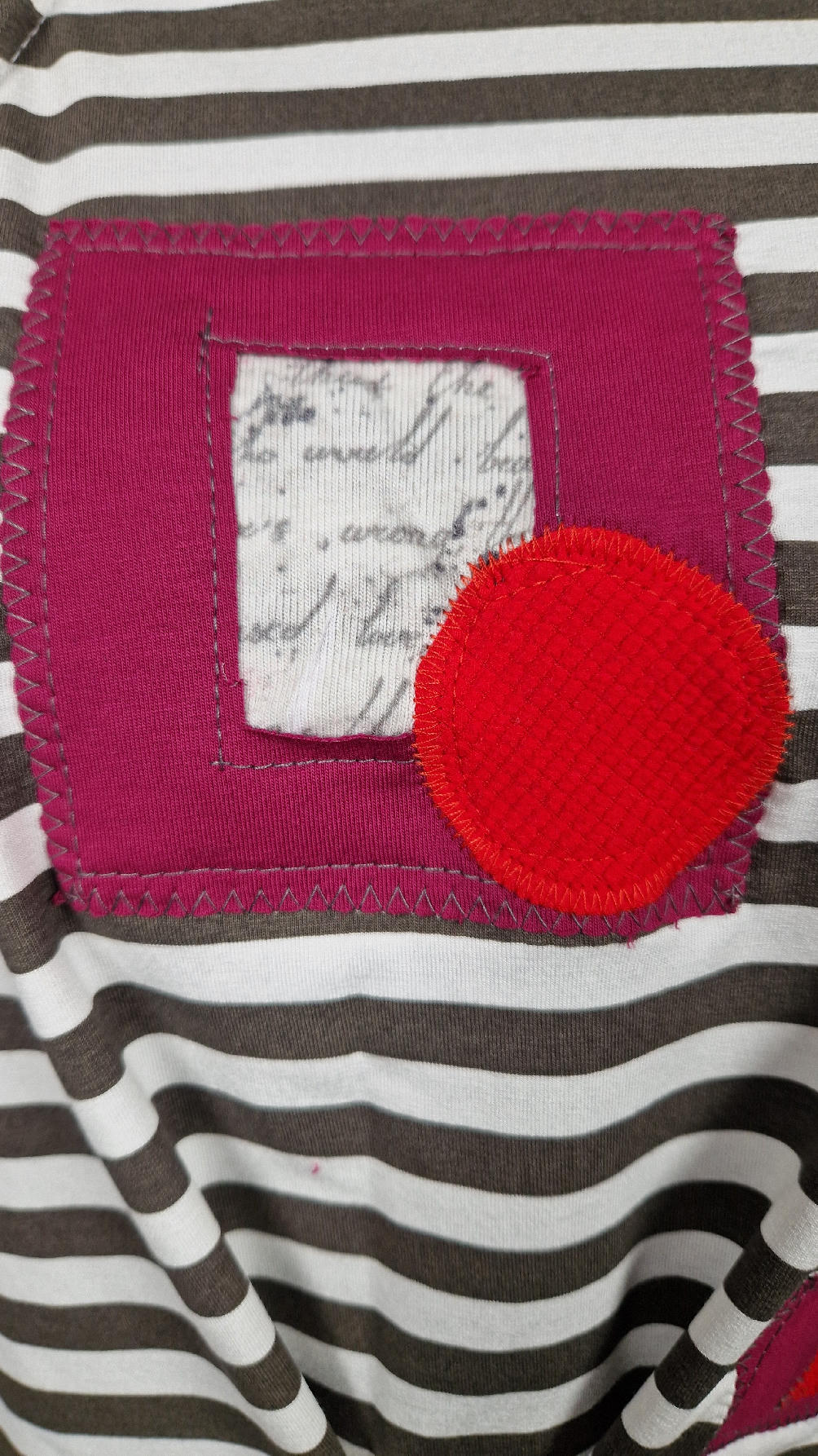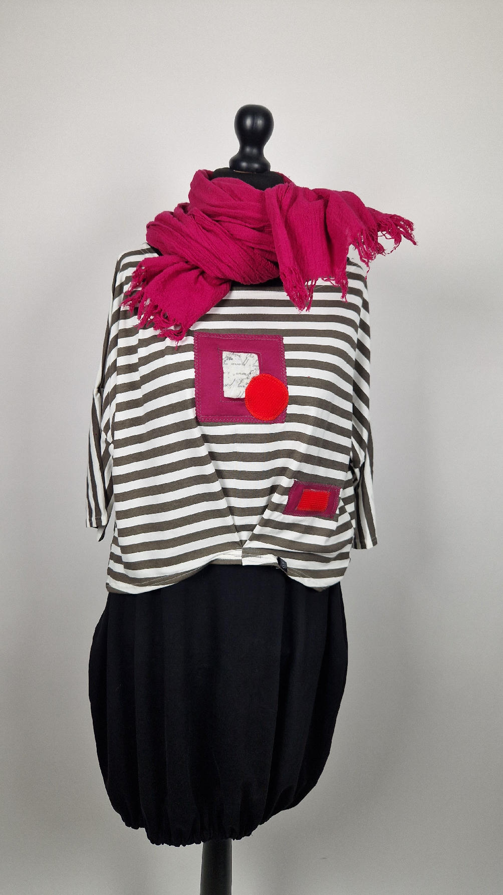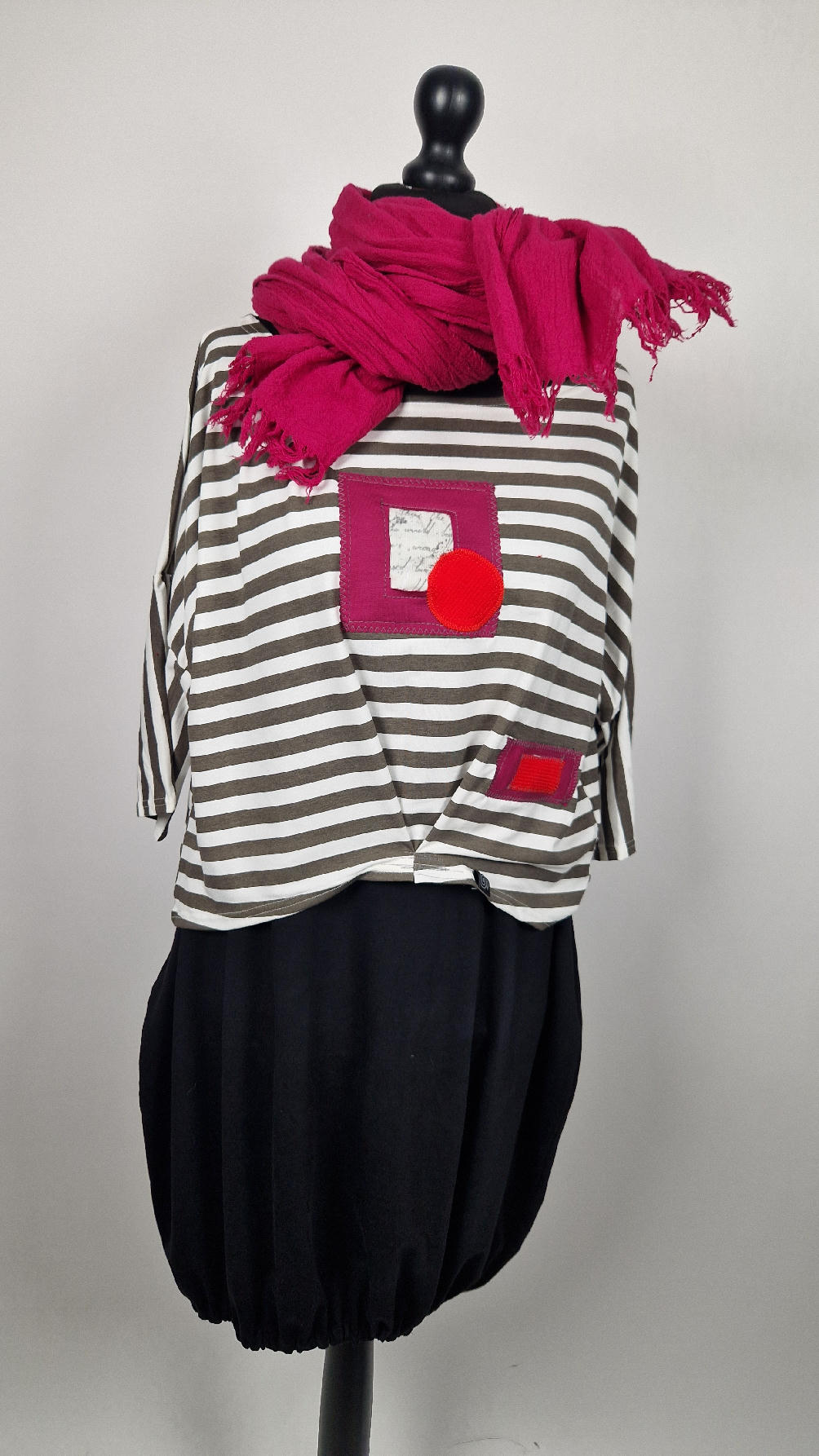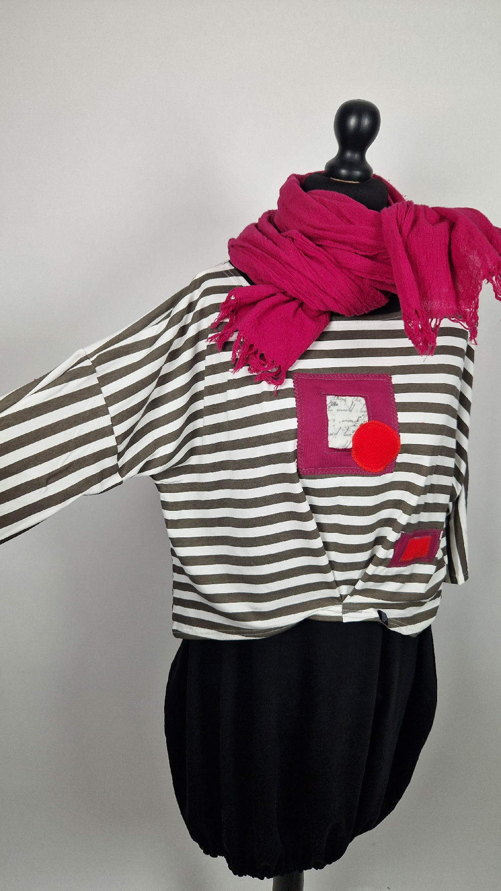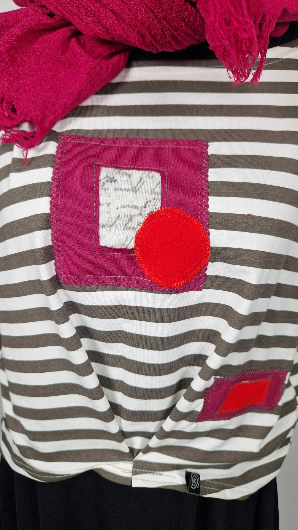 Krótka, lekka, miękka ….taka ,,luzacka”,  jedyna i niepowtarzalna bluzka w paski z niewielka, acz charakterną aplikacją..luźna w biuście bluzka typu NIETOPERZ, ale taki niewielki….bluzka uszyta z  wysokiej jakości bawełny typu jersey,  z rękawem 3/4 …  prosta, bez kieszeni – tak specjalnie, żeby nic nie odstawało  ale z dużym dekoltem  typu ,,łódka”, na tym dekolcie zrobiłam dwie zaszewki, tak dla bajeru i żeby lepiej się trzymała…  na dole też jest duża zaszewka z przodu …dekolt możesz opuścić na jedno ramię, lub nosić symetrycznie…świetnie pasuje do niej naszyjnik LA PERLA BIANCA