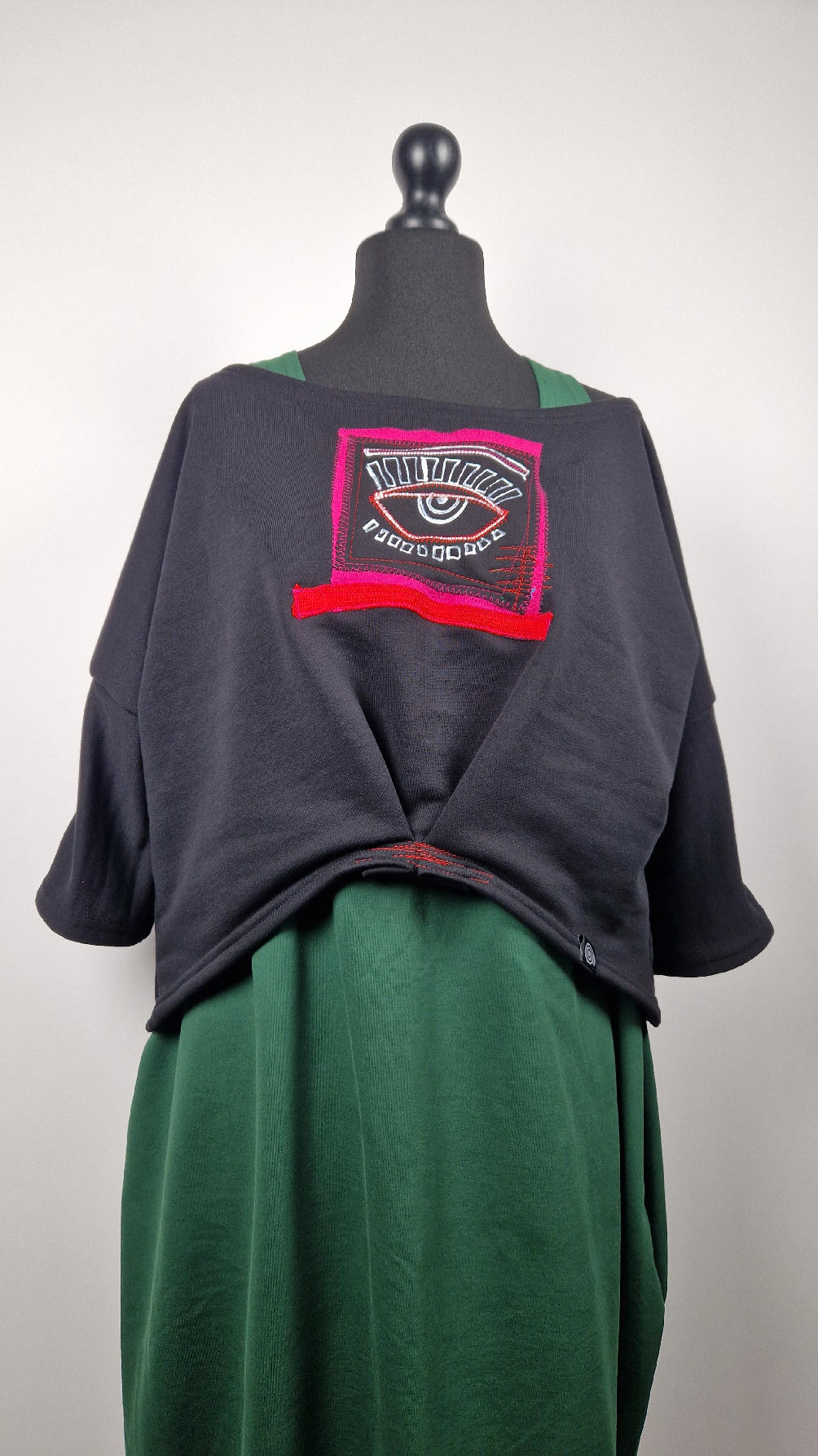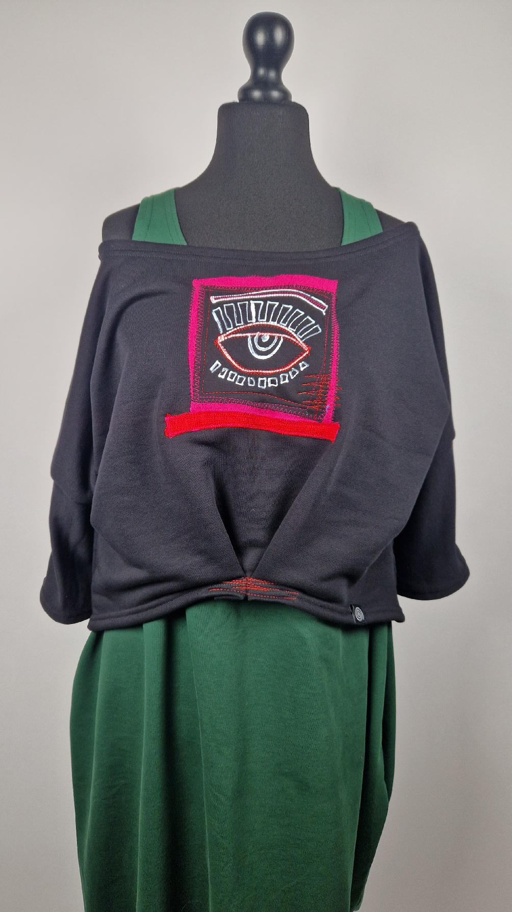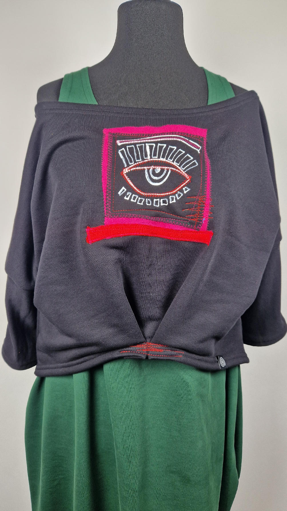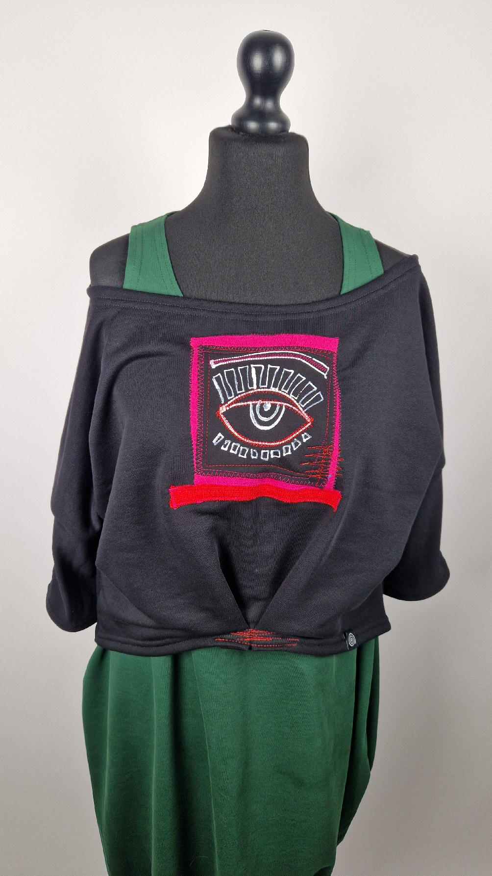Krótka, ręcznie malowana i poprzeszywana kontrastowymi nitkami, czarna, luźna w biuście bluzka typu NIETOPERZ, ale taki niewielki…namalowane ręcznie przeze mnie oko naszyte na madżentę, … do tego mocna pomarańcza… i przeszycia. Bluzka uszyta z wysokiej jakości grubej bawełny z pętelką, z rękawami 3/4, ale możesz do niej założyć zarękawki w paski lub różowe…prosta, bez kieszeni – tak specjalnie, żeby nic nie odstawało ale z dużym dekoltem typu ,,łódka”, który możesz opuścić na jedno ramię, lub nosić symetrycznie…Każdy,,obrazek” jest namalowany ręcznie przeze mnie, na czarnej bawełnie , następnie przyszyty do bluzki