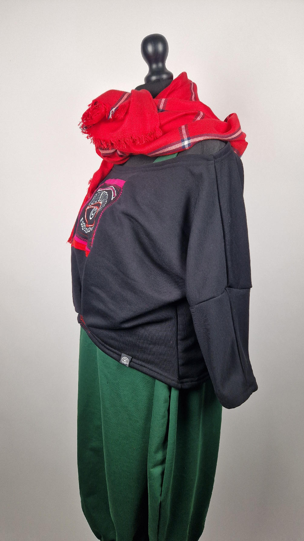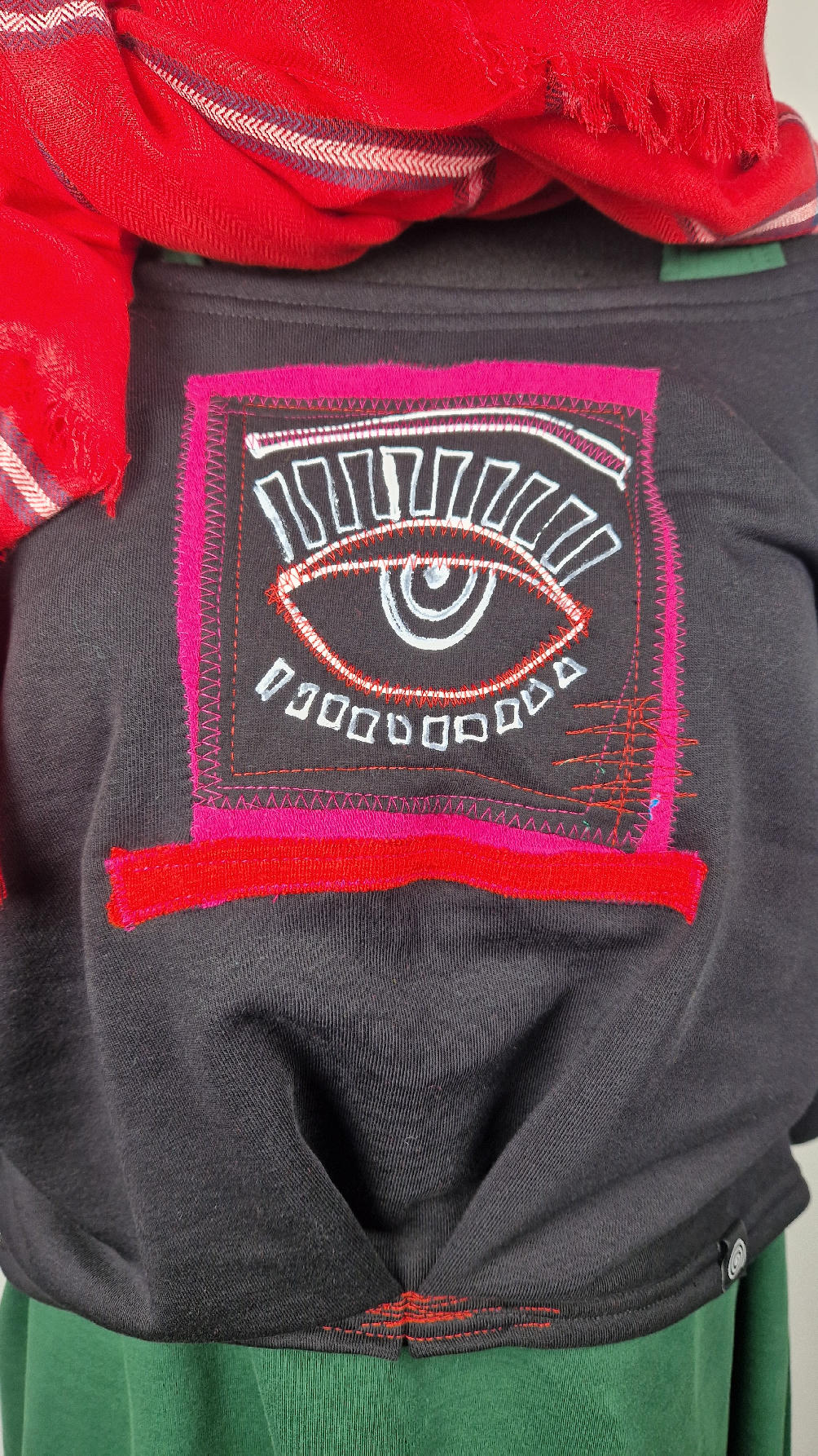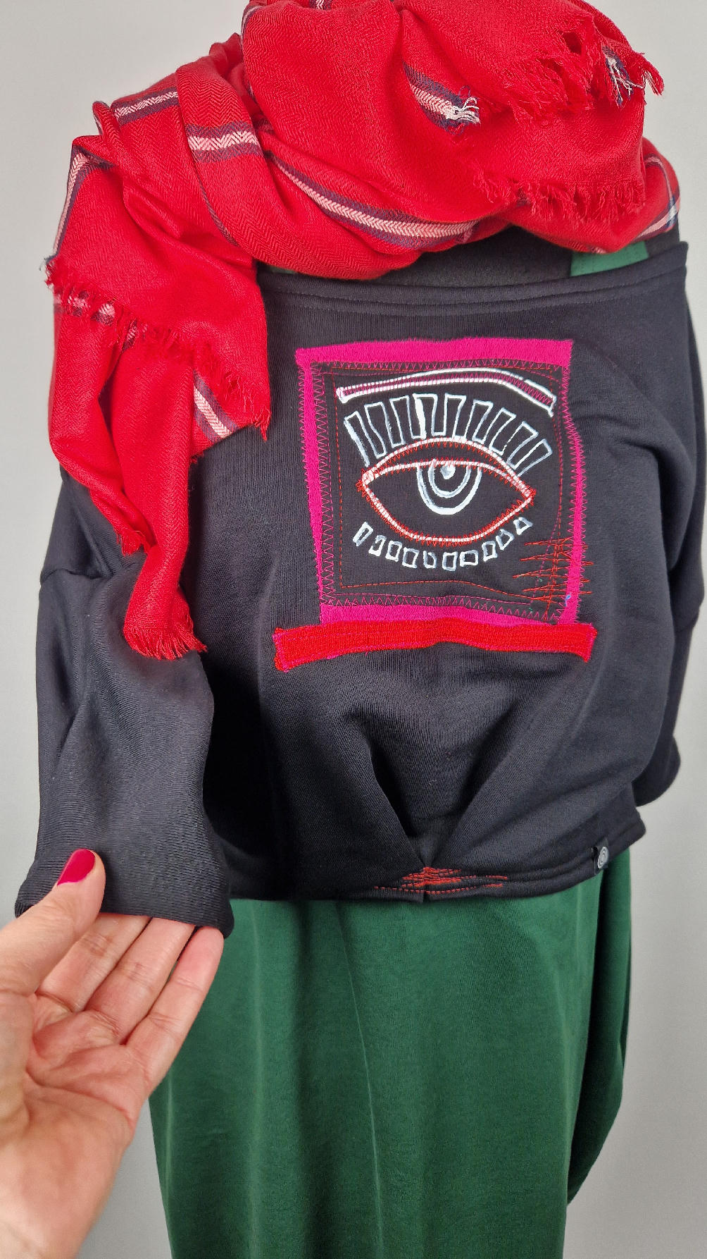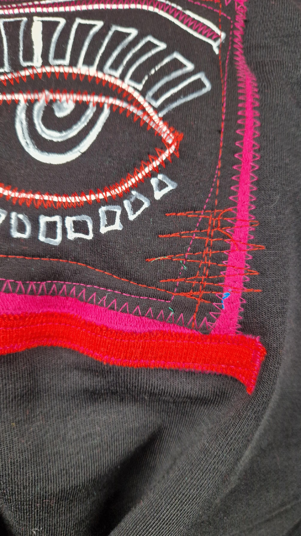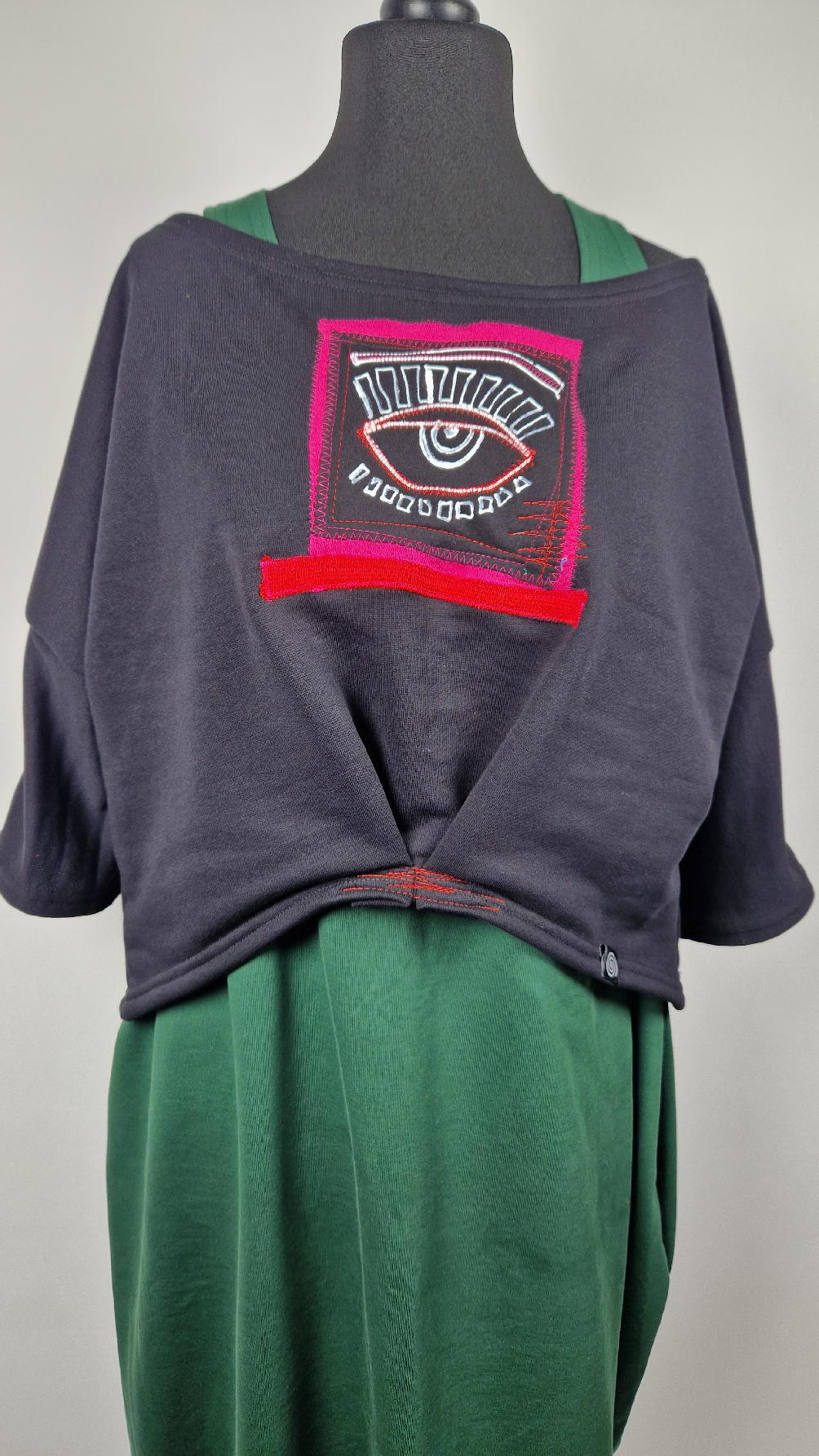 Krótka, ręcznie malowana i poprzeszywana kontrastowymi nitkami, czarna, luźna w biuście bluzka typu NIETOPERZ, ale taki niewielki…namalowane ręcznie przeze mnie oko naszyte na madżentę, … do tego mocna pomarańcza… i przeszycia. Bluzka uszyta z wysokiej jakości grubej bawełny z pętelką, z rękawami 3/4, ale możesz do niej założyć zarękawki w paski lub różowe…prosta, bez kieszeni – tak specjalnie, żeby nic nie odstawało ale z dużym dekoltem typu ,,łódka”, który możesz opuścić na jedno ramię, lub nosić symetrycznie…Każdy,,obrazek” jest namalowany ręcznie przeze mnie, na czarnej bawełnie , następnie przyszyty do bluzki