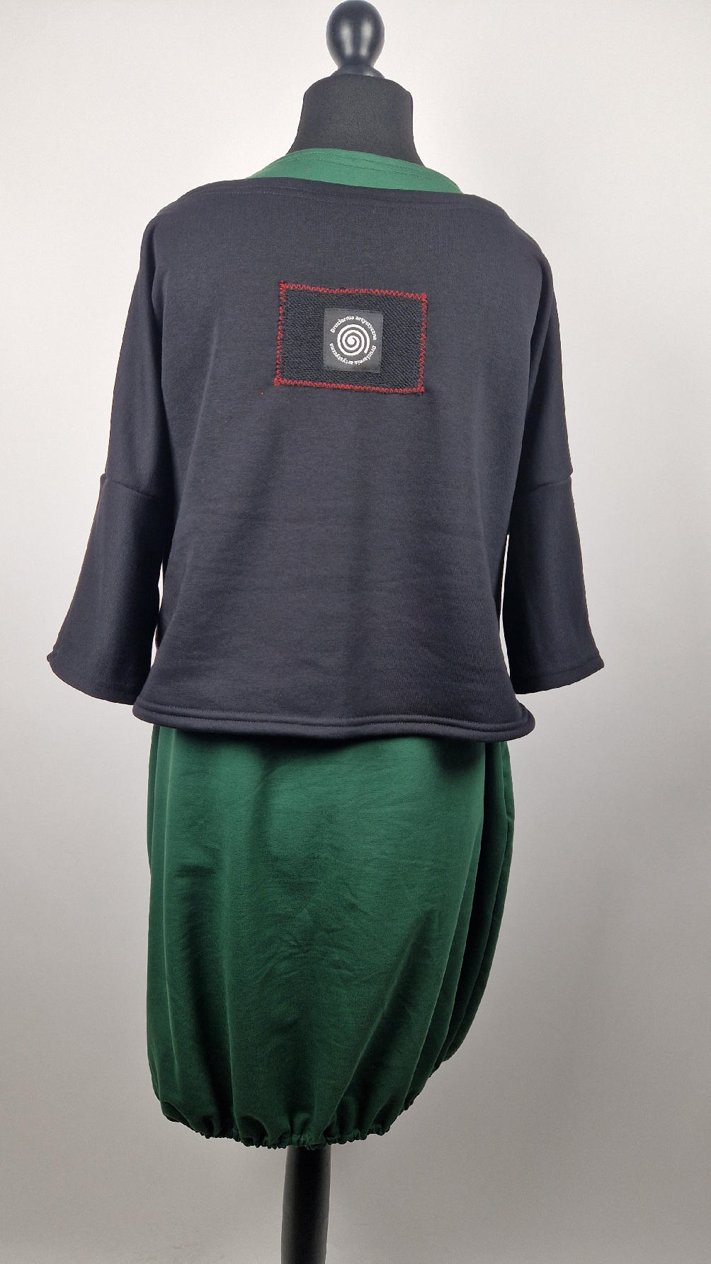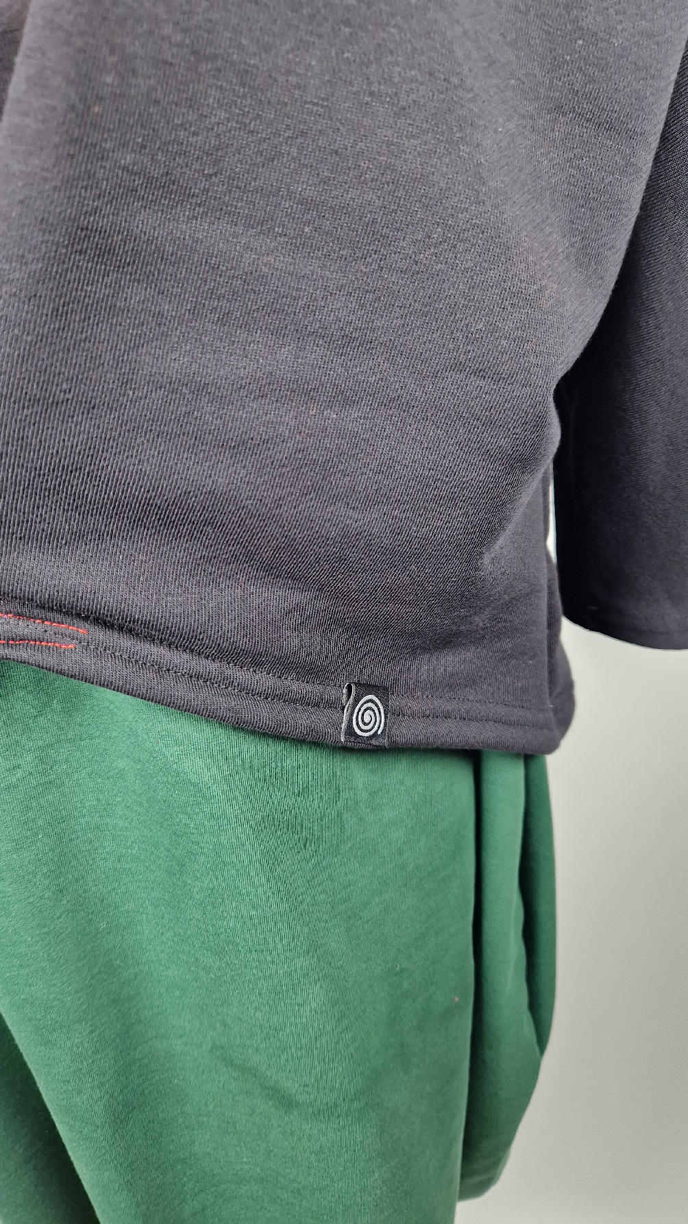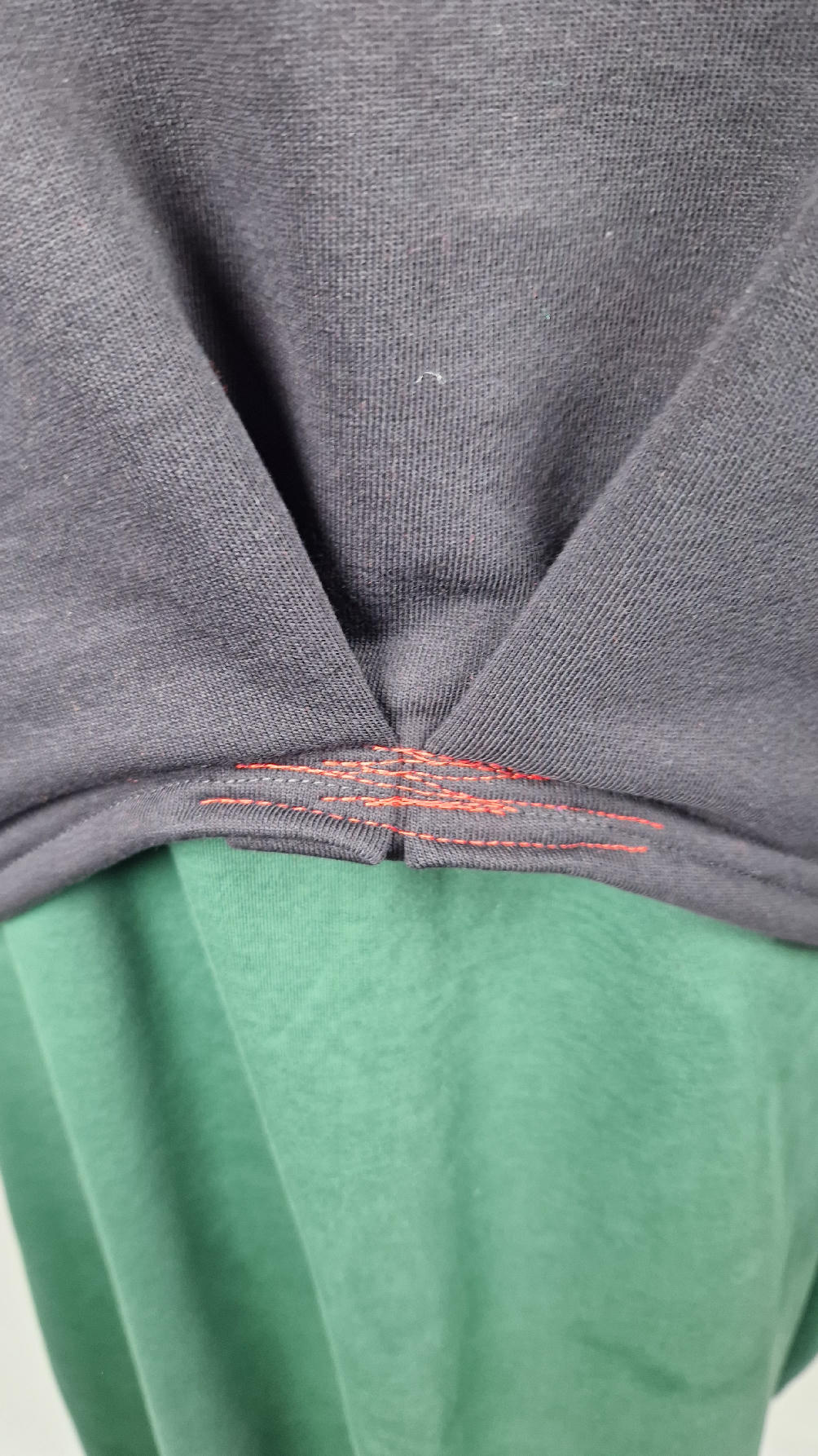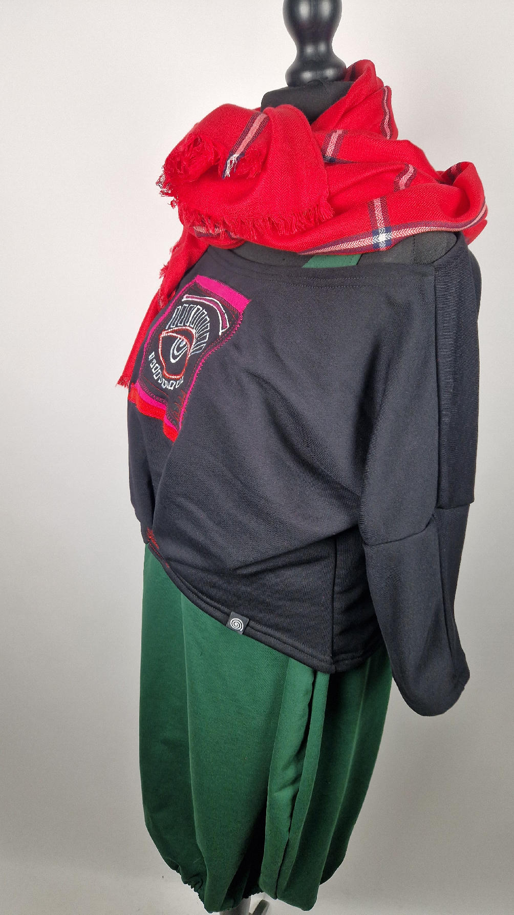 Krótka, ręcznie malowana i poprzeszywana kontrastowymi nitkami, czarna, luźna w biuście bluzka typu NIETOPERZ, ale taki niewielki…namalowane ręcznie przeze mnie oko naszyte na madżentę, … do tego mocna pomarańcza… i przeszycia. Bluzka uszyta z wysokiej jakości grubej bawełny z pętelką, z rękawami 3/4, ale możesz do niej założyć zarękawki w paski lub różowe…prosta, bez kieszeni – tak specjalnie, żeby nic nie odstawało ale z dużym dekoltem typu ,,łódka”, który możesz opuścić na jedno ramię, lub nosić symetrycznie…Każdy,,obrazek” jest namalowany ręcznie przeze mnie, na czarnej bawełnie , następnie przyszyty do bluzki