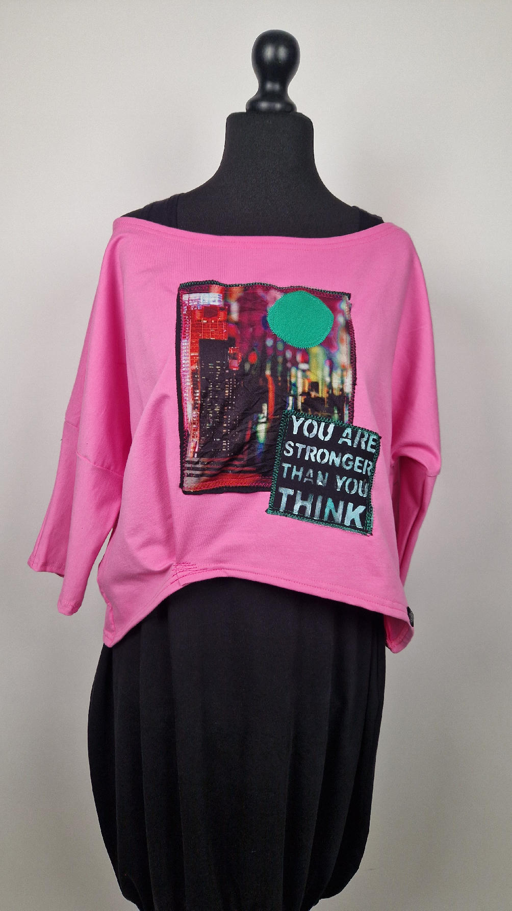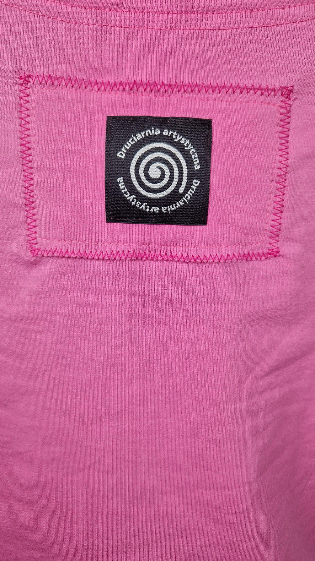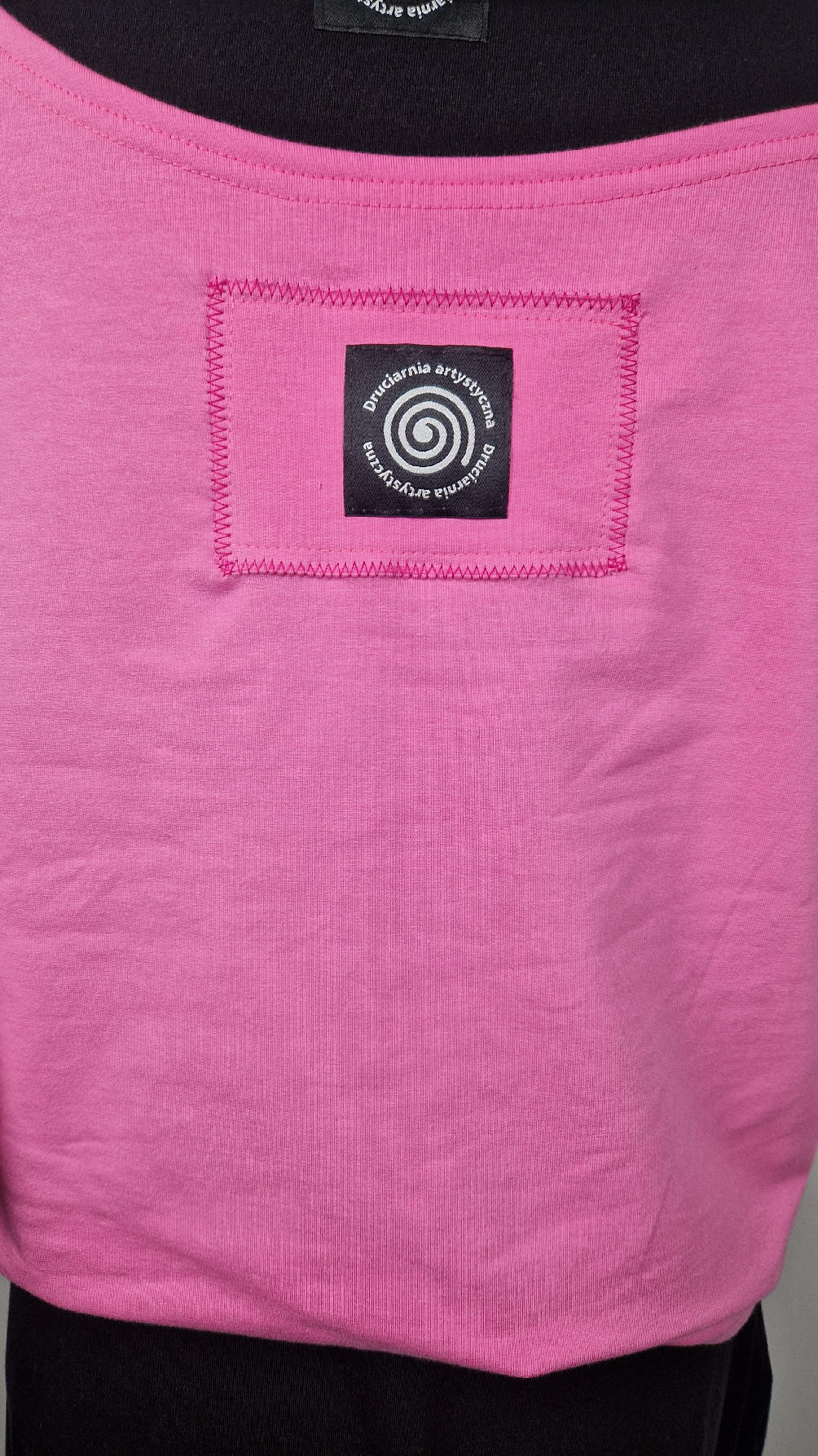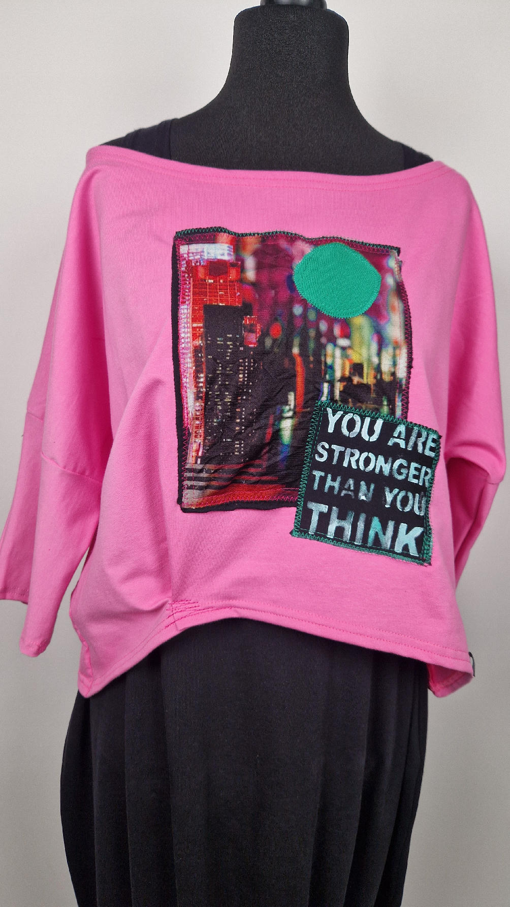 Krótka, megaróżowa , malinowa bluzka z dużą aplikacją z przodu, z Manhattanem, napisami i zieloną kropą…luzacka”, luźna w biuście bluzka typu NIETOPERZ, ale taki niewielki….bluzka uszyta z wysokiej jakości bawełny , … prosta, bez kieszeni – tak specjalnie, żeby nic nie odstawało , ale z dużym dekoltem typu ,,łódka”, który możesz opuścić na jedno ramię, lub nosić symetrycznie…