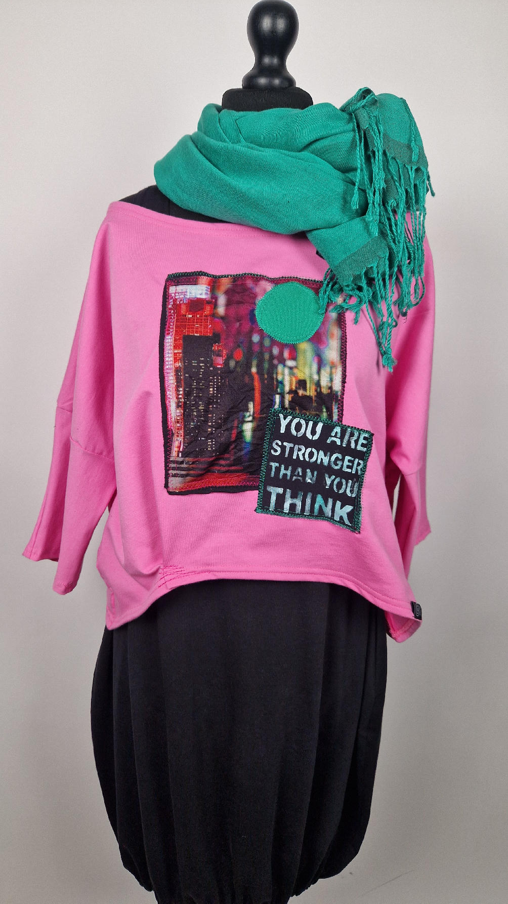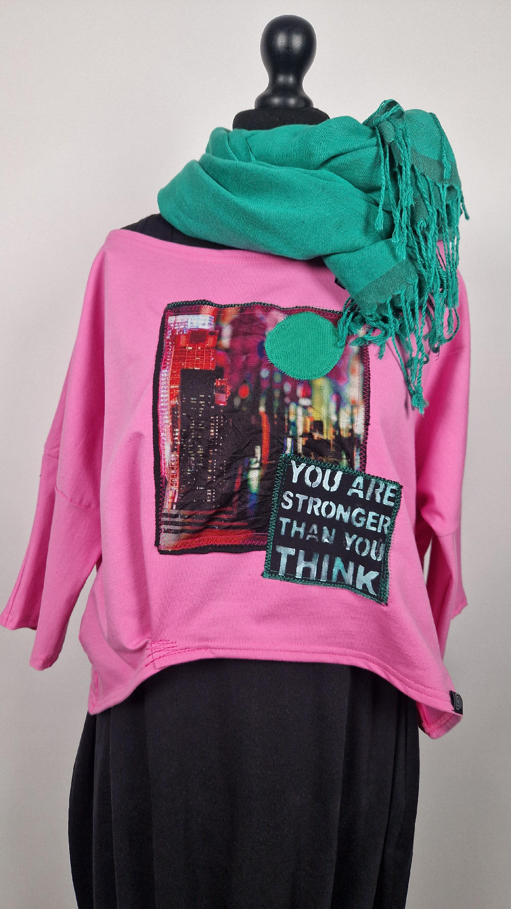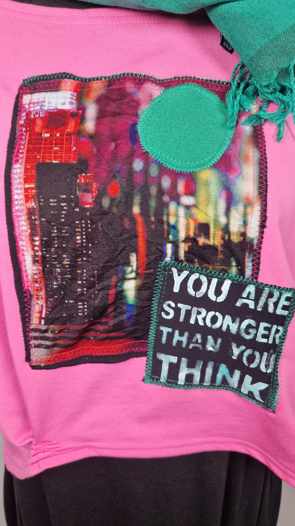Krótka, megaróżowa , malinowa bluzka z dużą aplikacją z przodu, z Manhattanem, napisami i zieloną kropą…luzacka”, luźna w biuście bluzka typu NIETOPERZ, ale taki niewielki….bluzka uszyta z wysokiej jakości bawełny , … prosta, bez kieszeni – tak specjalnie, żeby nic nie odstawało , ale z dużym dekoltem typu ,,łódka”, który możesz opuścić na jedno ramię, lub nosić symetrycznie…