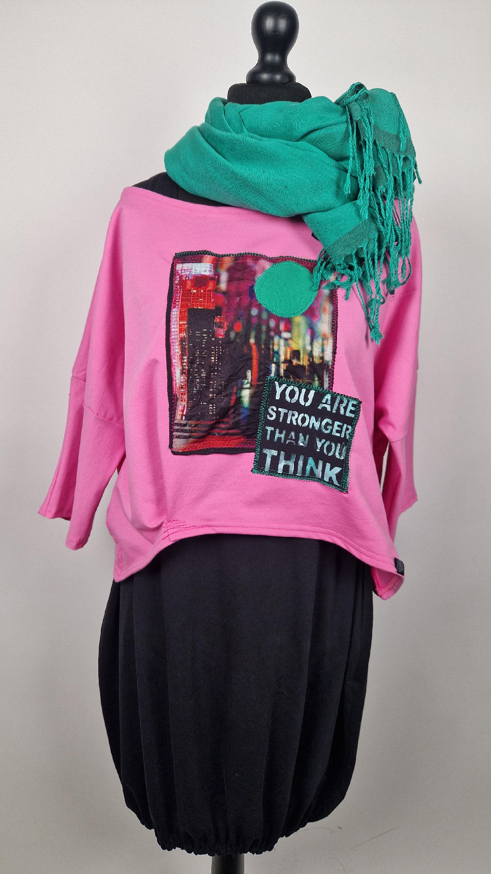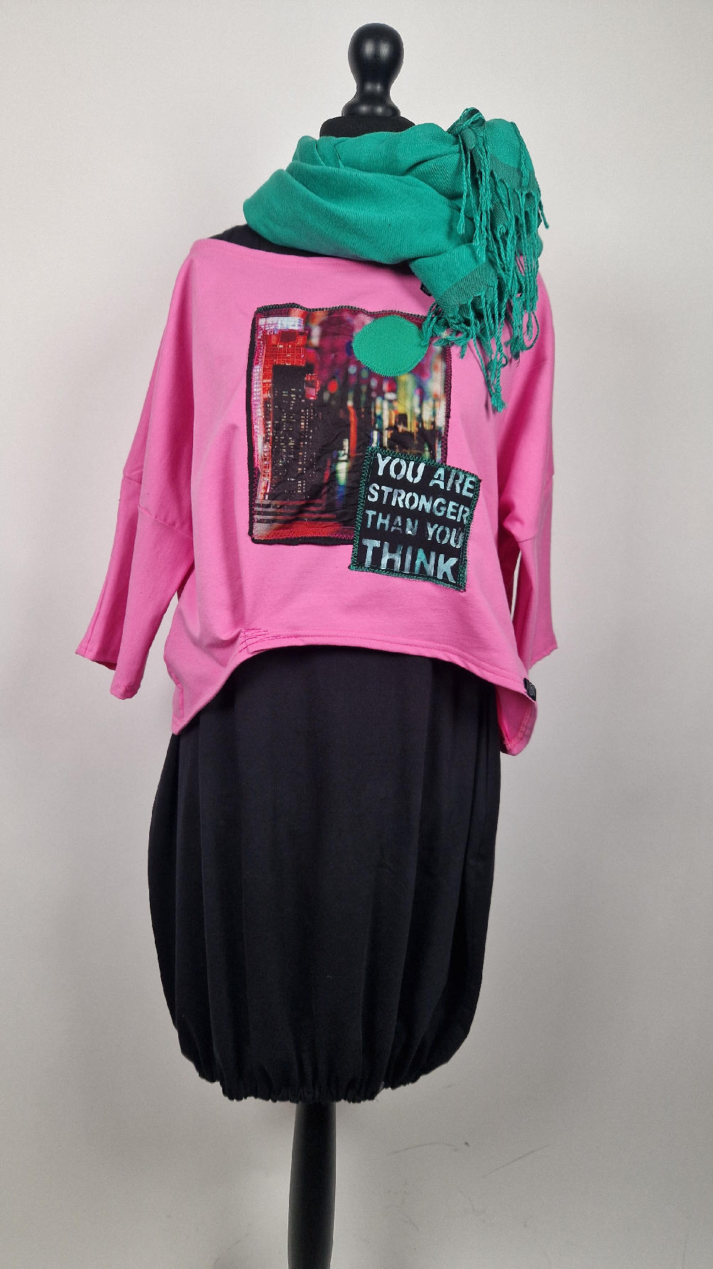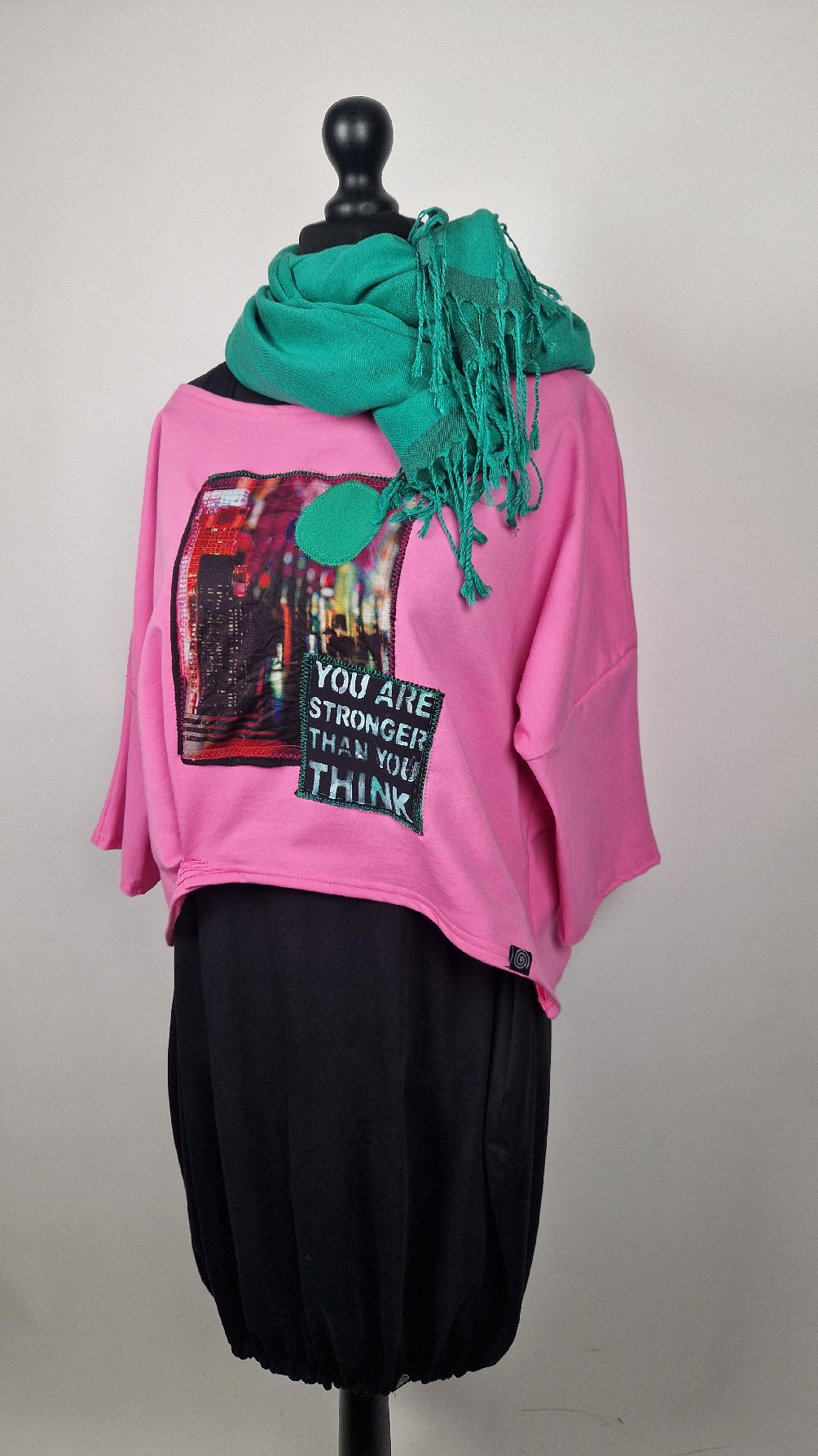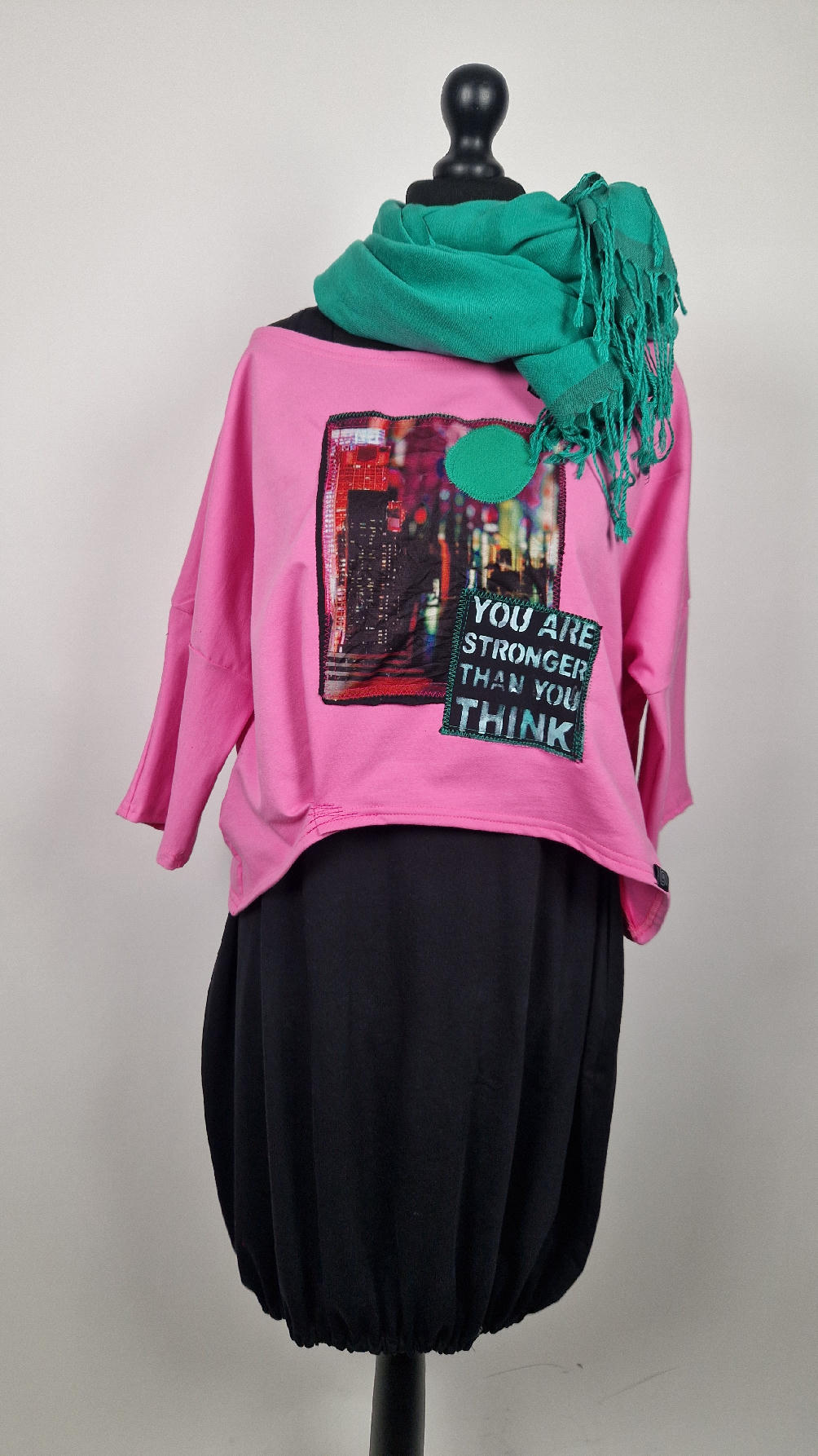 Krótka, megaróżowa , malinowa bluzka z dużą aplikacją z przodu, z Manhattanem, napisami i zieloną kropą…luzacka”, luźna w biuście bluzka typu NIETOPERZ, ale taki niewielki….bluzka uszyta z wysokiej jakości bawełny , … prosta, bez kieszeni – tak specjalnie, żeby nic nie odstawało , ale z dużym dekoltem typu ,,łódka”, który możesz opuścić na jedno ramię, lub nosić symetrycznie…