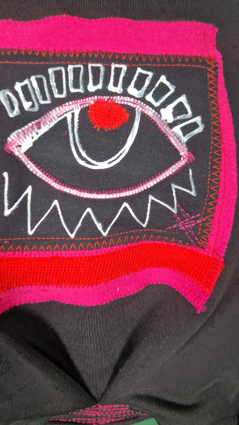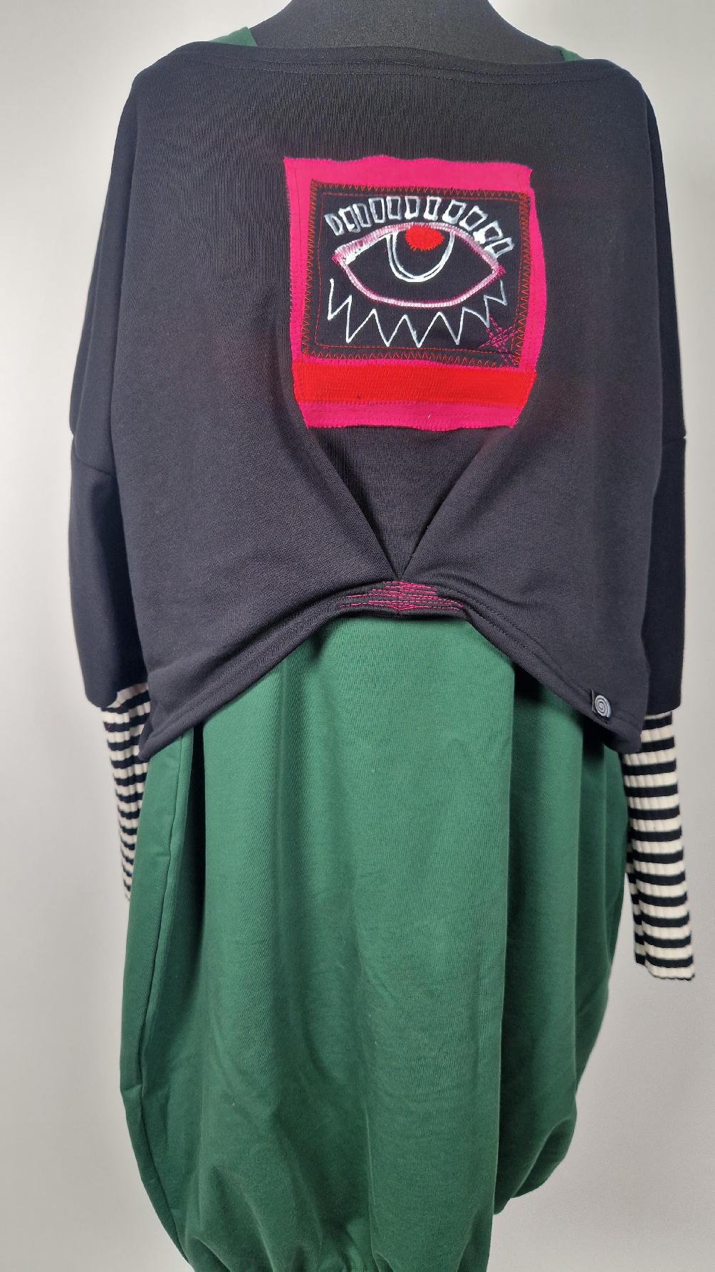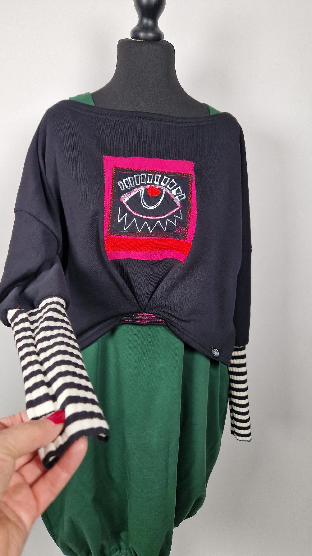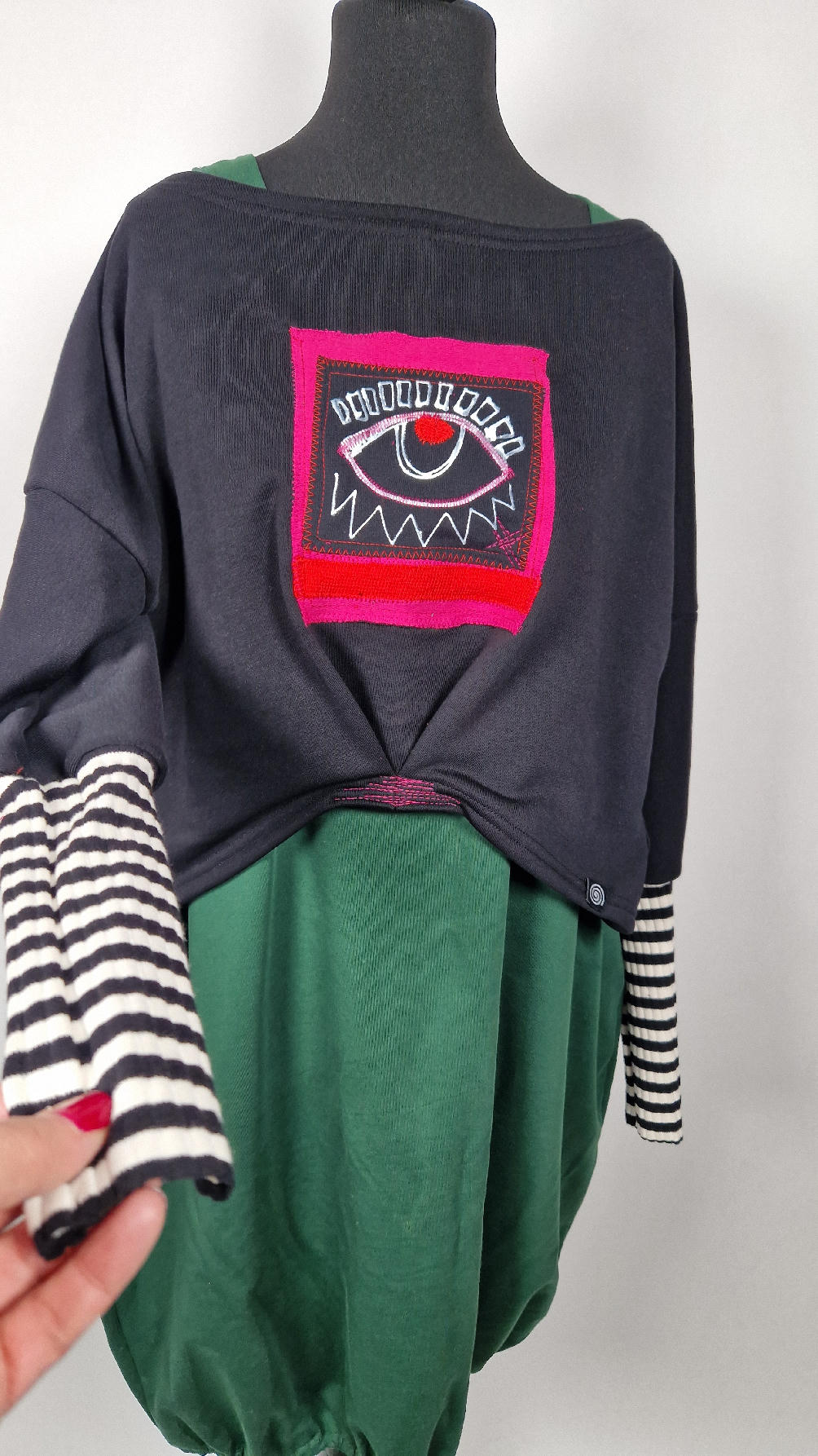 Krótka, śliczna, idealna, ręcznie malowana i poprzeszywana kontrastowymi nitkami, czarna, luźna w biuście bluzka typu NIETOPERZ, ale taki niewielki…namalowane ręcznie przeze mnie oko naszyte na madżentę, … do tego mocna pomarańcza… i przeszycia. Bluzka uszyta z wysokiej jakości grubej bawełny z pętelką, mankiety w paski ..prosta, bez kieszeni – tak specjalnie, żeby nic nie odstawało ale z dużym dekoltem typu ,,łódka”, który możesz opuścić na jedno ramię, lub nosić symetrycznie…Każdy,,obrazek” jest namalowany ręcznie przeze mnie, na czarnej bawełnie , następnie przyszyty do bluzki