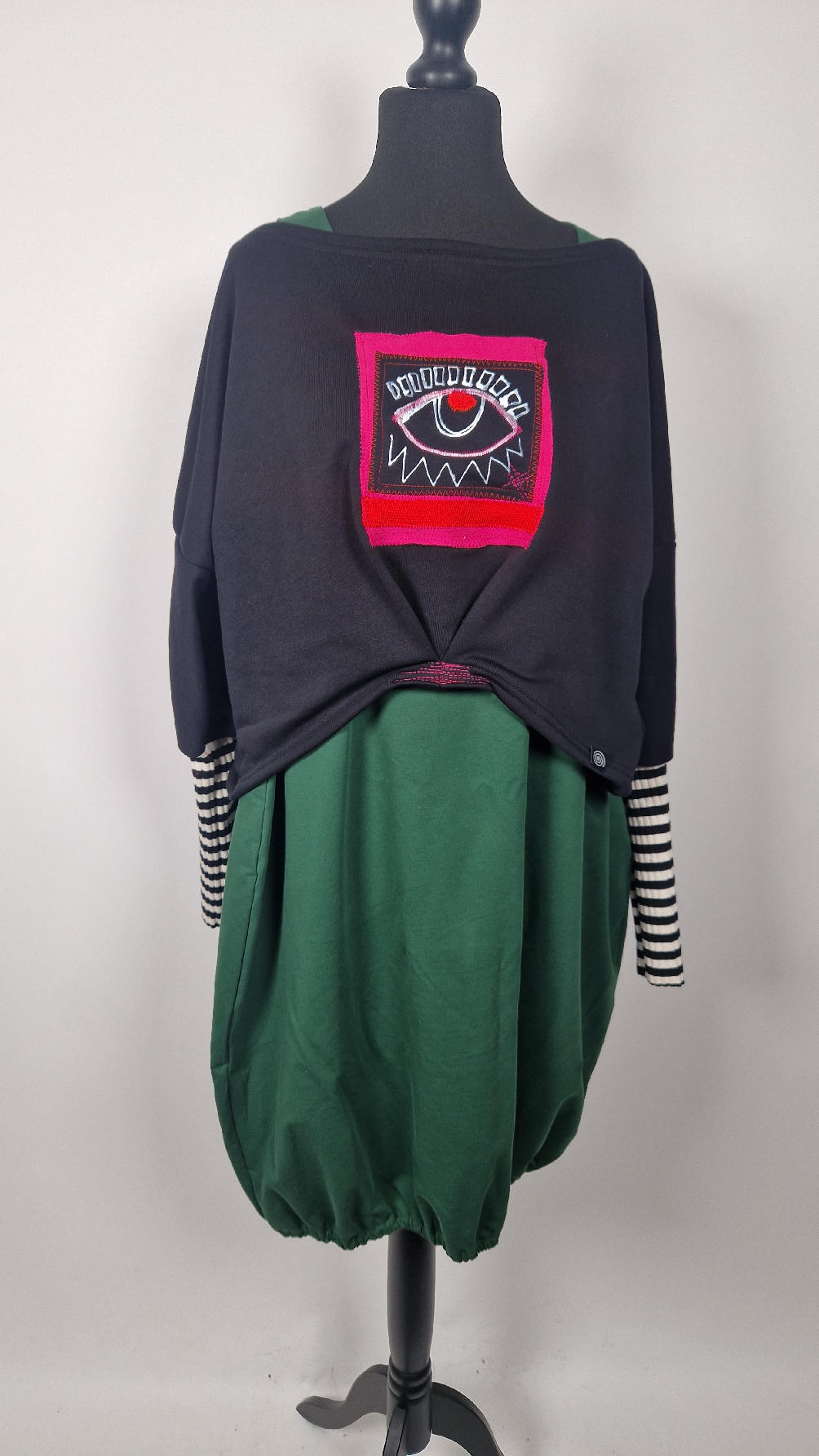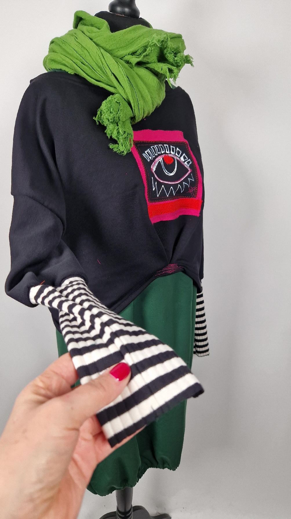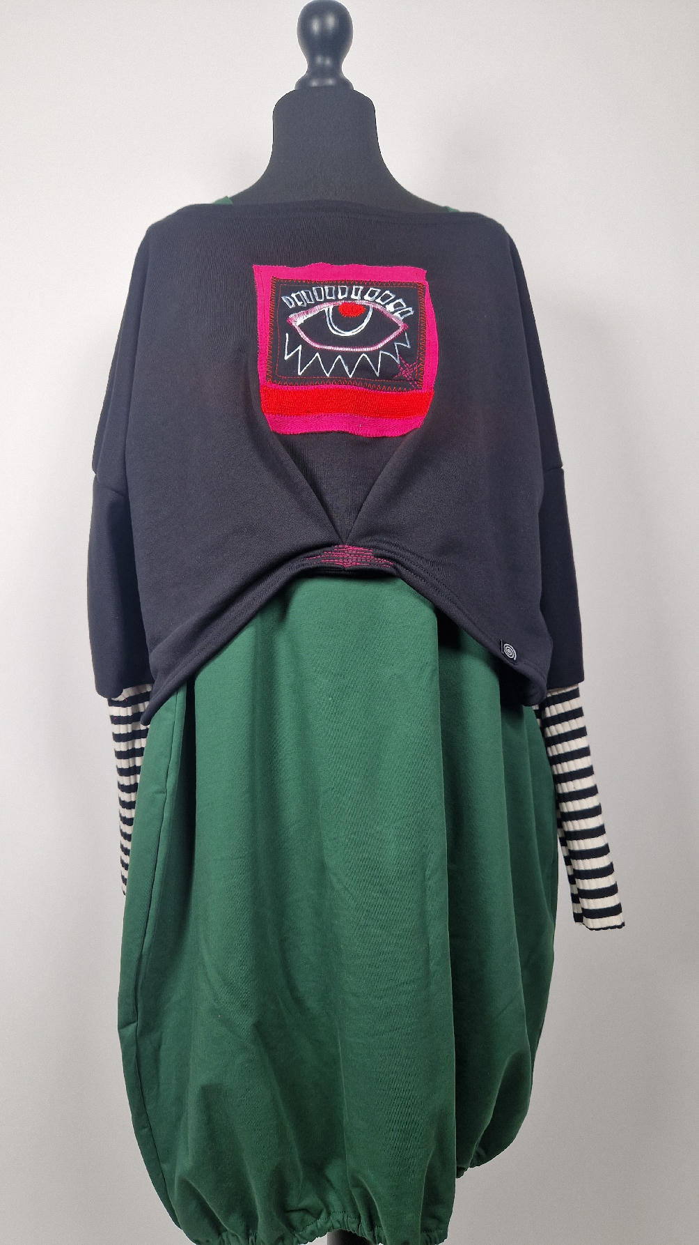 Krótka, śliczna, idealna, ręcznie malowana i poprzeszywana kontrastowymi nitkami, czarna, luźna w biuście bluzka typu NIETOPERZ, ale taki niewielki…namalowane ręcznie przeze mnie oko naszyte na madżentę, … do tego mocna pomarańcza… i przeszycia. Bluzka uszyta z wysokiej jakości grubej bawełny z pętelką, mankiety w paski ..prosta, bez kieszeni – tak specjalnie, żeby nic nie odstawało ale z dużym dekoltem typu ,,łódka”, który możesz opuścić na jedno ramię, lub nosić symetrycznie…Każdy,,obrazek” jest namalowany ręcznie przeze mnie, na czarnej bawełnie , następnie przyszyty do bluzki