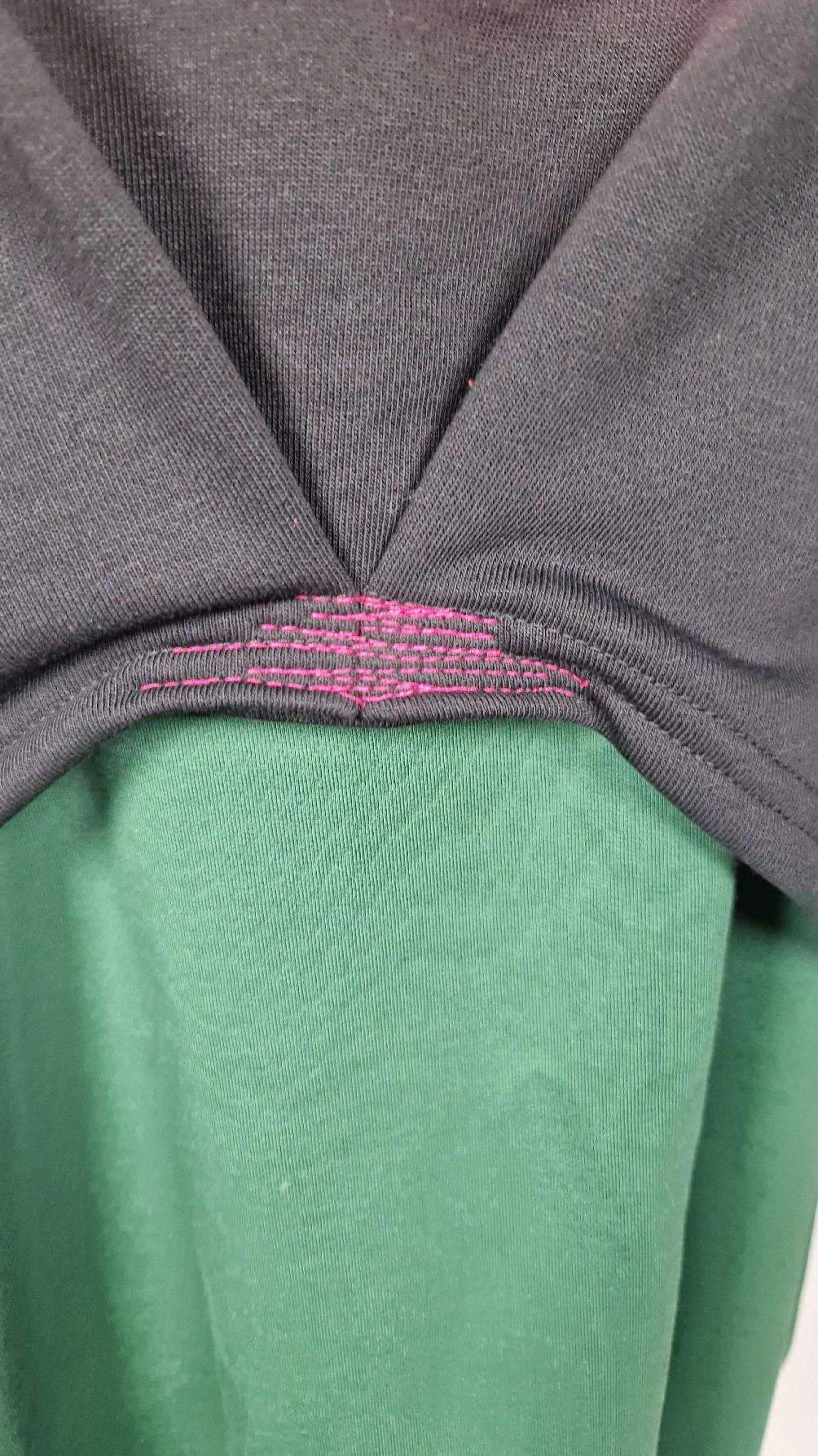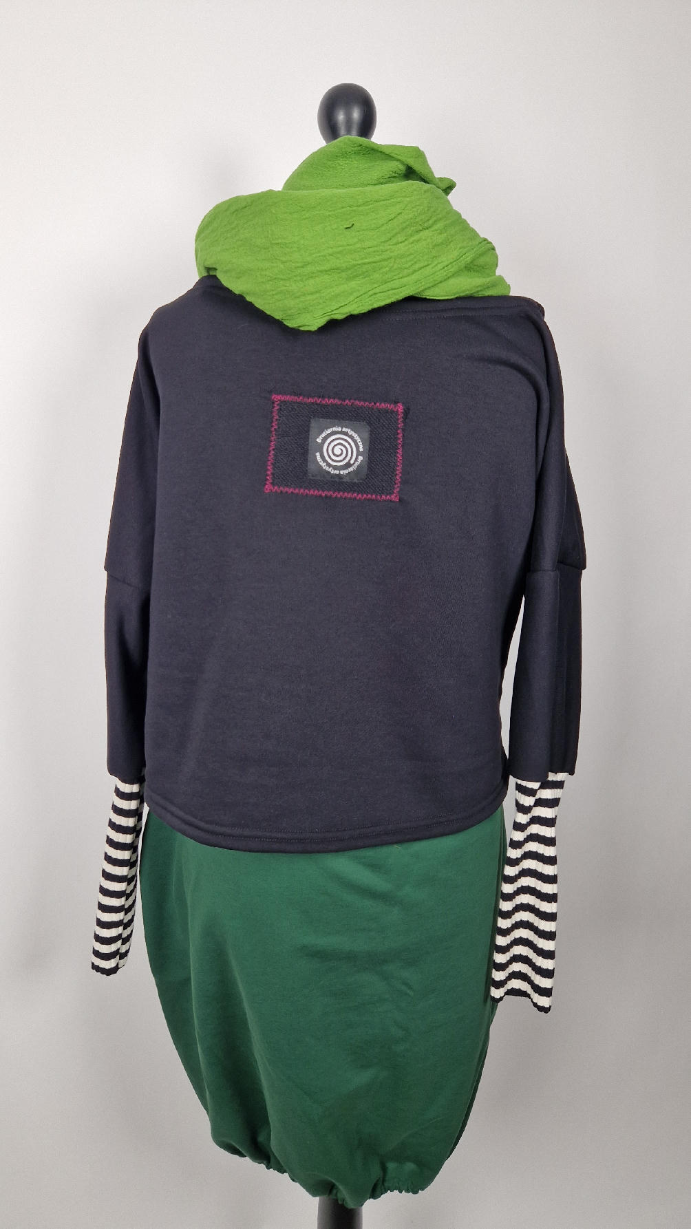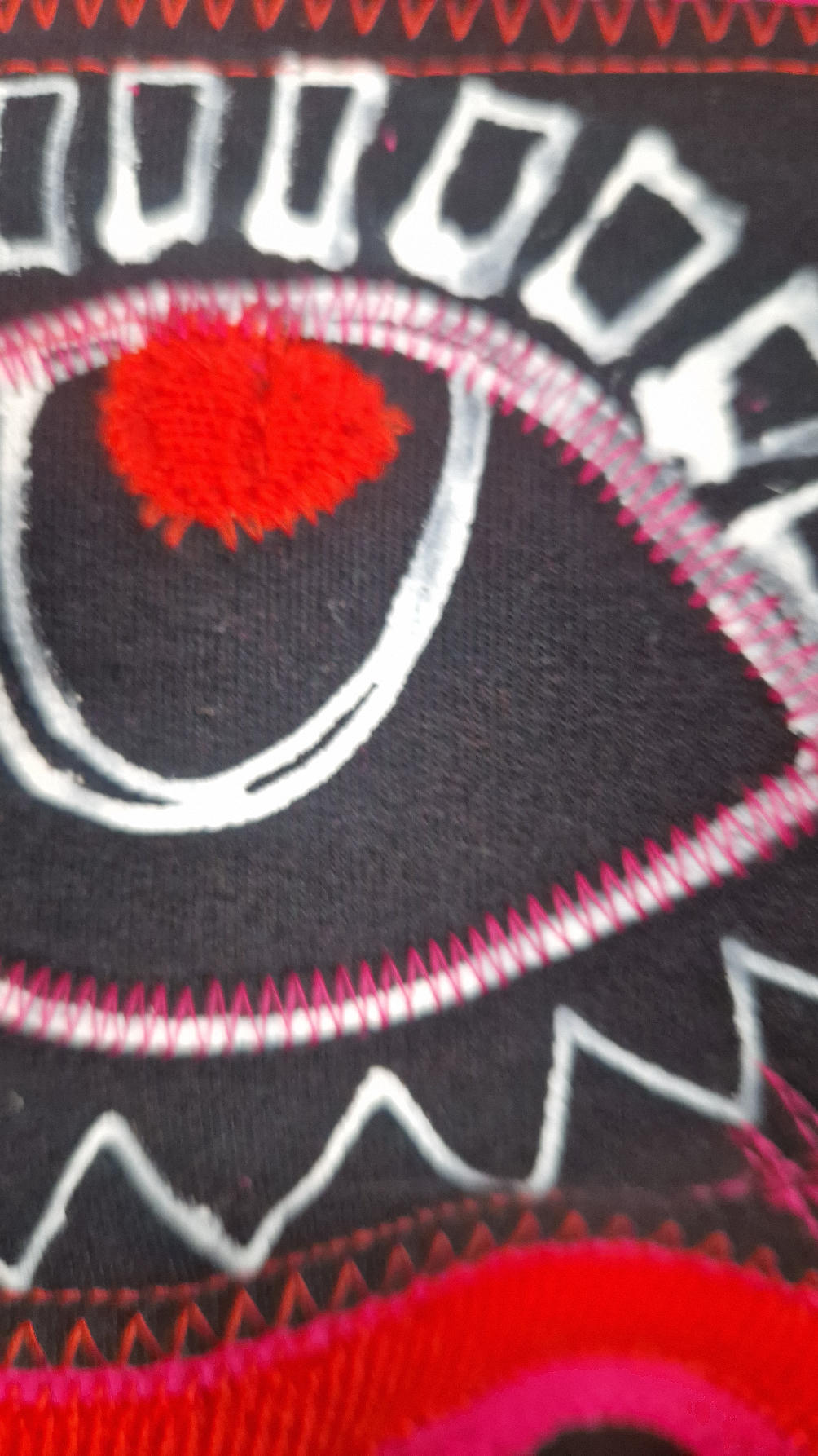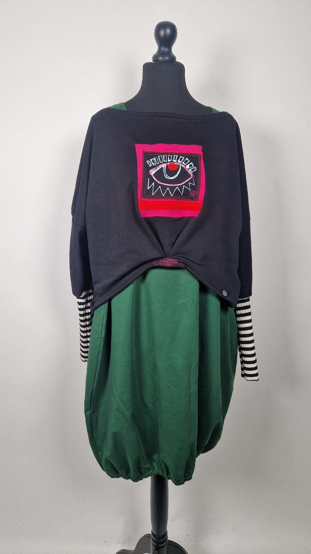 Krótka, śliczna, idealna, ręcznie malowana i poprzeszywana kontrastowymi nitkami, czarna, luźna w biuście bluzka typu NIETOPERZ, ale taki niewielki…namalowane ręcznie przeze mnie oko naszyte na madżentę, … do tego mocna pomarańcza… i przeszycia. Bluzka uszyta z wysokiej jakości grubej bawełny z pętelką, mankiety w paski ..prosta, bez kieszeni – tak specjalnie, żeby nic nie odstawało ale z dużym dekoltem typu ,,łódka”, który możesz opuścić na jedno ramię, lub nosić symetrycznie…Każdy,,obrazek” jest namalowany ręcznie przeze mnie, na czarnej bawełnie , następnie przyszyty do bluzki