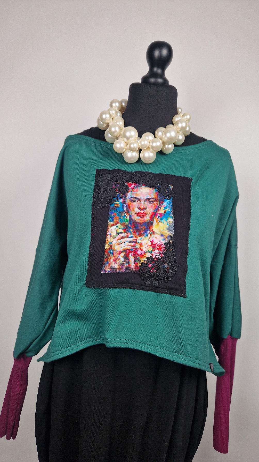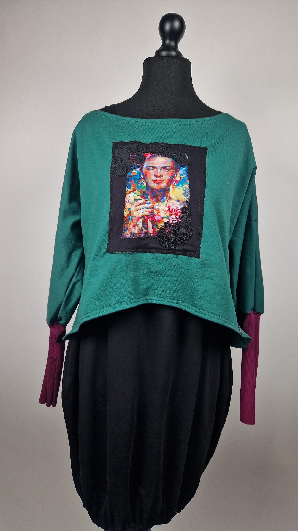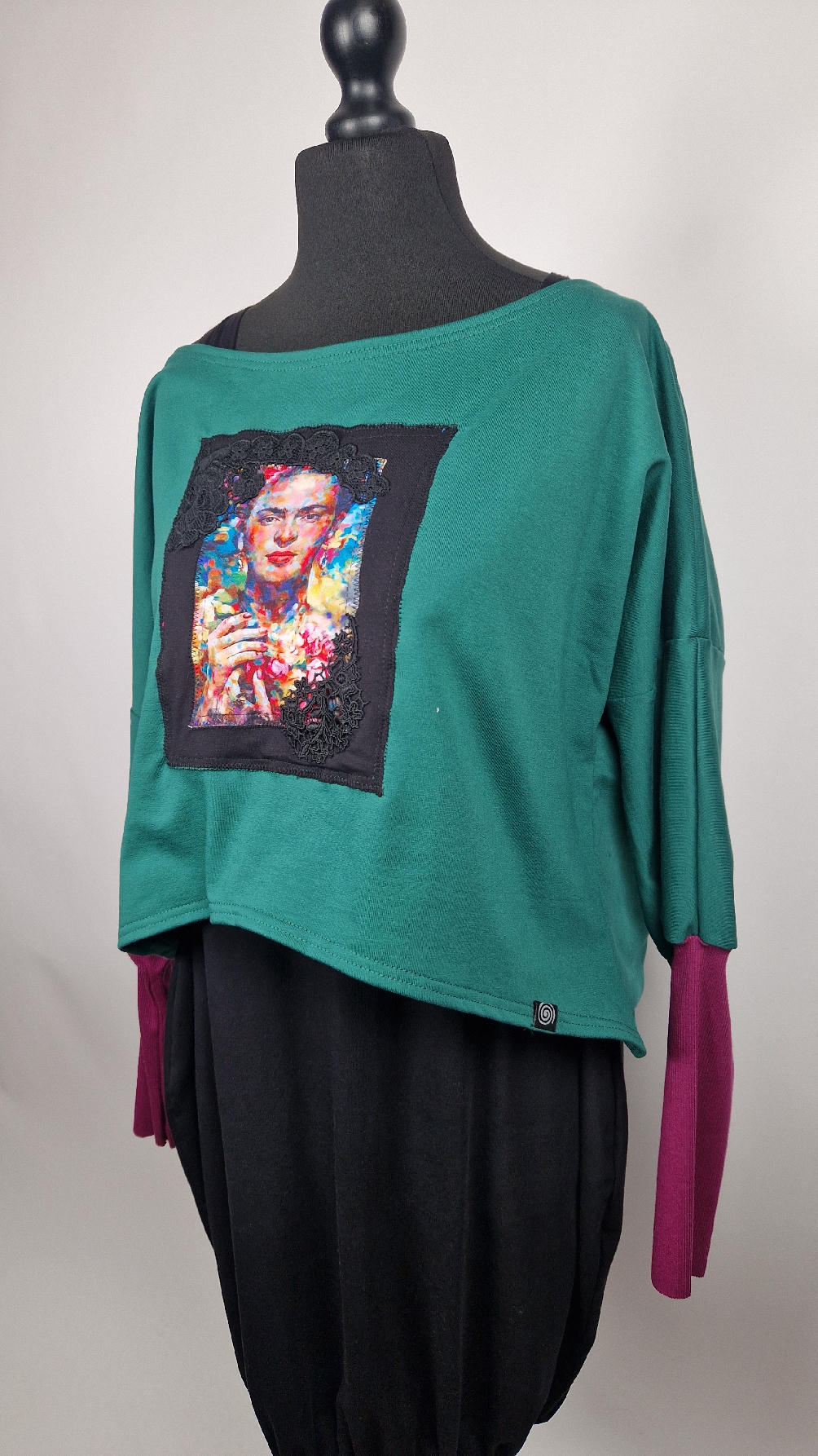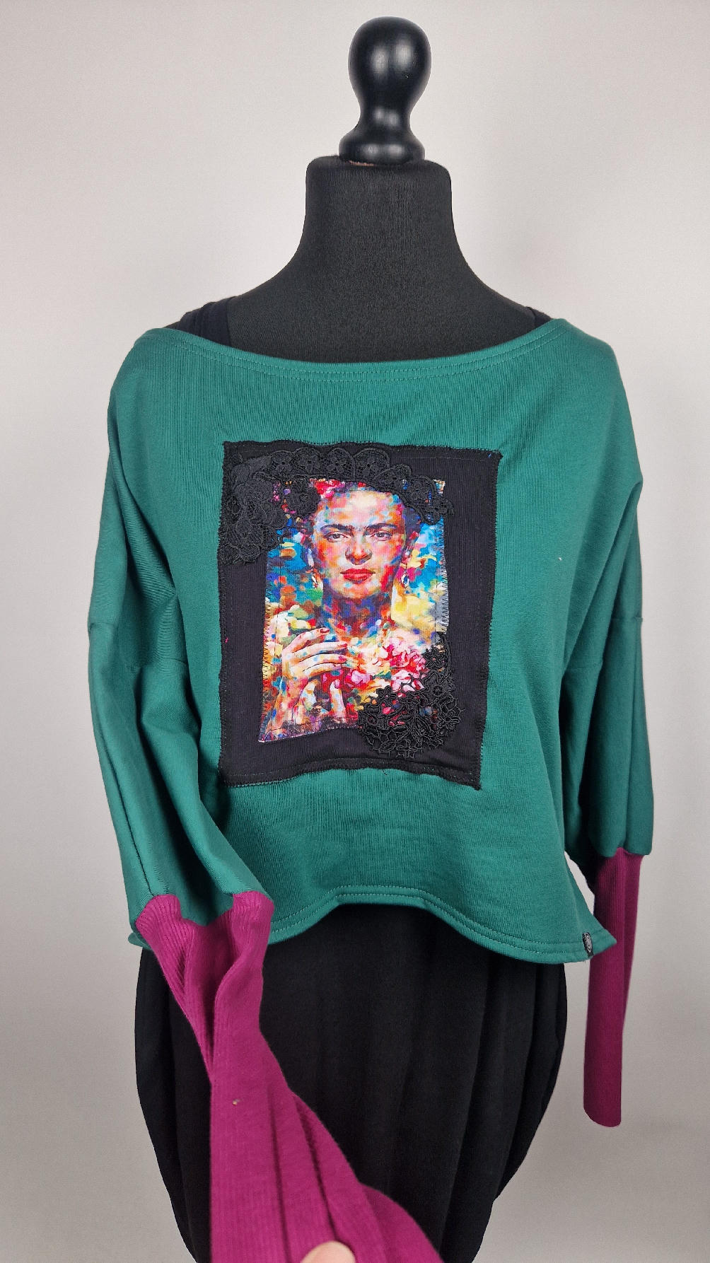 Krótka, ciemno-zielona luźna w biuście bluzka typu NIETOPERZ, ale taki niewielki….bluzka uszyta z wysokiej jakości bawełny z pętelką, z długalaśnymi , elastycznymi , fioletowymi mankietami … prosta, bez kieszeni – tak specjalnie, żeby nic nie odstawało ale z dużym dekoltem typu ,,łódka”, który możesz opuścić na jedno ramię, lub nosić symetrycznie… przodu jest duża kolorowa aplikacja, z portretem Fridy z grubą koronką.