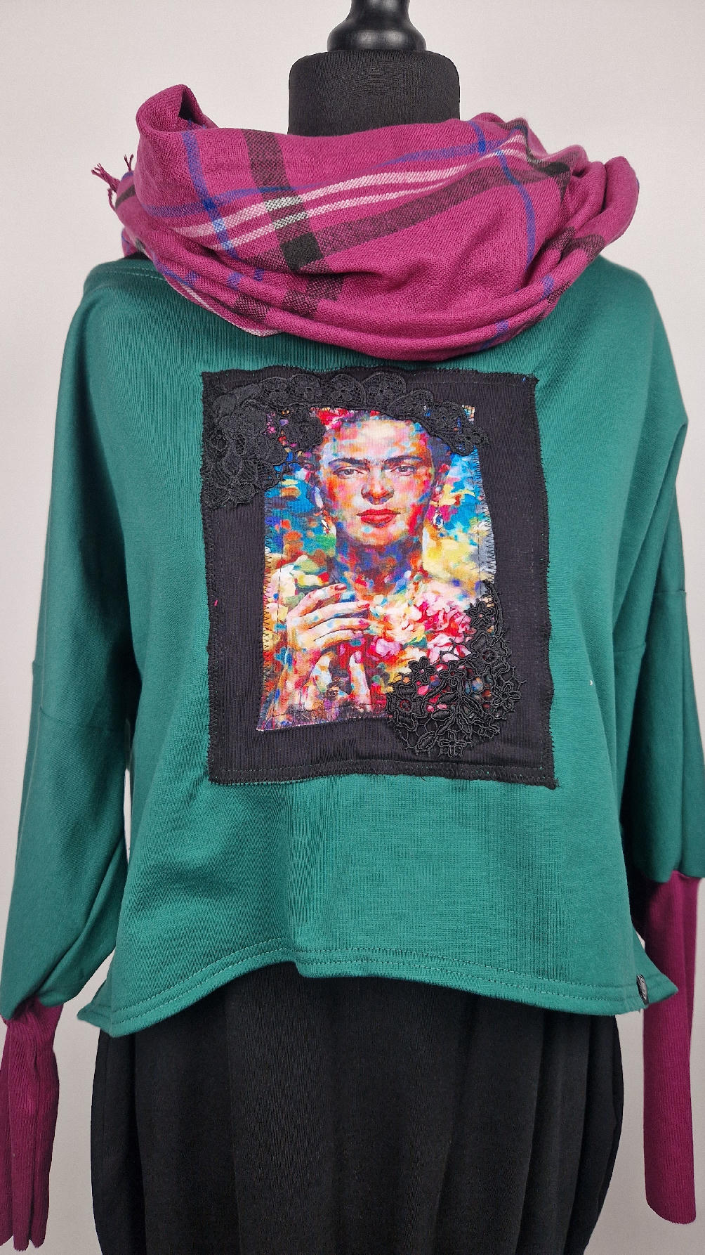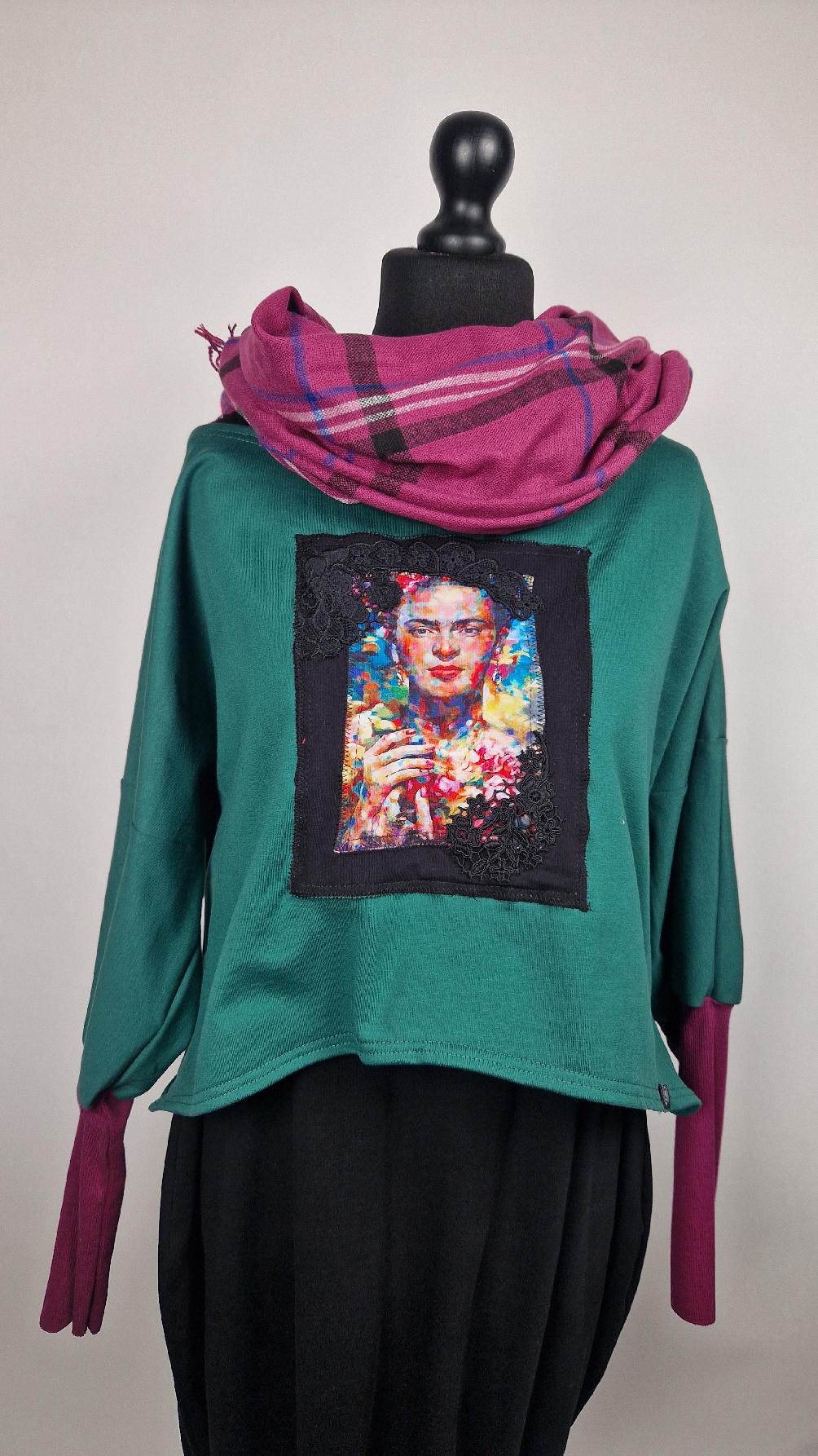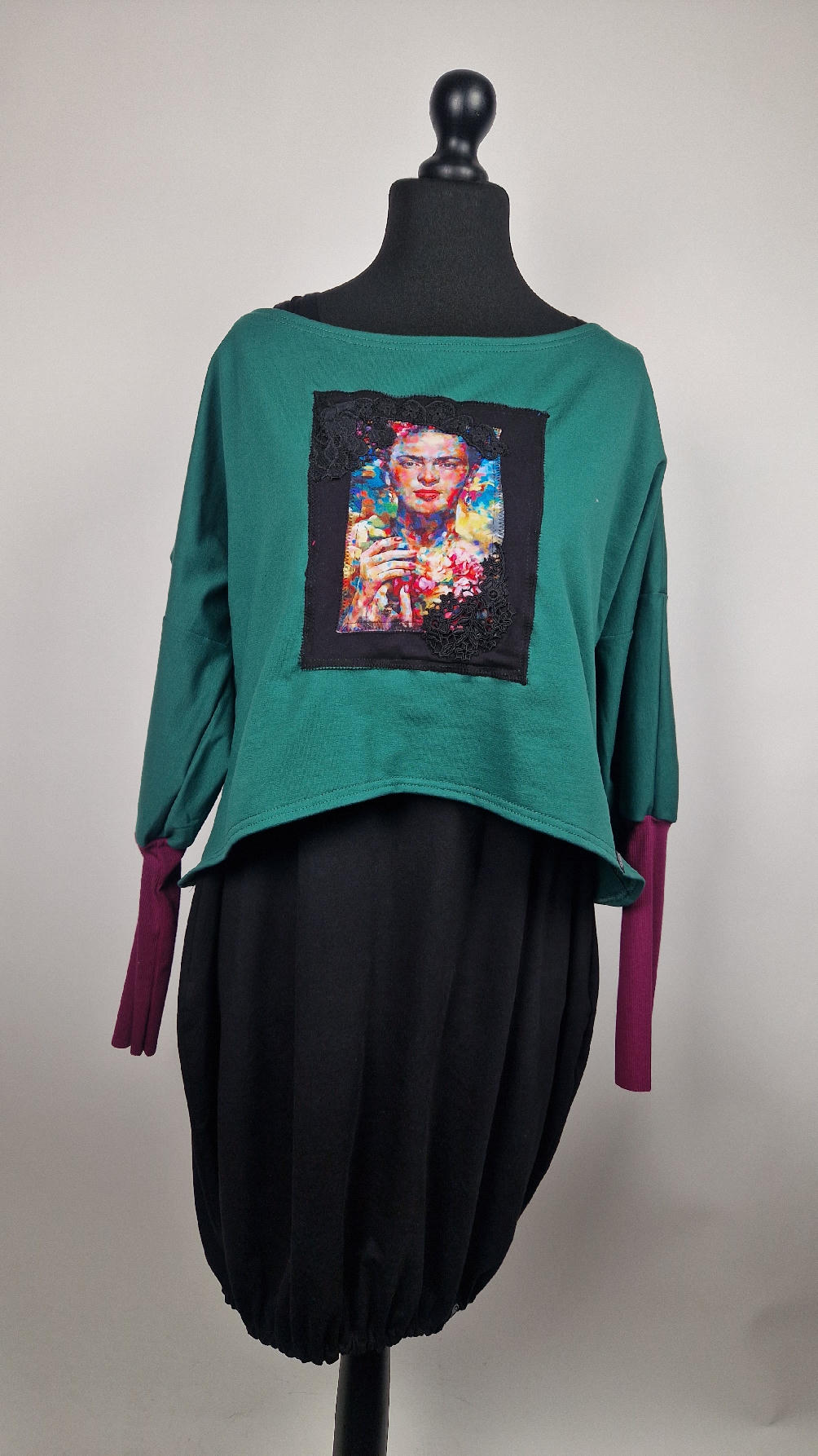 Krótka, ciemno-zielona luźna w biuście bluzka typu NIETOPERZ, ale taki niewielki….bluzka uszyta z wysokiej jakości bawełny z pętelką, z długalaśnymi , elastycznymi , fioletowymi mankietami … prosta, bez kieszeni – tak specjalnie, żeby nic nie odstawało ale z dużym dekoltem typu ,,łódka”, który możesz opuścić na jedno ramię, lub nosić symetrycznie… przodu jest duża kolorowa aplikacja, z portretem Fridy z grubą koronką.