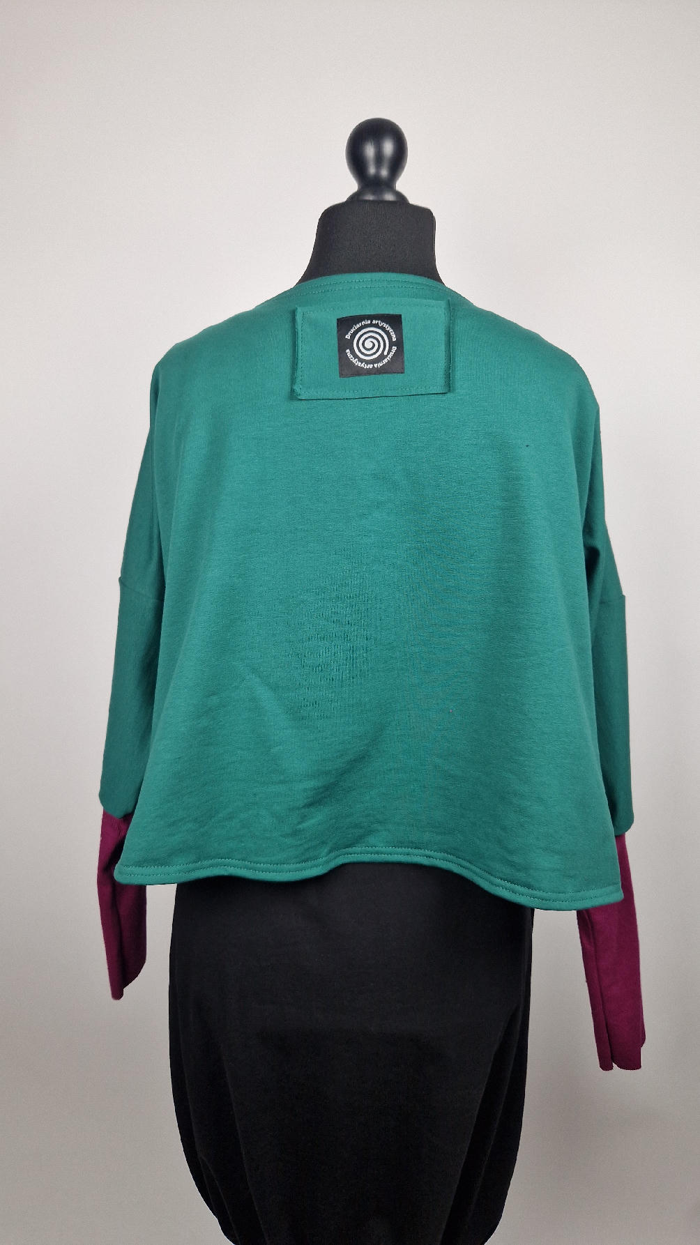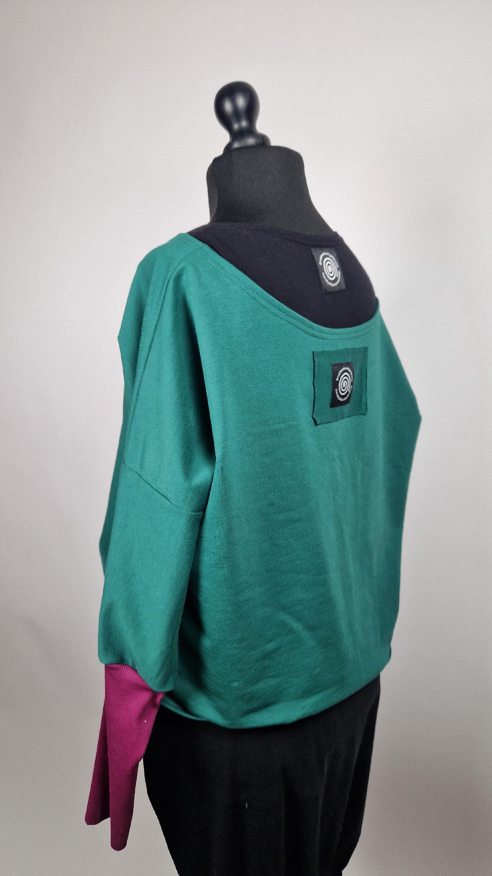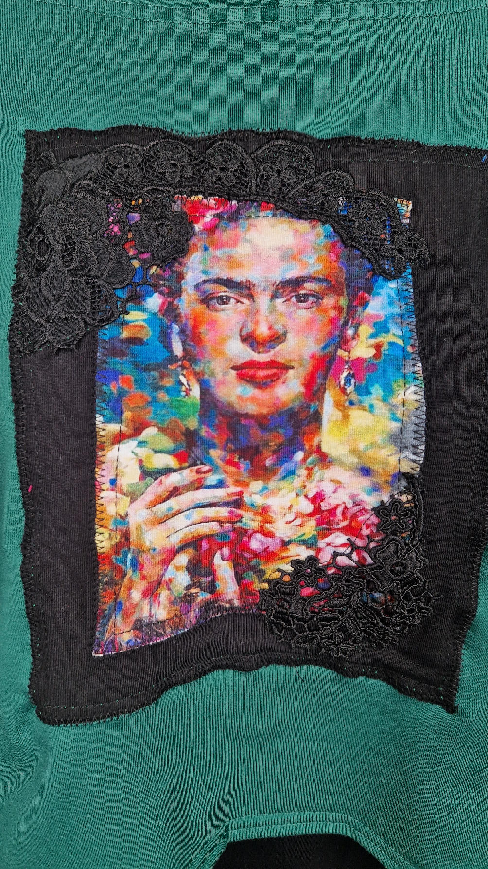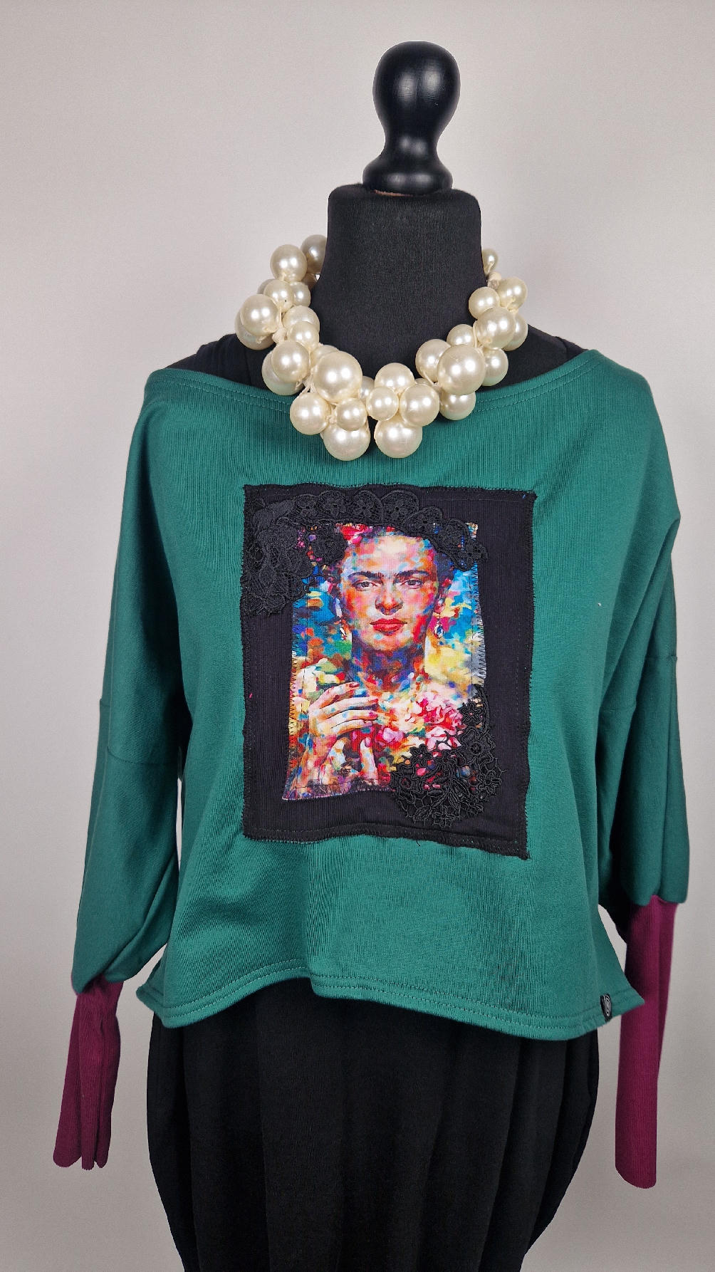 Krótka, ciemno-zielona luźna w biuście bluzka typu NIETOPERZ, ale taki niewielki….bluzka uszyta z wysokiej jakości bawełny z pętelką, z długalaśnymi , elastycznymi , fioletowymi mankietami … prosta, bez kieszeni – tak specjalnie, żeby nic nie odstawało ale z dużym dekoltem typu ,,łódka”, który możesz opuścić na jedno ramię, lub nosić symetrycznie… przodu jest duża kolorowa aplikacja, z portretem Fridy z grubą koronką.