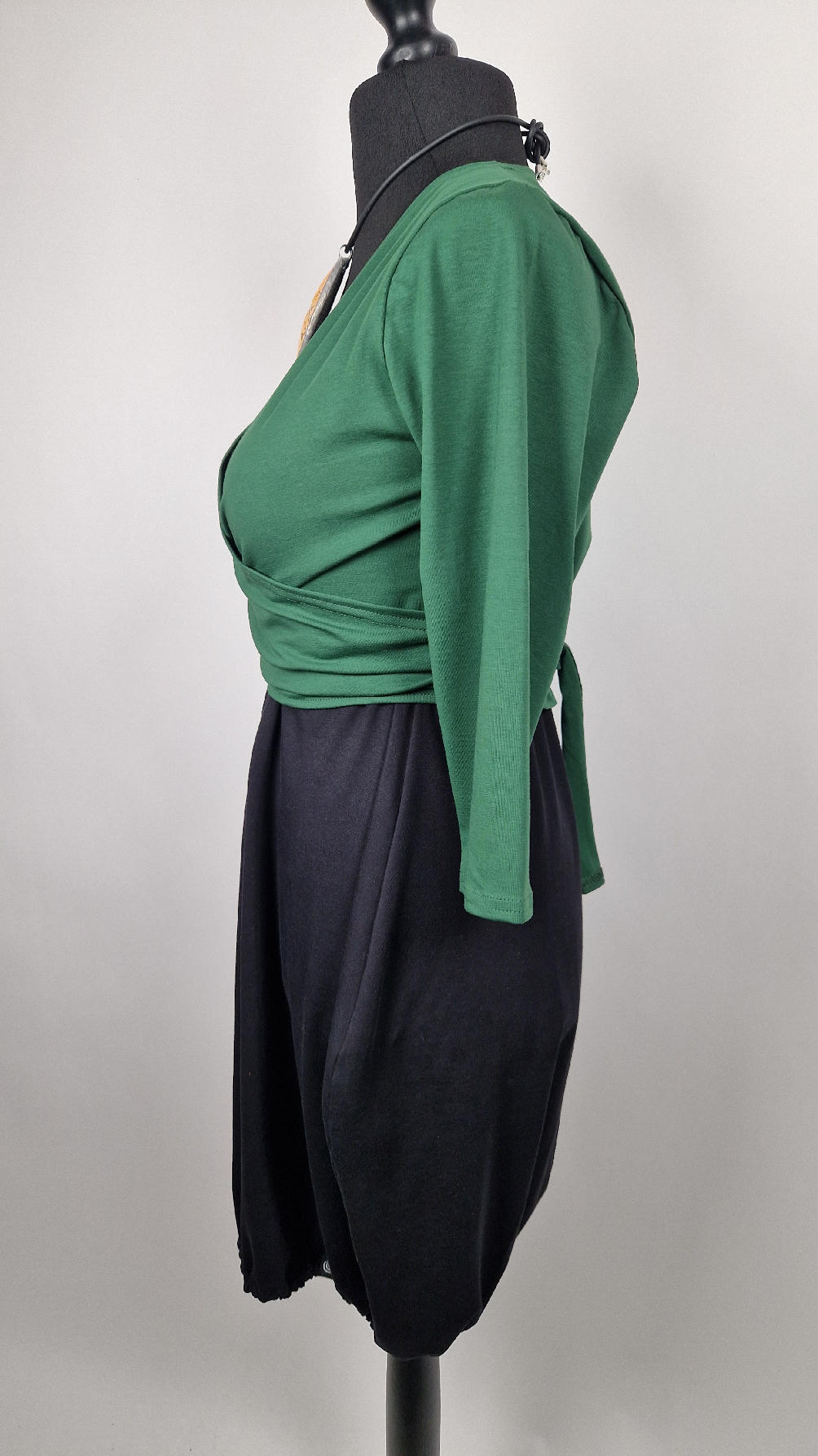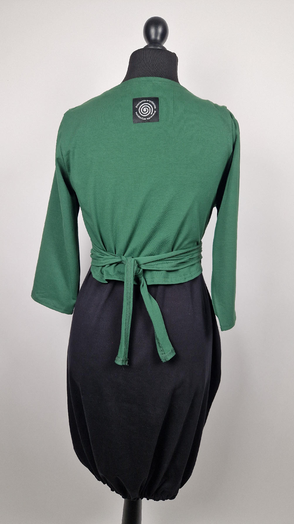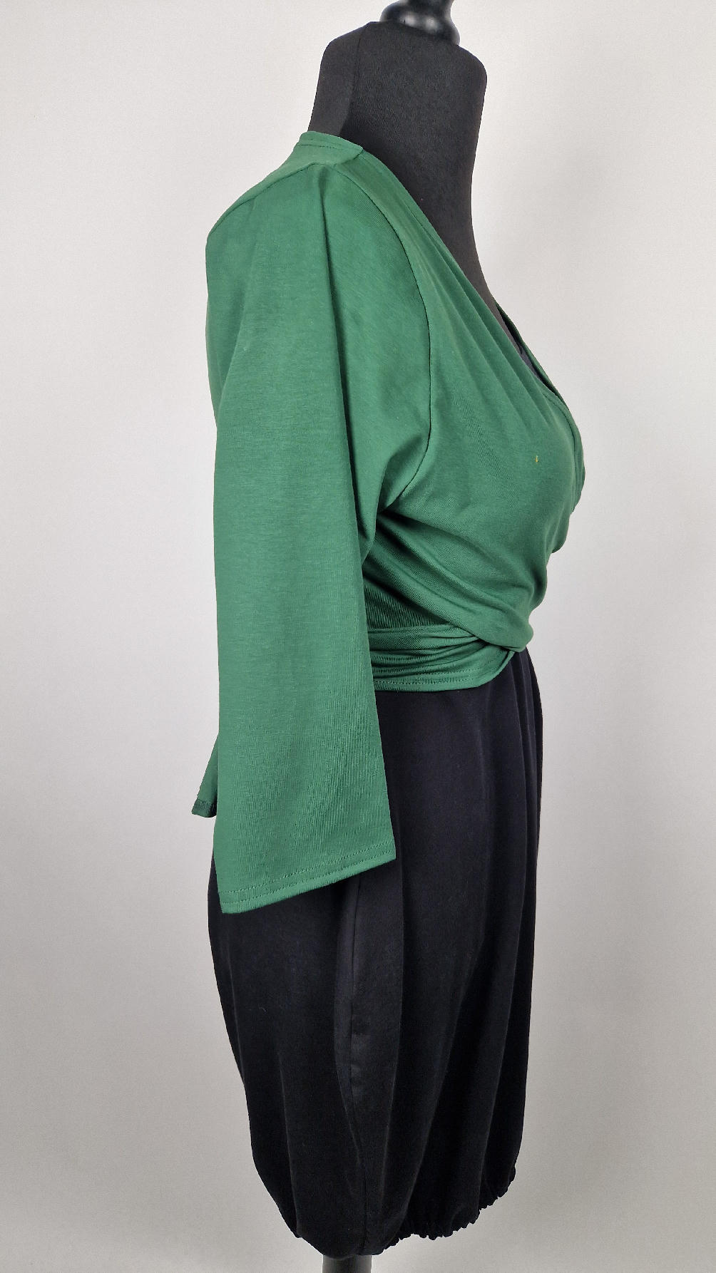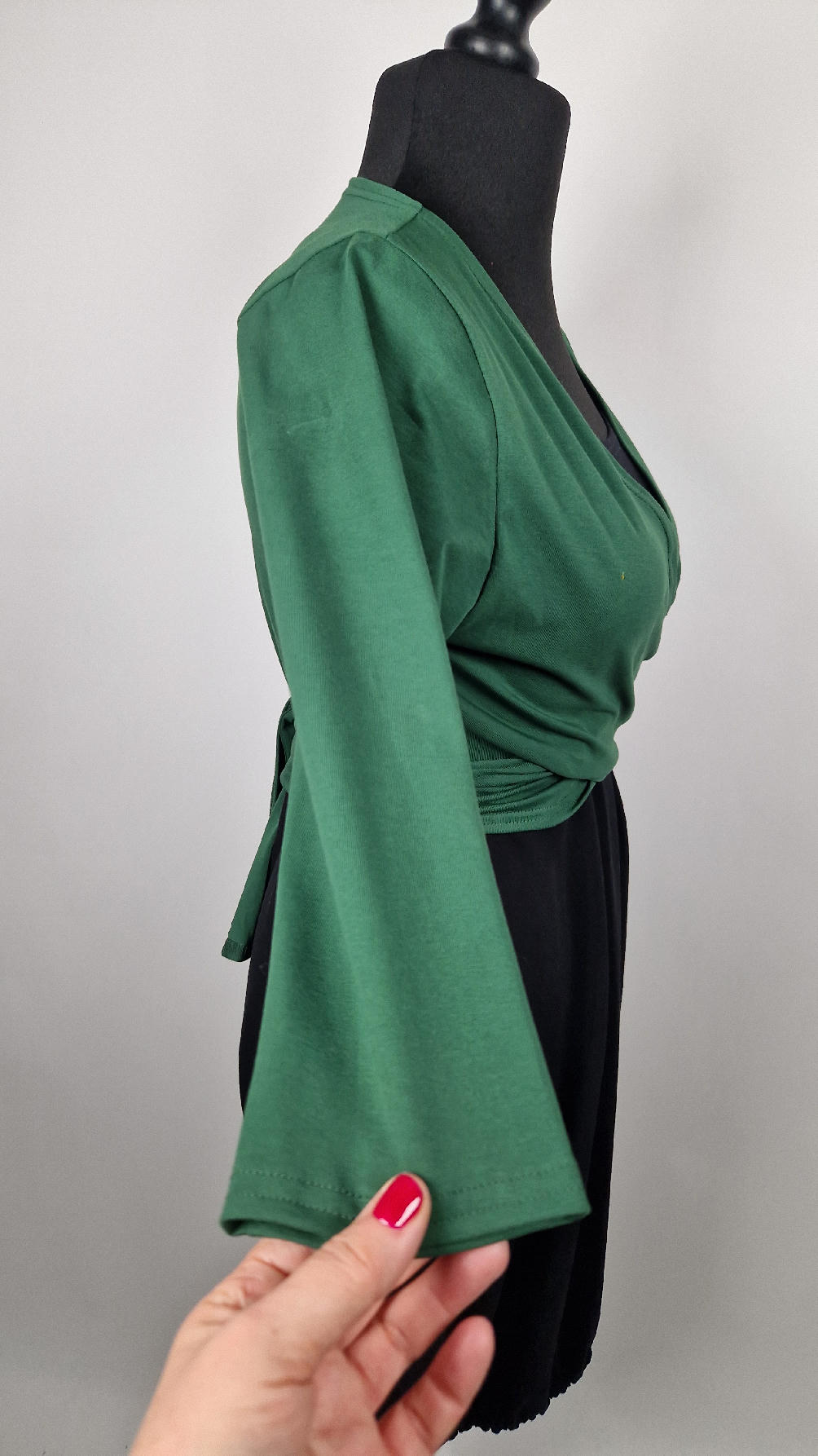 Urocza, lekko rozszerzana zielona jak liście bluzka z rękawem 3/4, z dwoma długimi ,,trąbami” , które możesz zawiązać na plecach, albo puścić luźno… taka lekka, do założenia na sukienkę na ramiączkach, żeby zakryć ,,pelikany”