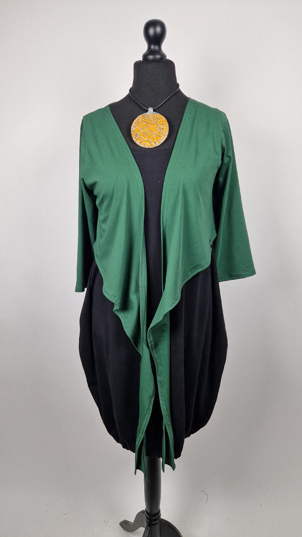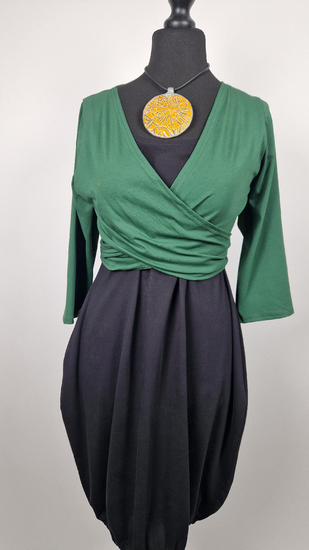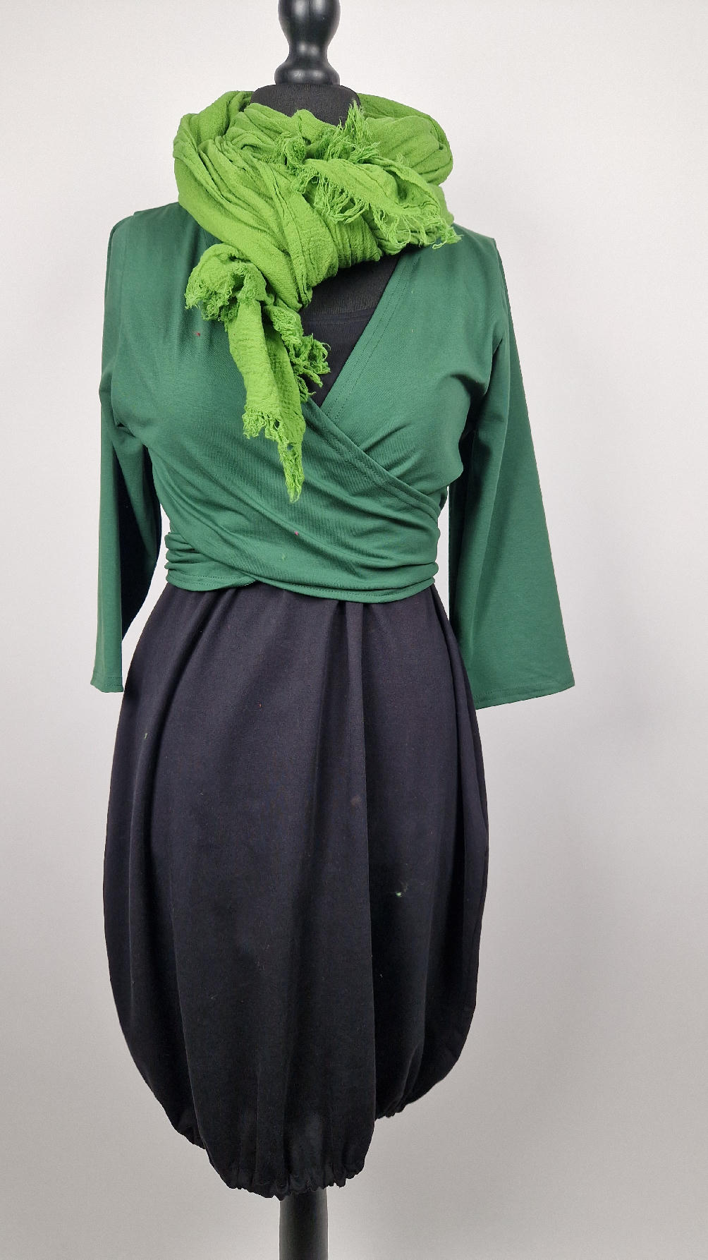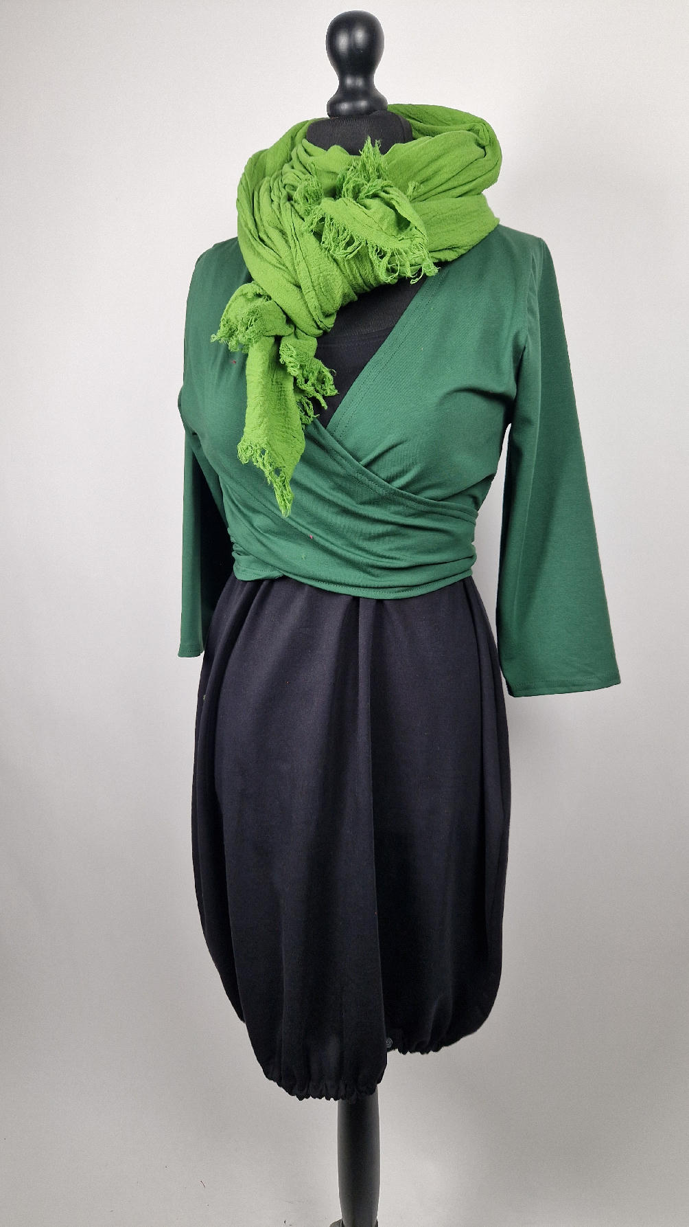 Urocza, lekko rozszerzana zielona jak liście bluzka z rękawem 3/4, z dwoma długimi ,,trąbami” , które możesz zawiązać na plecach, albo puścić luźno… taka lekka, do założenia na sukienkę na ramiączkach, żeby zakryć ,,pelikany”