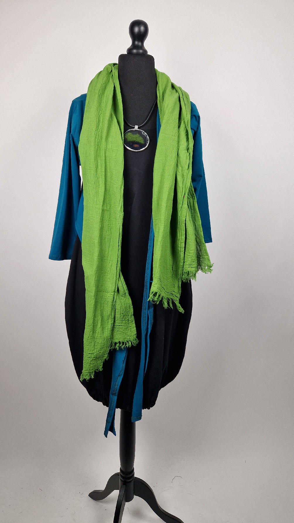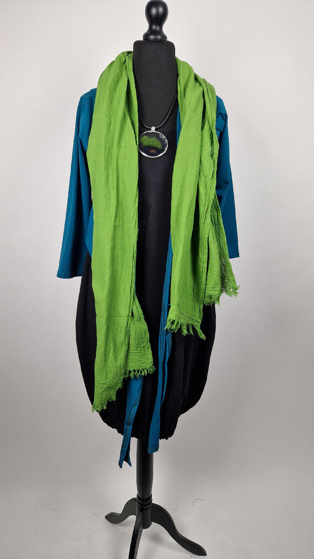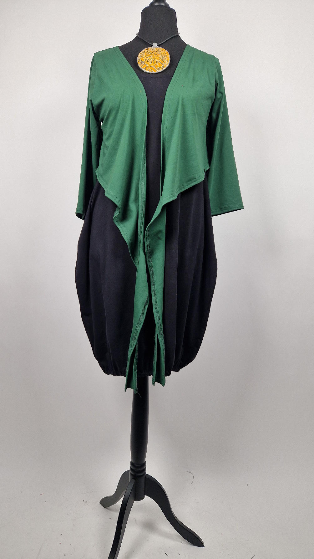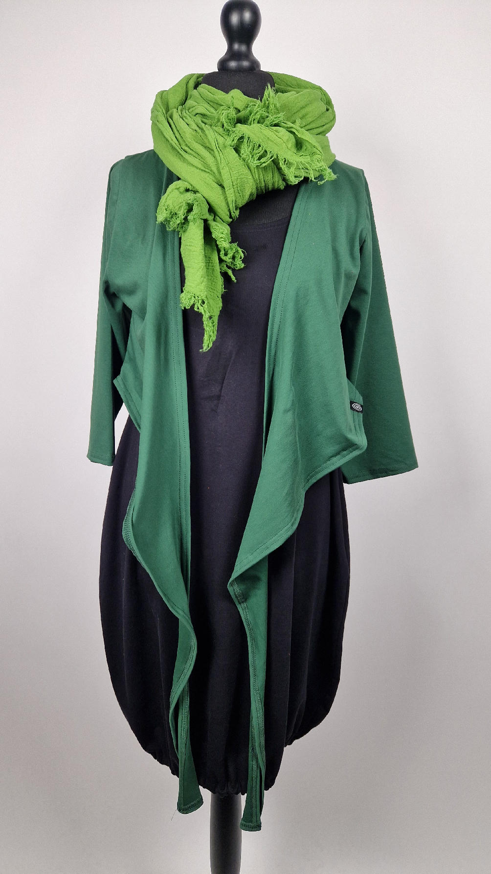 Urocza, lekko rozszerzana zielona jak liście bluzka z rękawem 3/4, z dwoma długimi ,,trąbami” , które możesz zawiązać na plecach, albo puścić luźno… taka lekka, do założenia na sukienkę na ramiączkach, żeby zakryć ,,pelikany”