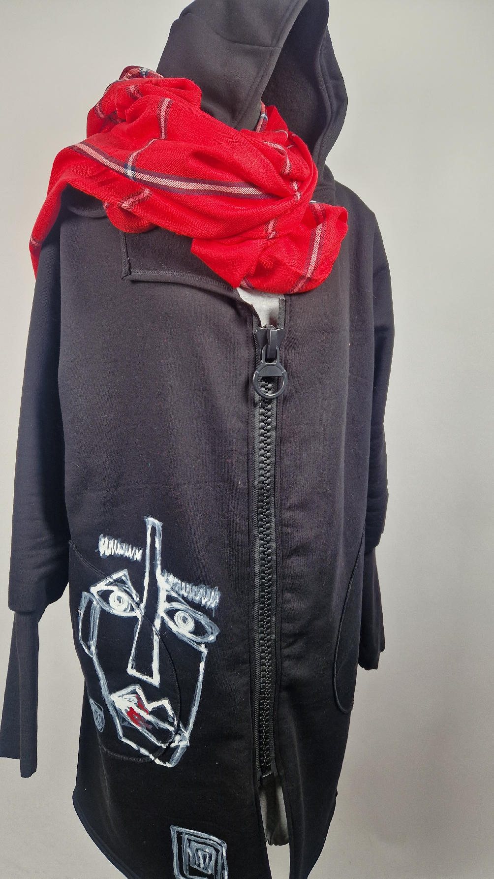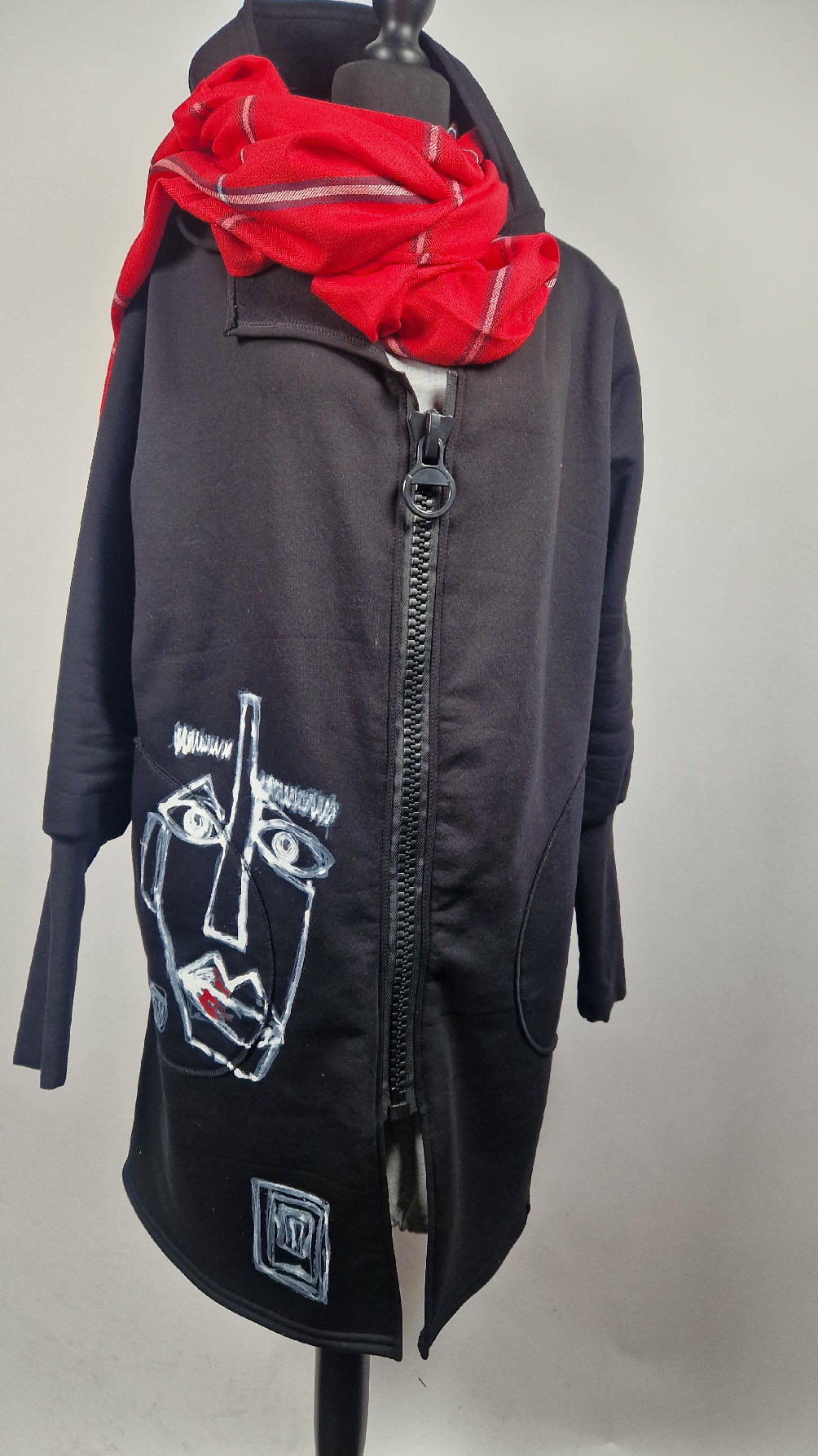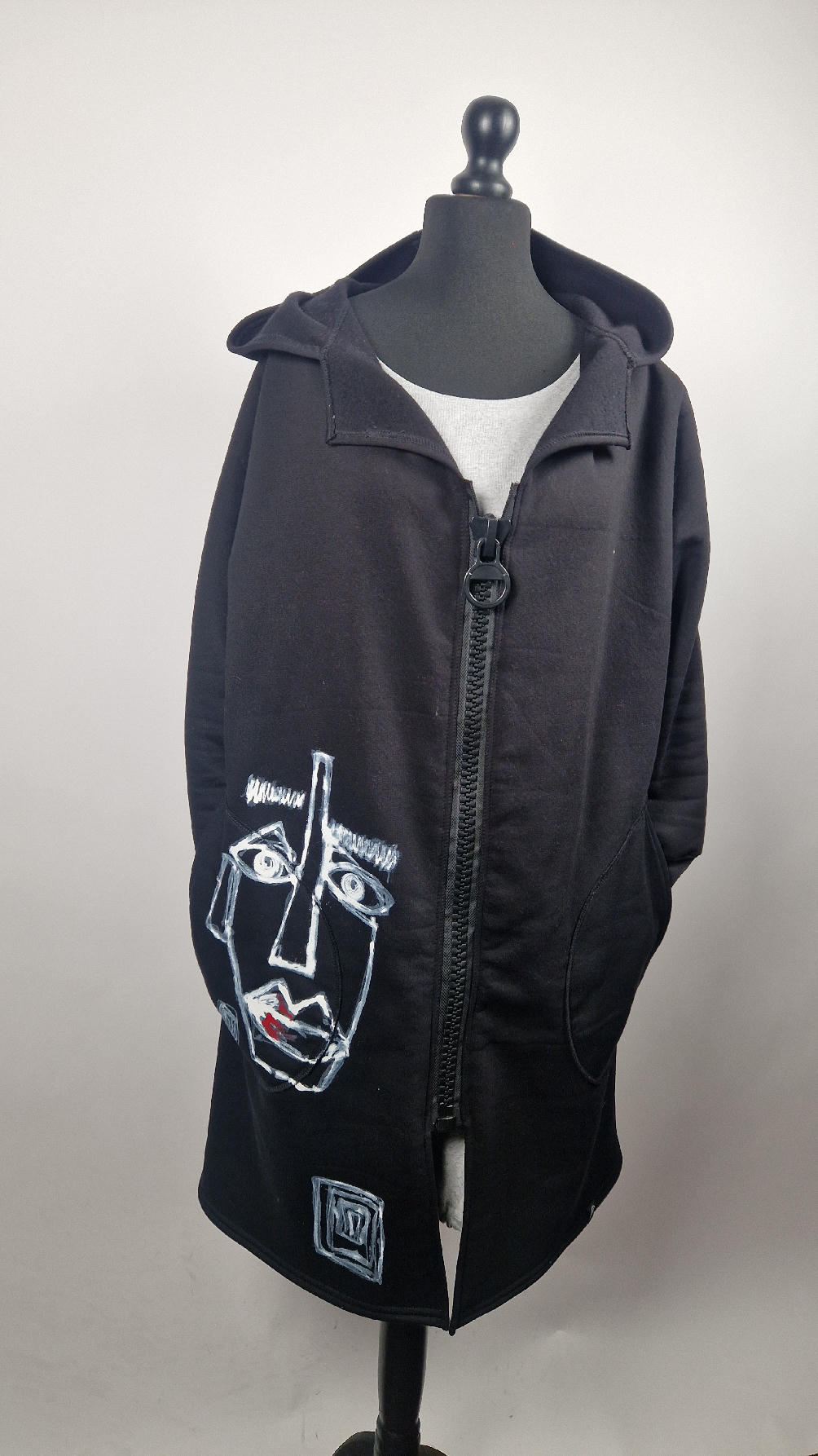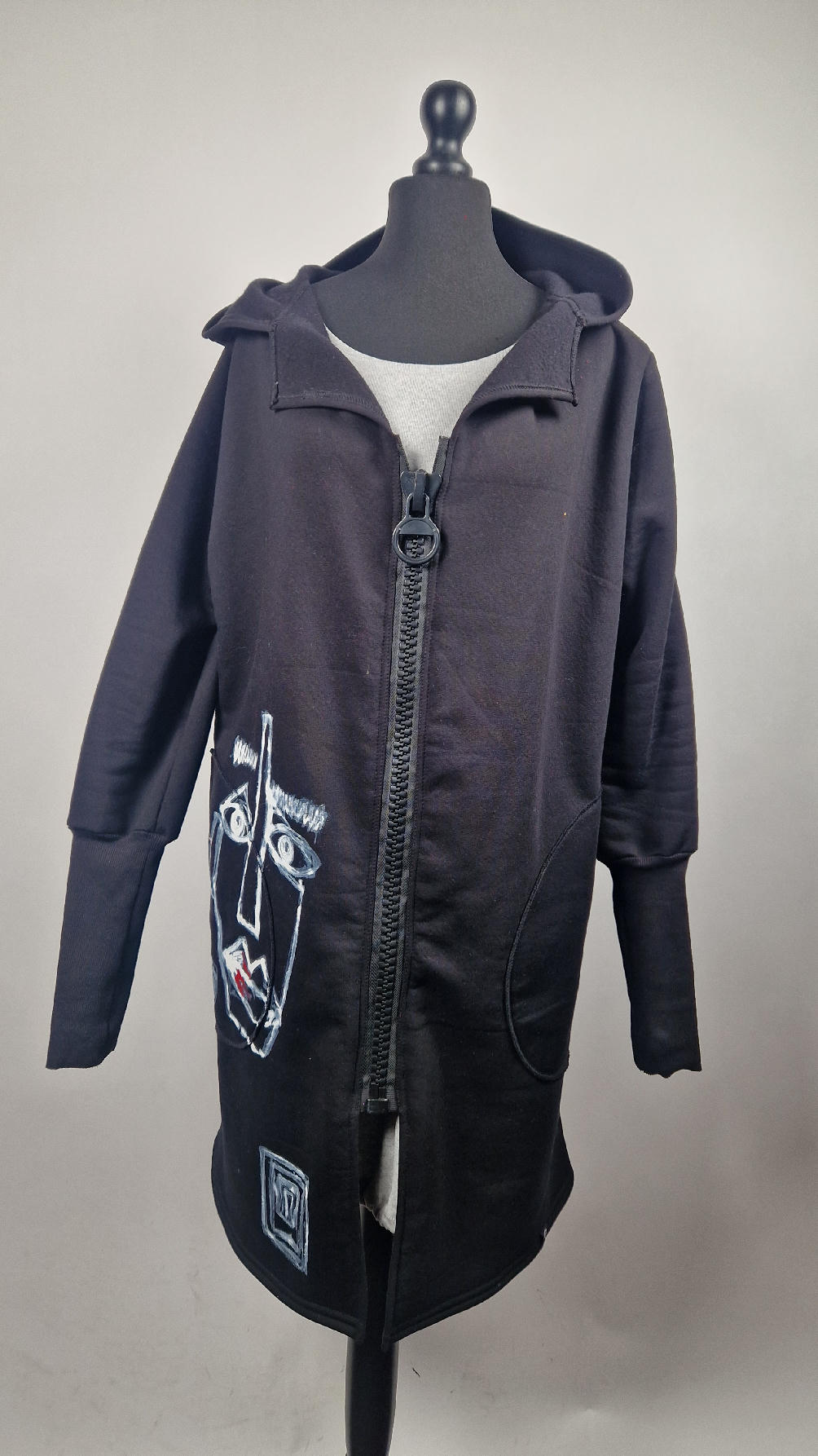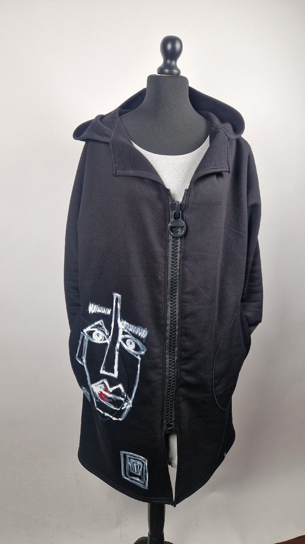 Ręcznie malowany przeze mnie bluzo-płaszcz JeanLuis obłędnie zgrabny, wygodny, wszystko zakrywający COŚ , który pokochasz od pierwszego założenia. Pan Luis uszyty jest z mięciutkiej , drapanej bawełny, jest długi , gładki, ale ma duży zamek- ekspres-suwak, który jest świetną ozdobą, ma duże kieszenie na łapki , duży kaptur i długie rękawy z długimi, czarnymi mankietami, Jean Luis jest wygodny, oryginalny, niebanalny . Świetnie nadaje się tez dla mężczyzn.