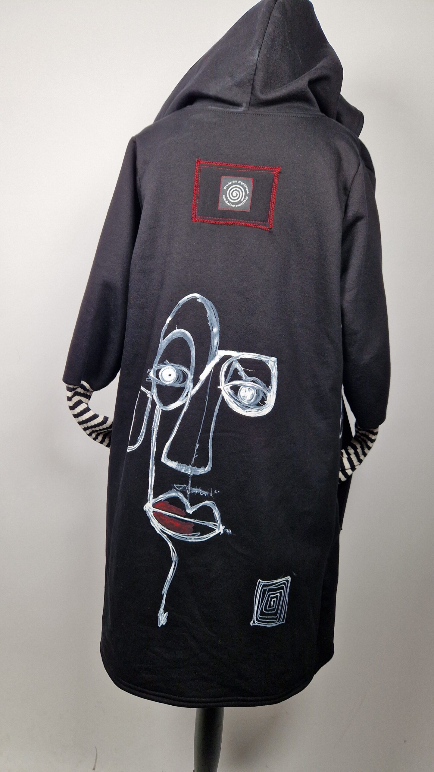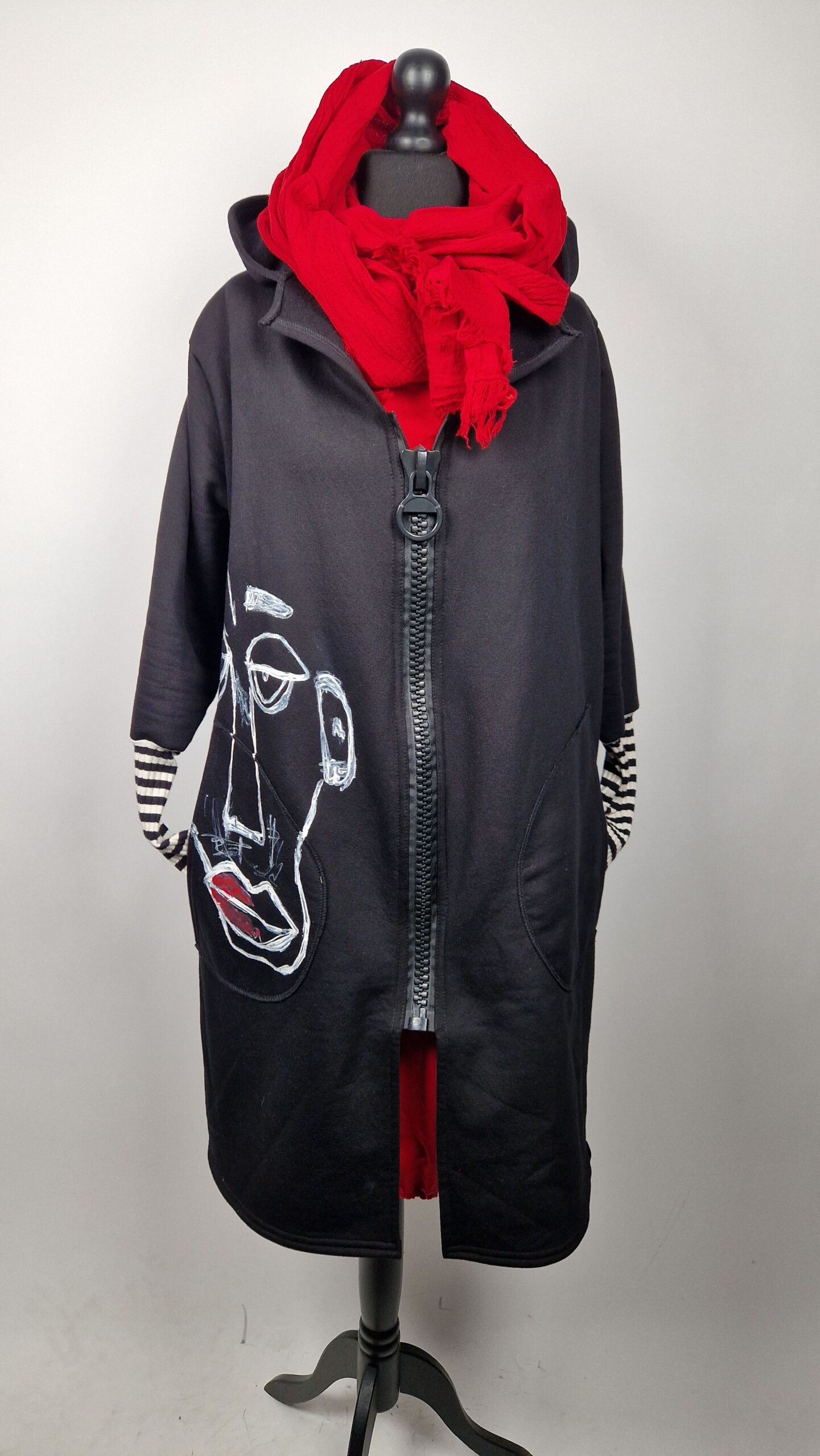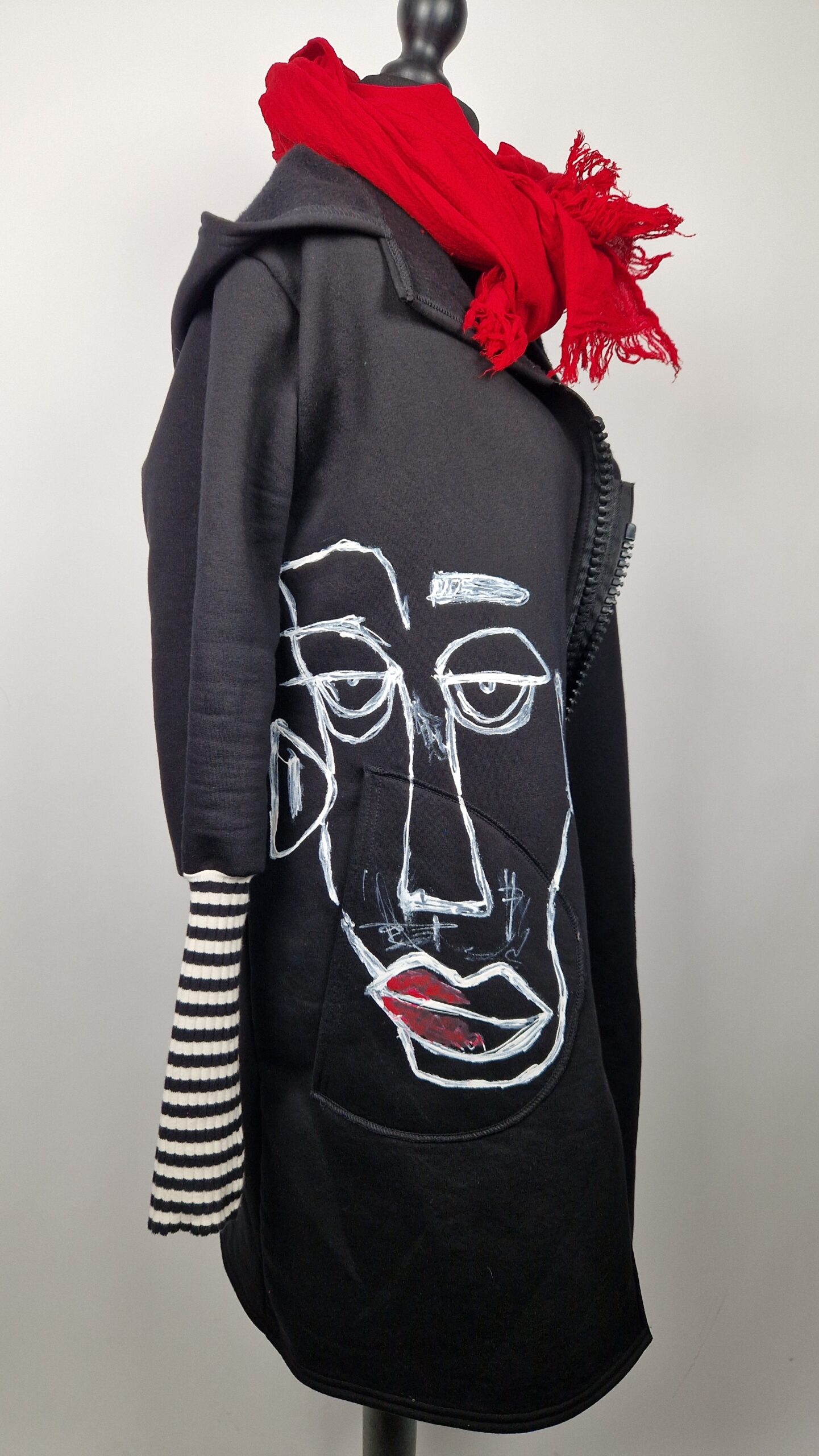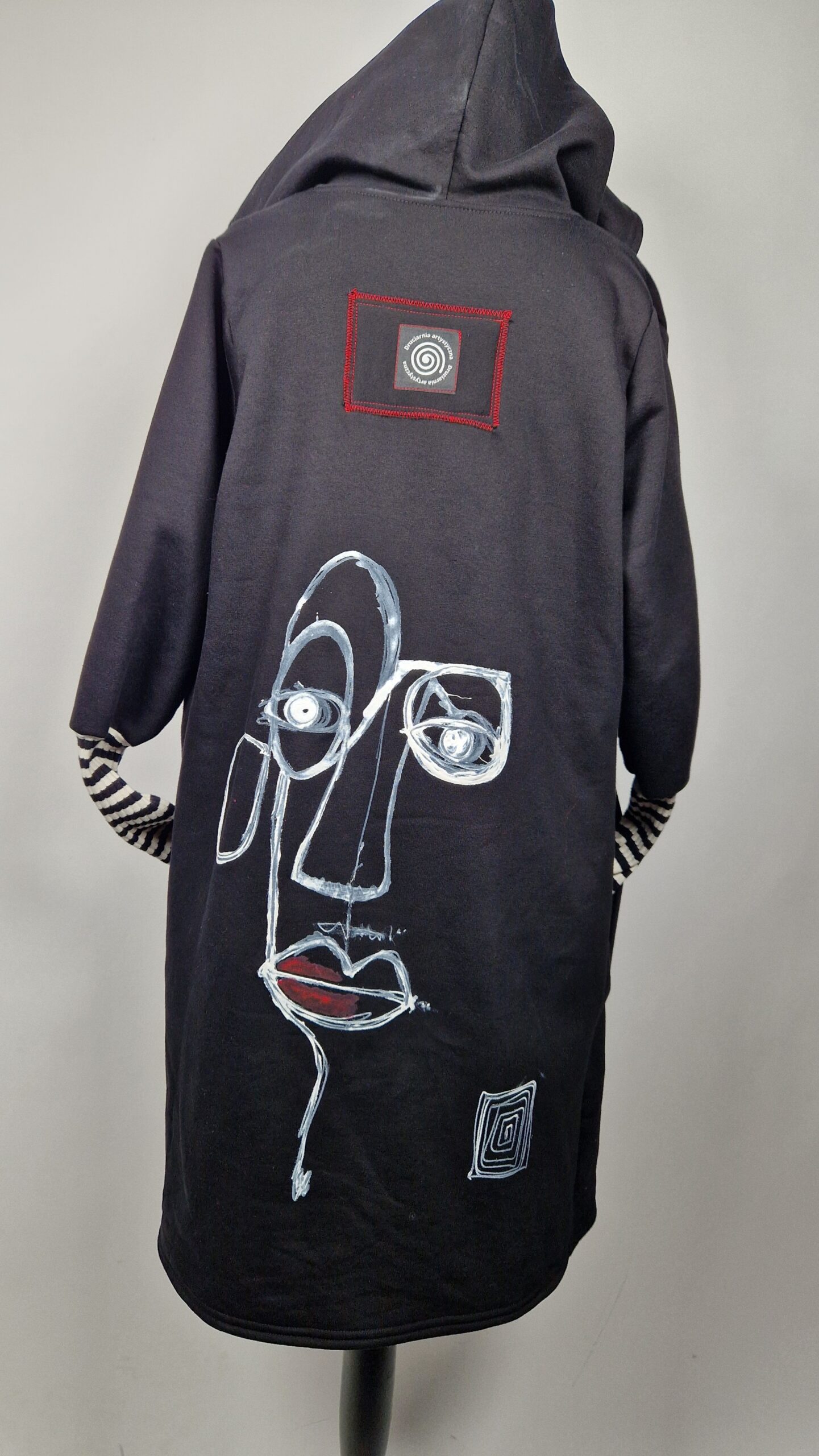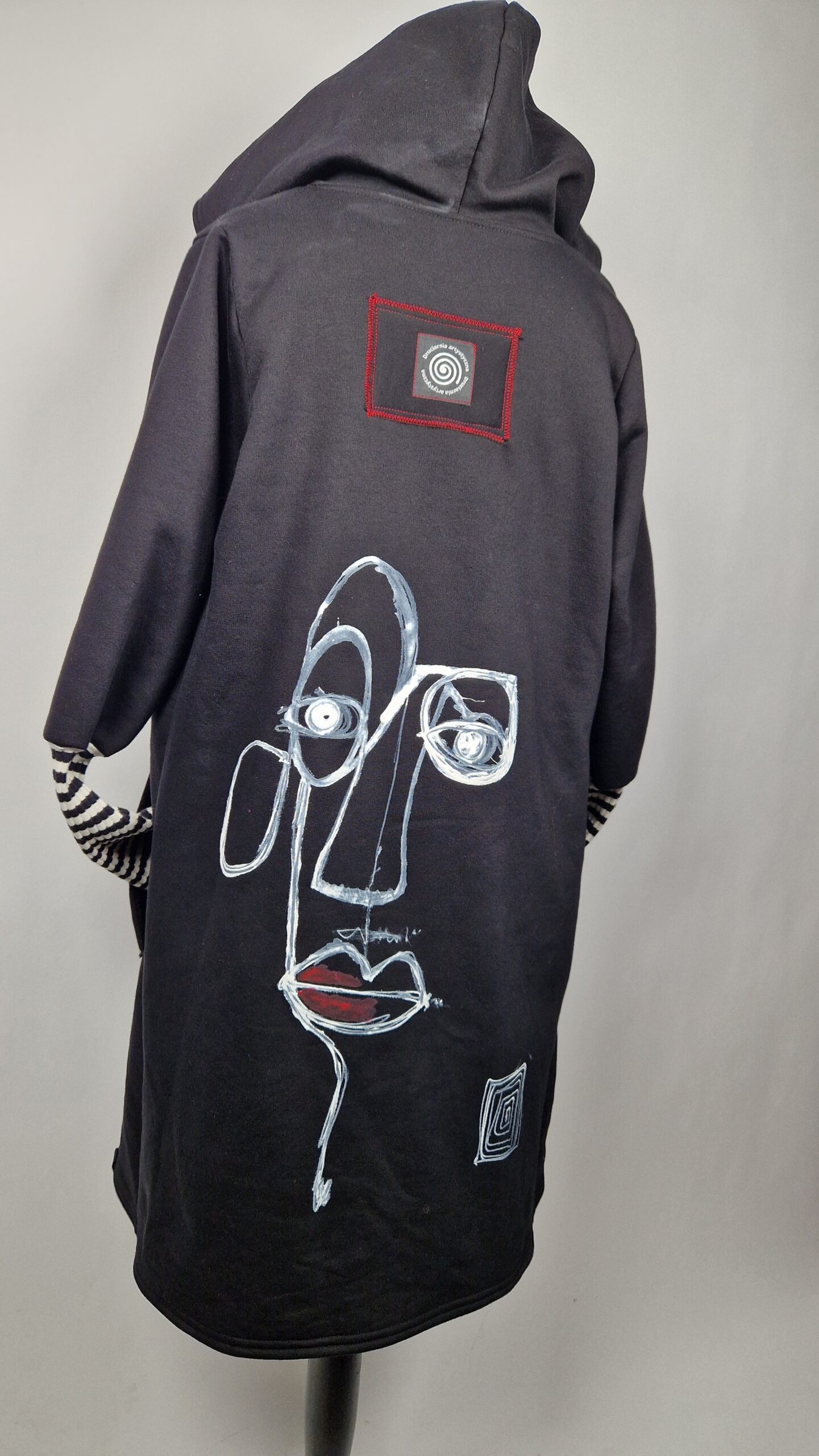 Bluzopłaszcz JohnBello M/L obłędnie zgrabny, wygodny, wszystko zakrywający COŚ , który pokochasz od pierwszego założenia. Bluzopłaszcz JohnBello M/L uszyty jest z mięciutkiej , drapanej bawełny, jest długi , gładki, ale ma duży zamek- ekspres-suwak, który jest świetną ozdobą, ma duże kieszenie na łapki , duży kaptur i długie rękawy z długimi ściągaczowymi , mankietami w paski. John Bello jest malowany ręcznie , ma namalowane portrety- jeden na plecach, a drugi z przodu.