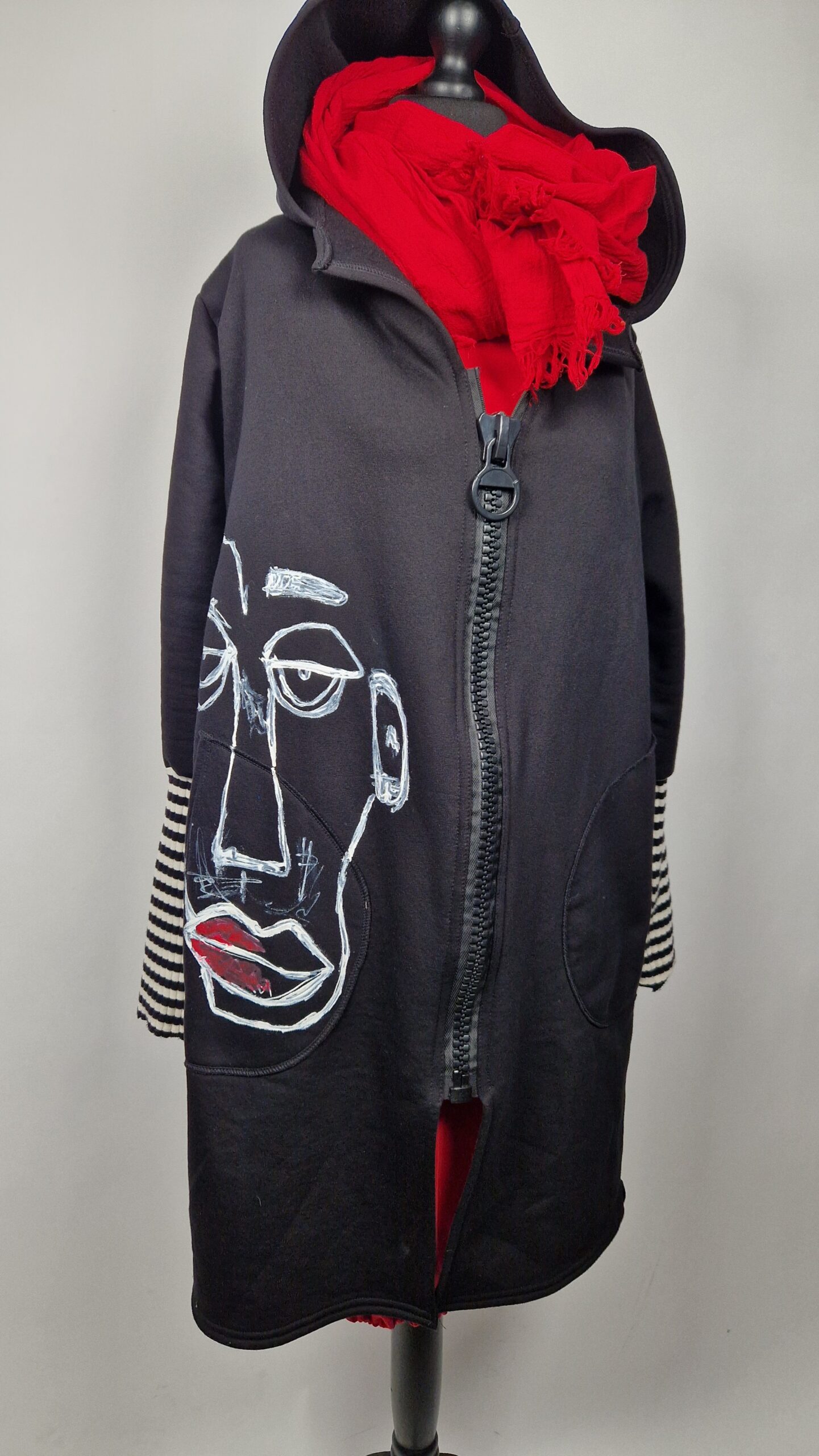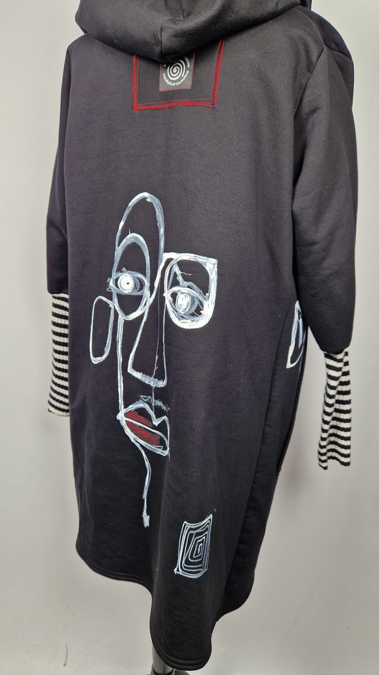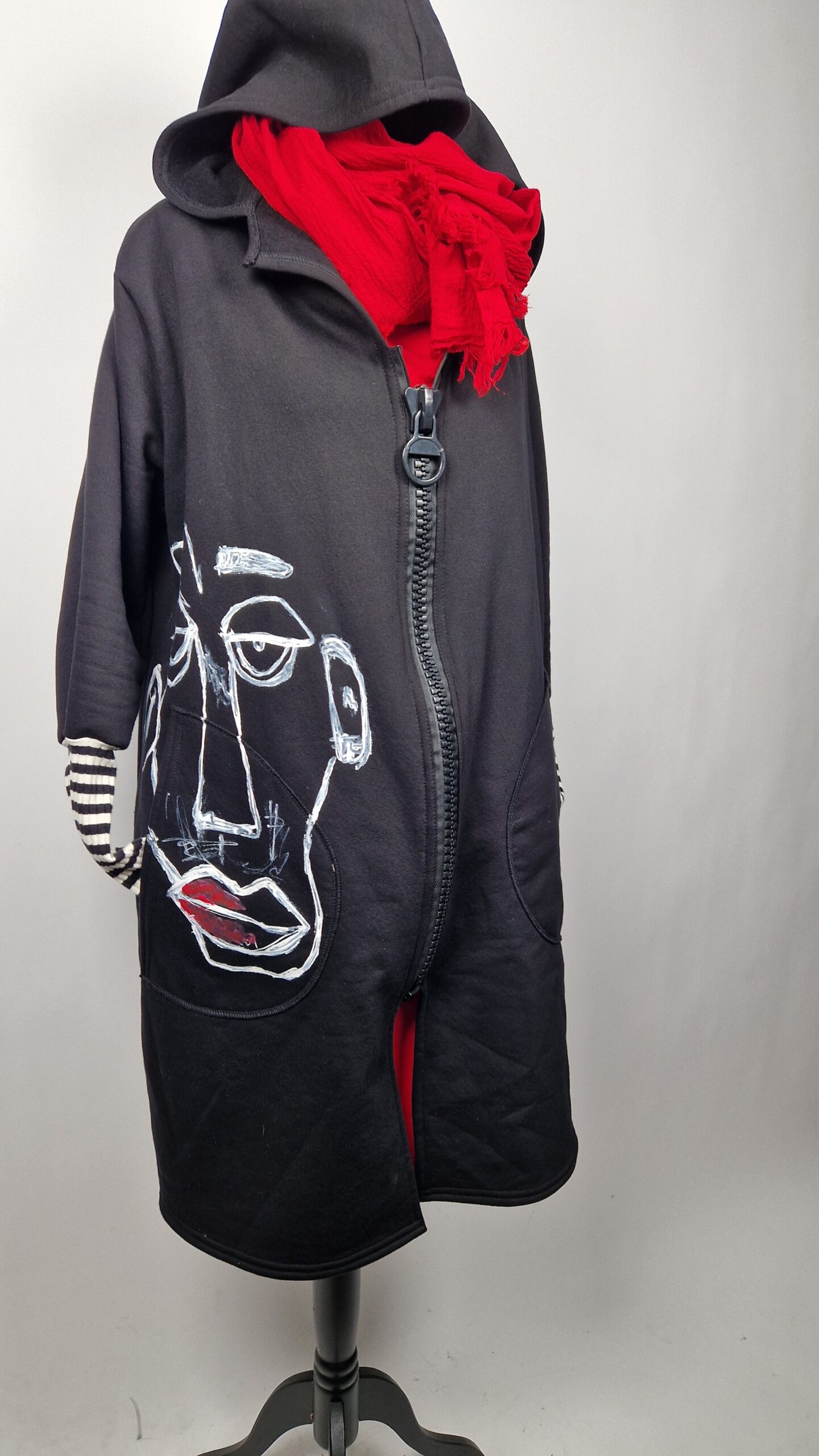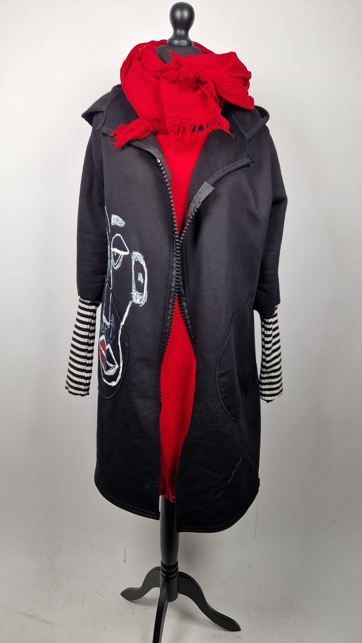 Bluzopłaszcz JohnBello M/L obłędnie zgrabny, wygodny, wszystko zakrywający COŚ , który pokochasz od pierwszego założenia. Bluzopłaszcz JohnBello M/L uszyty jest z mięciutkiej , drapanej bawełny, jest długi , gładki, ale ma duży zamek- ekspres-suwak, który jest świetną ozdobą, ma duże kieszenie na łapki , duży kaptur i długie rękawy z długimi ściągaczowymi , mankietami w paski. John Bello jest malowany ręcznie , ma namalowane portrety- jeden na plecach, a drugi z przodu.