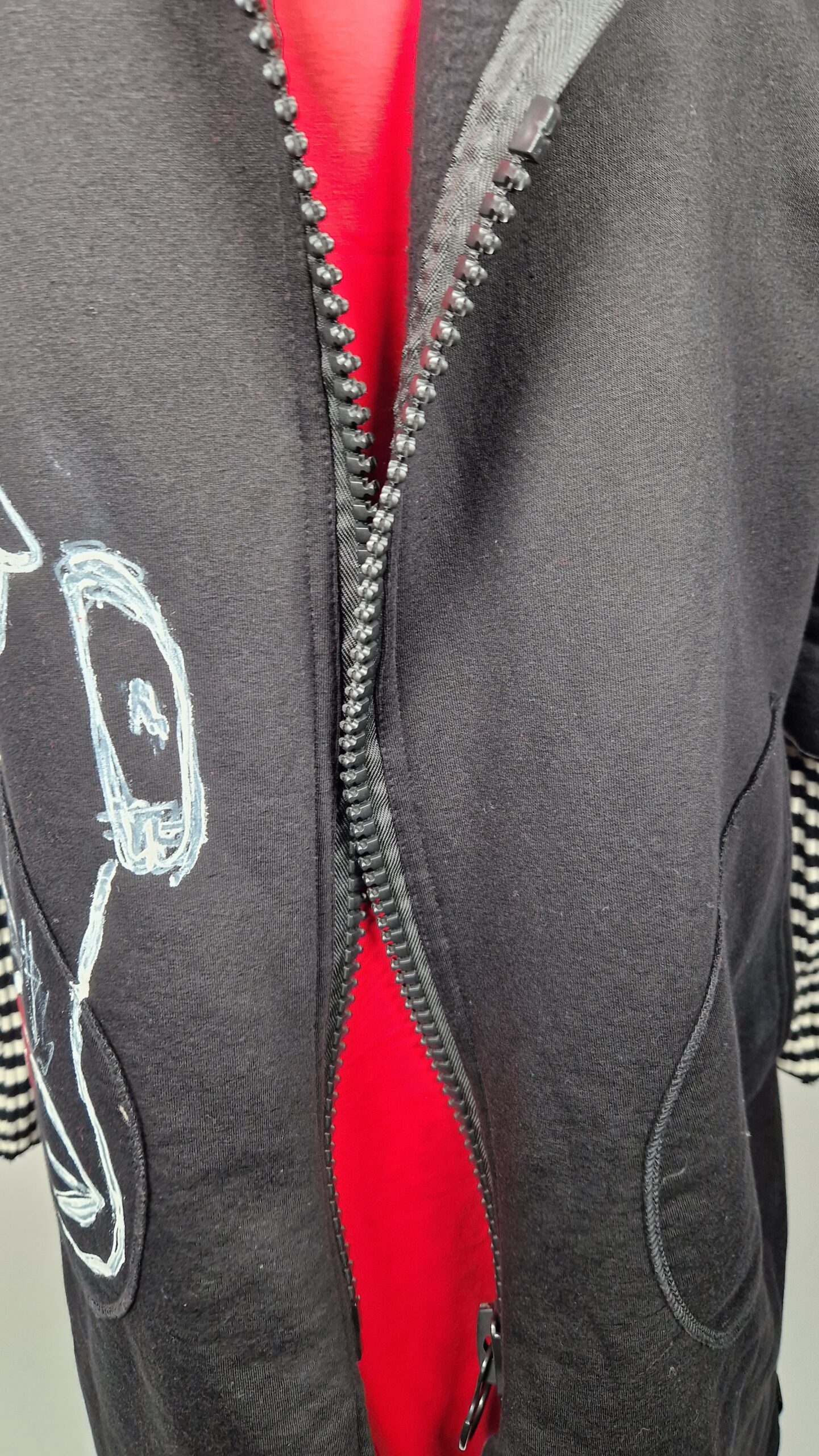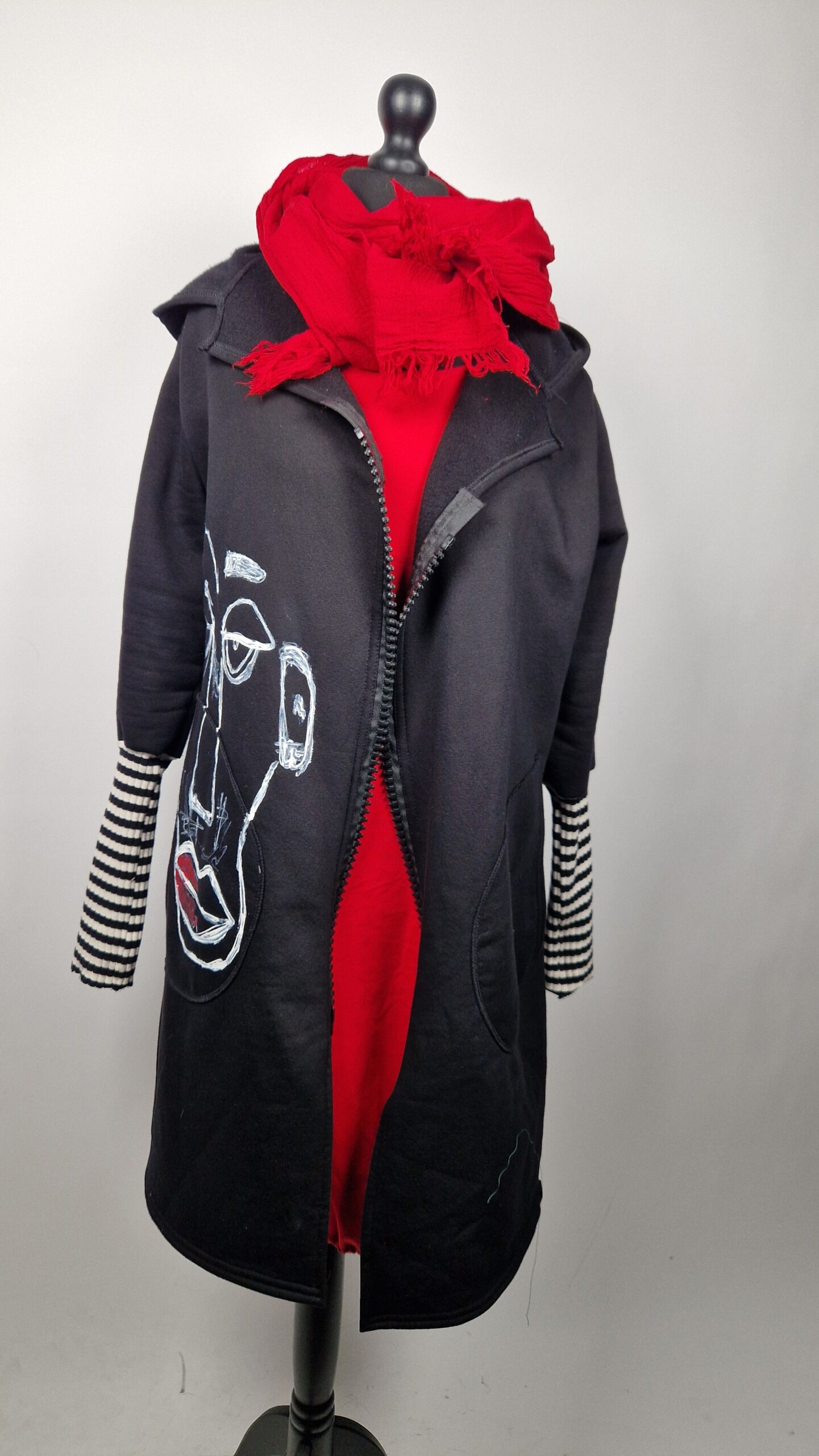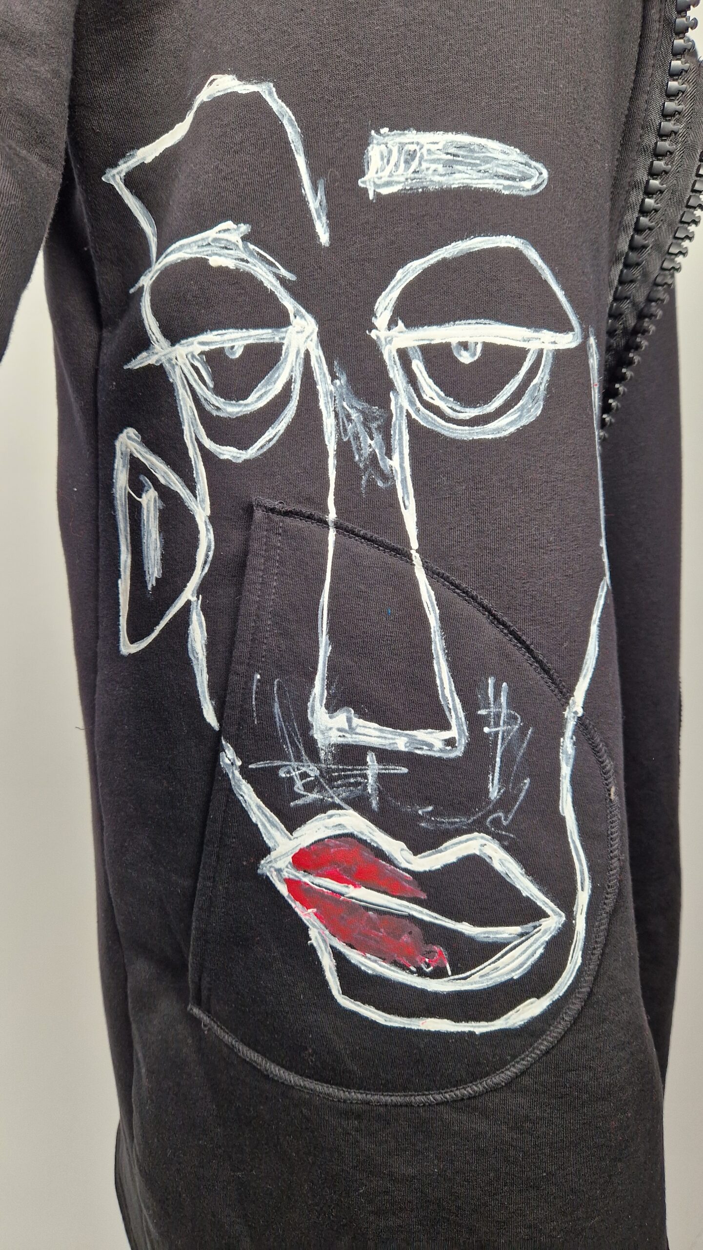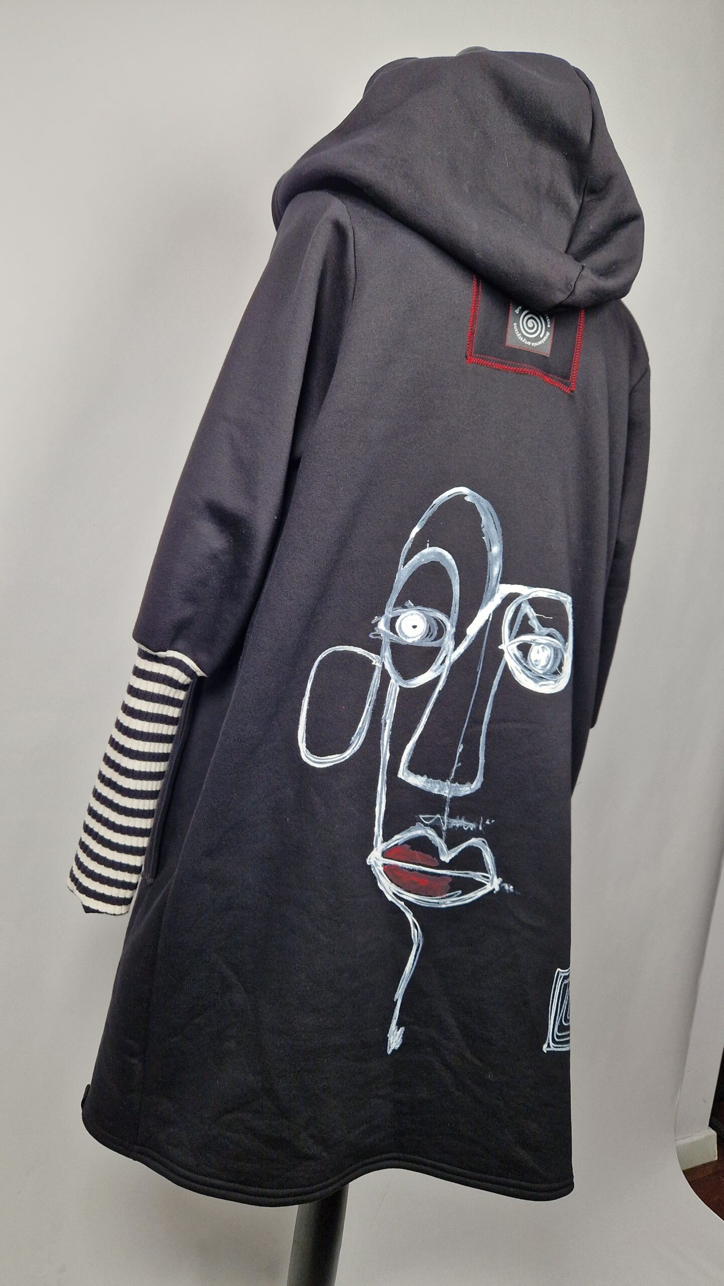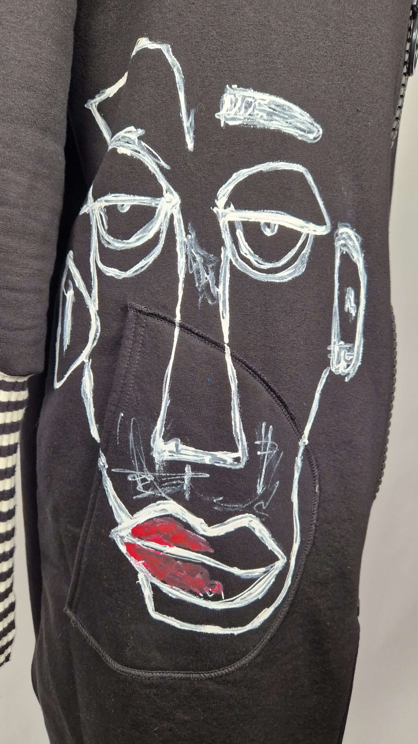 Bluzopłaszcz JohnBello M/L obłędnie zgrabny, wygodny, wszystko zakrywający COŚ , który pokochasz od pierwszego założenia. Bluzopłaszcz JohnBello M/L uszyty jest z mięciutkiej , drapanej bawełny, jest długi , gładki, ale ma duży zamek- ekspres-suwak, który jest świetną ozdobą, ma duże kieszenie na łapki , duży kaptur i długie rękawy z długimi ściągaczowymi , mankietami w paski. John Bello jest malowany ręcznie , ma namalowane portrety- jeden na plecach, a drugi z przodu.