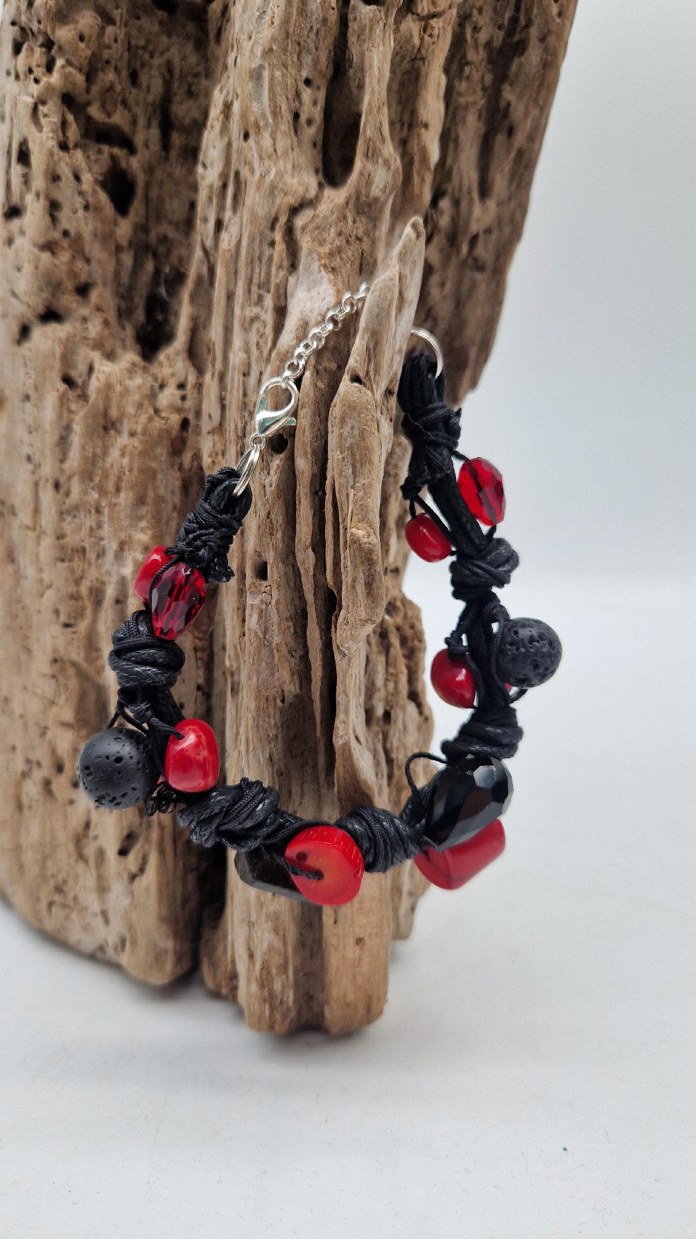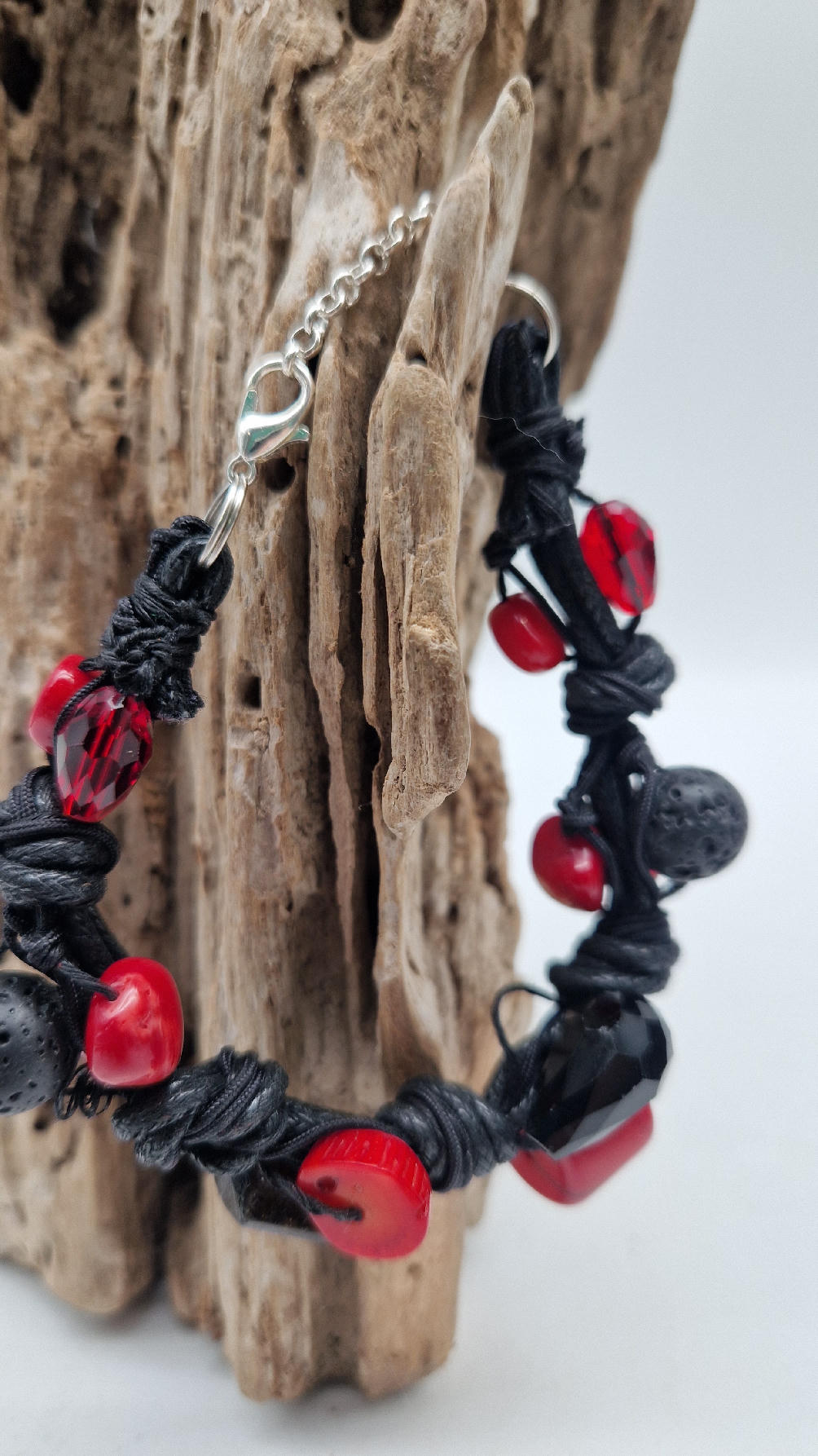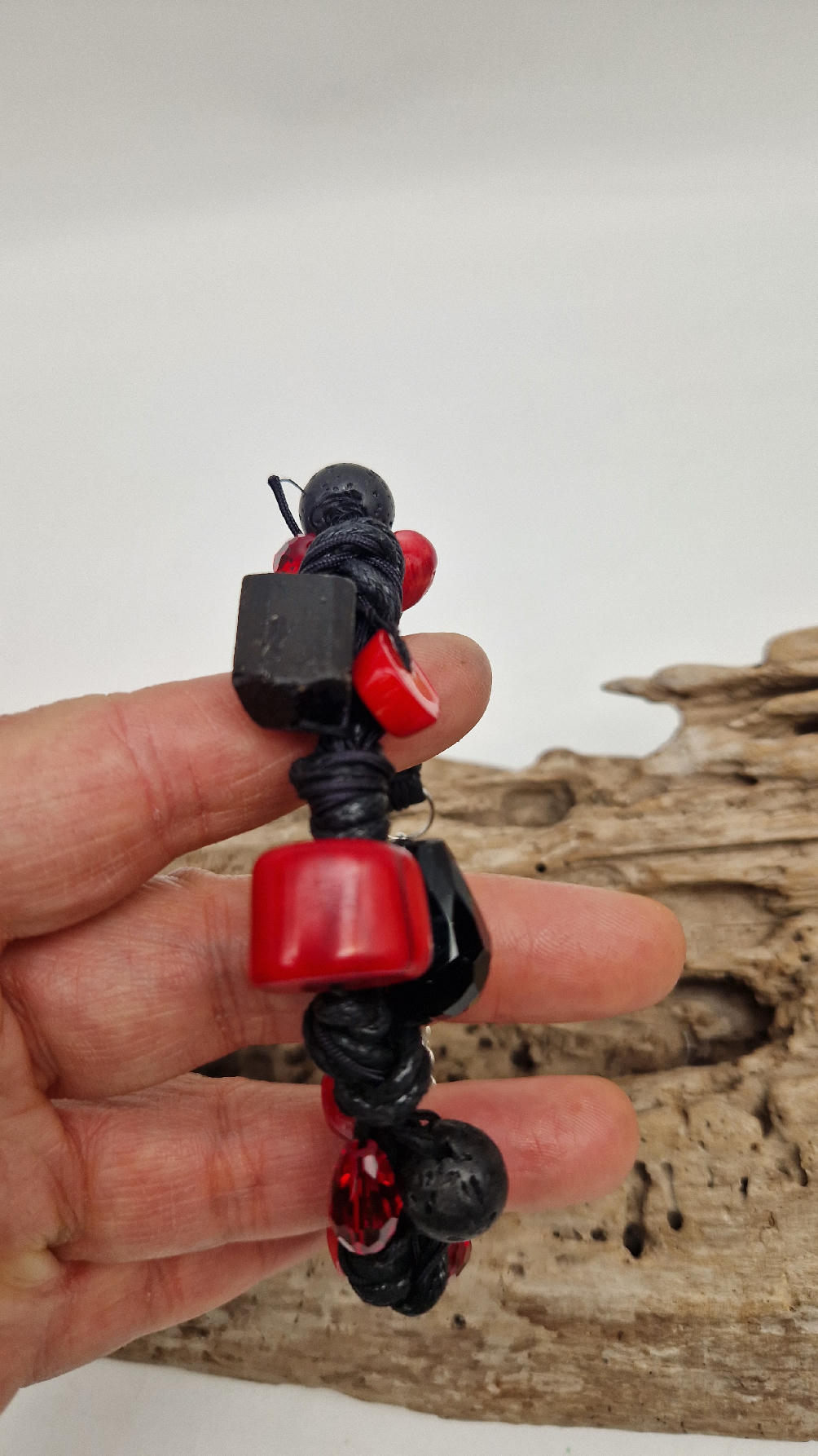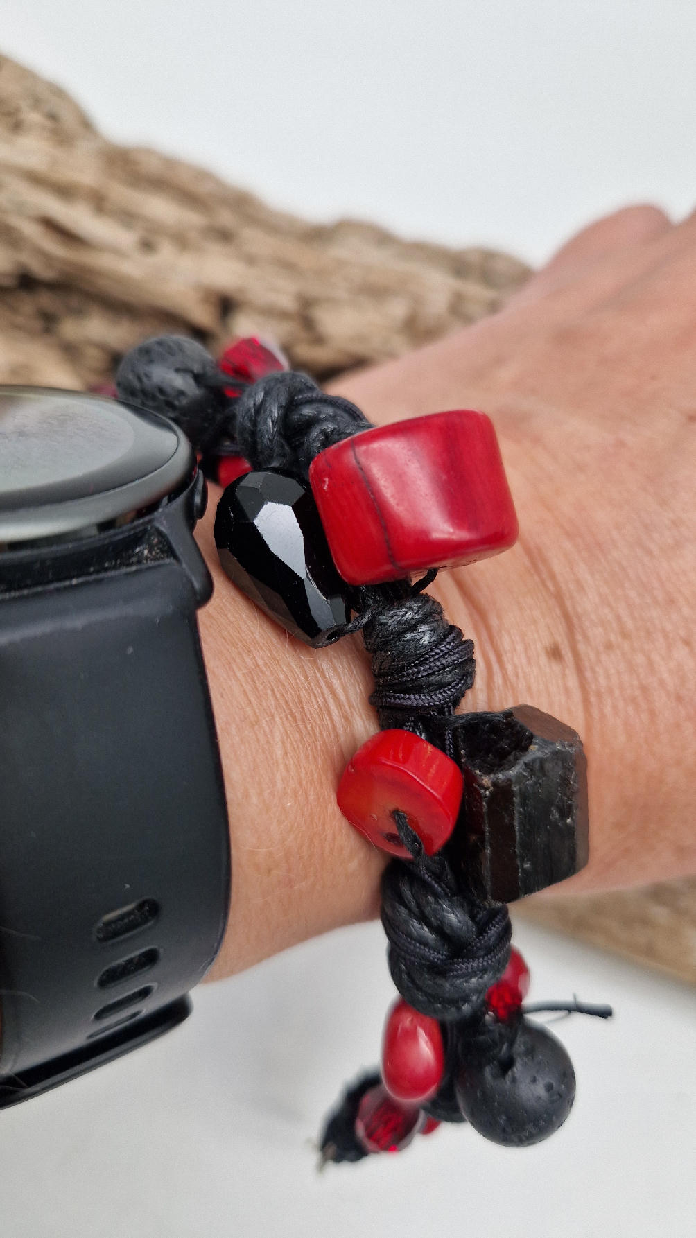 Śliczna bransoletka z korali, lawy i szklanych koralików na czarnym, bawełnianym sznurku.