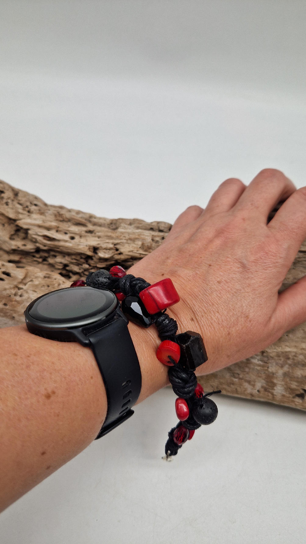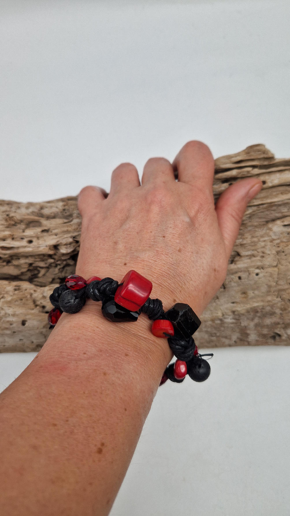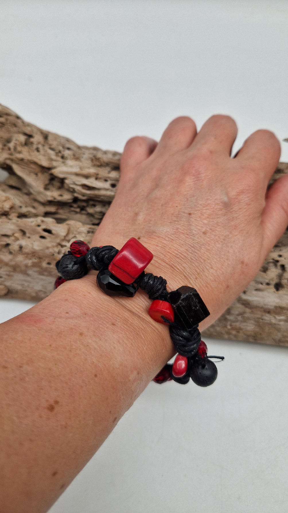 Śliczna bransoletka z korali, lawy i szklanych koralików na czarnym, bawełnianym sznurku.