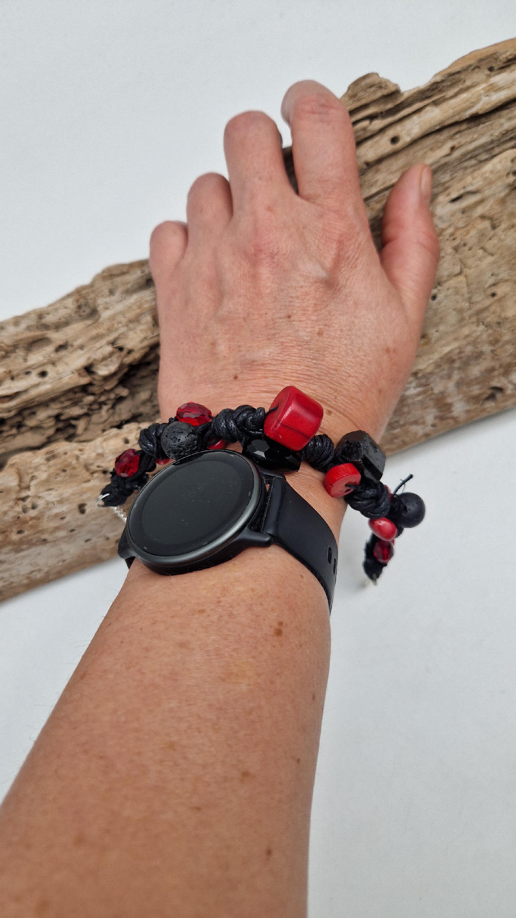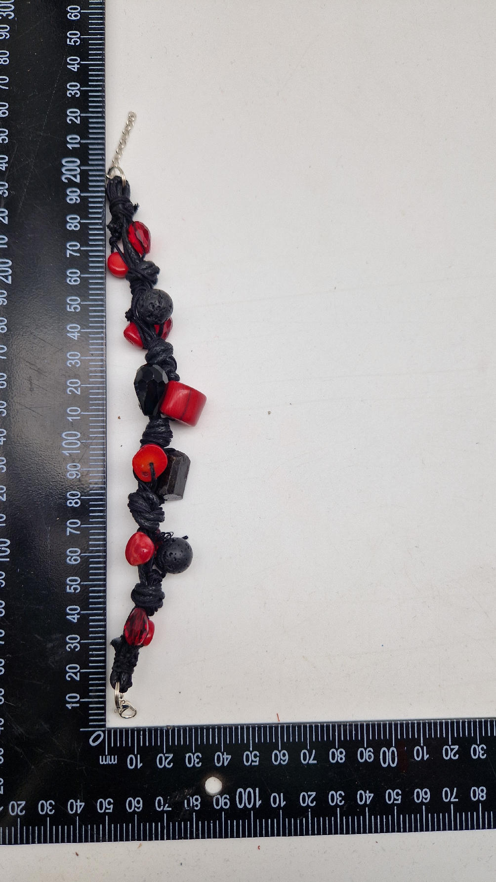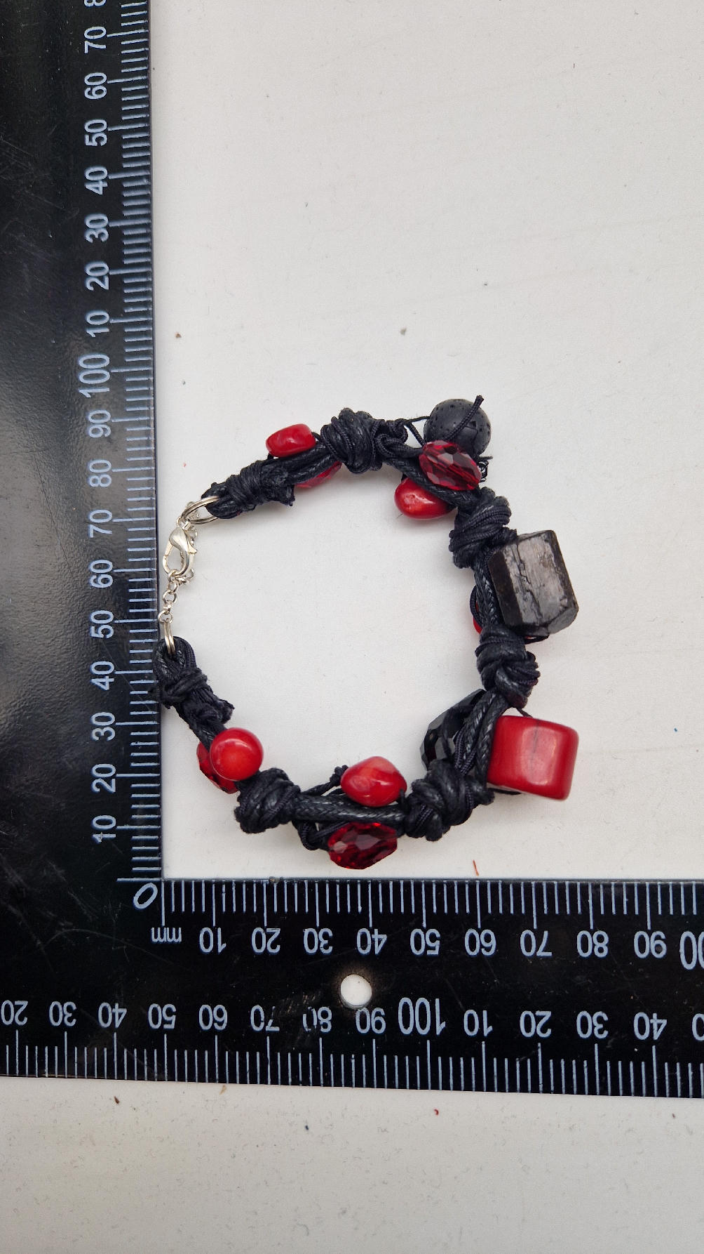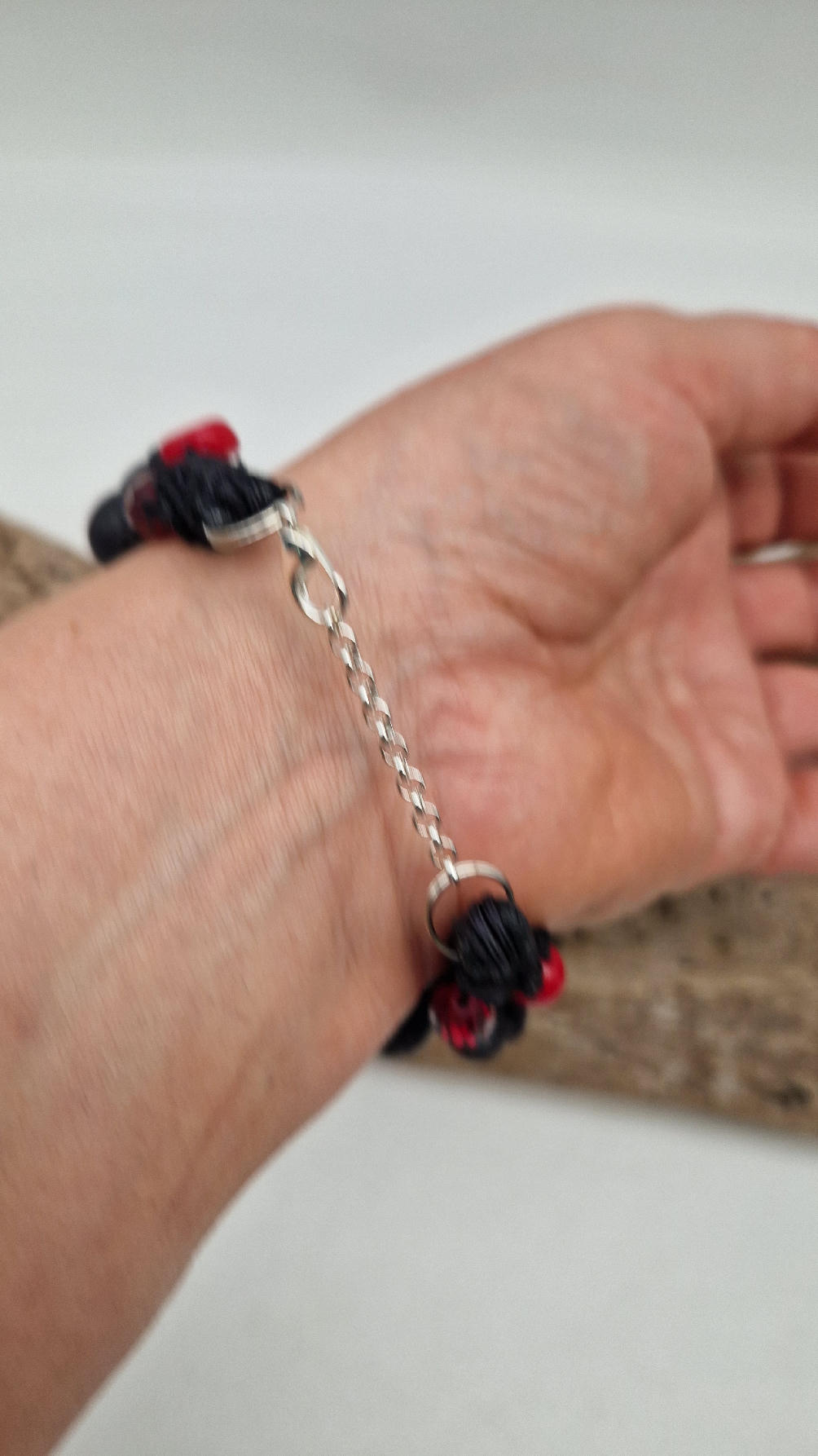 Śliczna bransoletka z korali, lawy i szklanych koralików na czarnym, bawełnianym sznurku.
