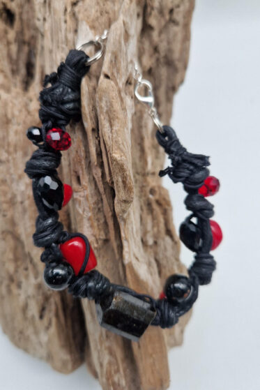 Bransoletka wykonana jest z perły, onyxów, kryształów, agatów i elementów srebrzonych.