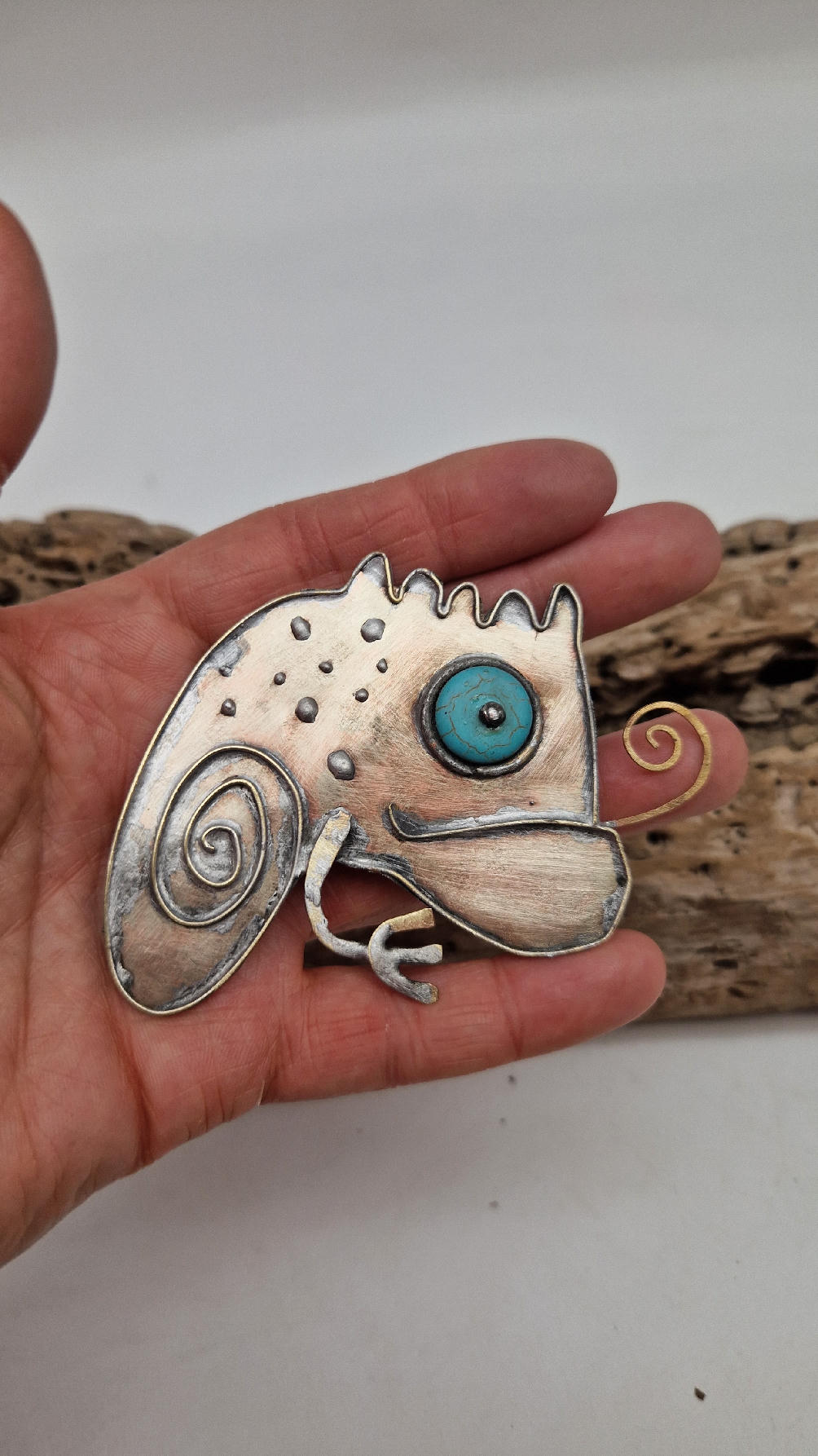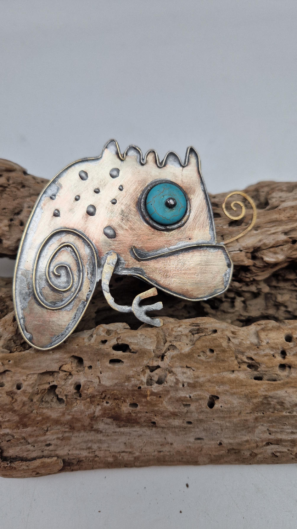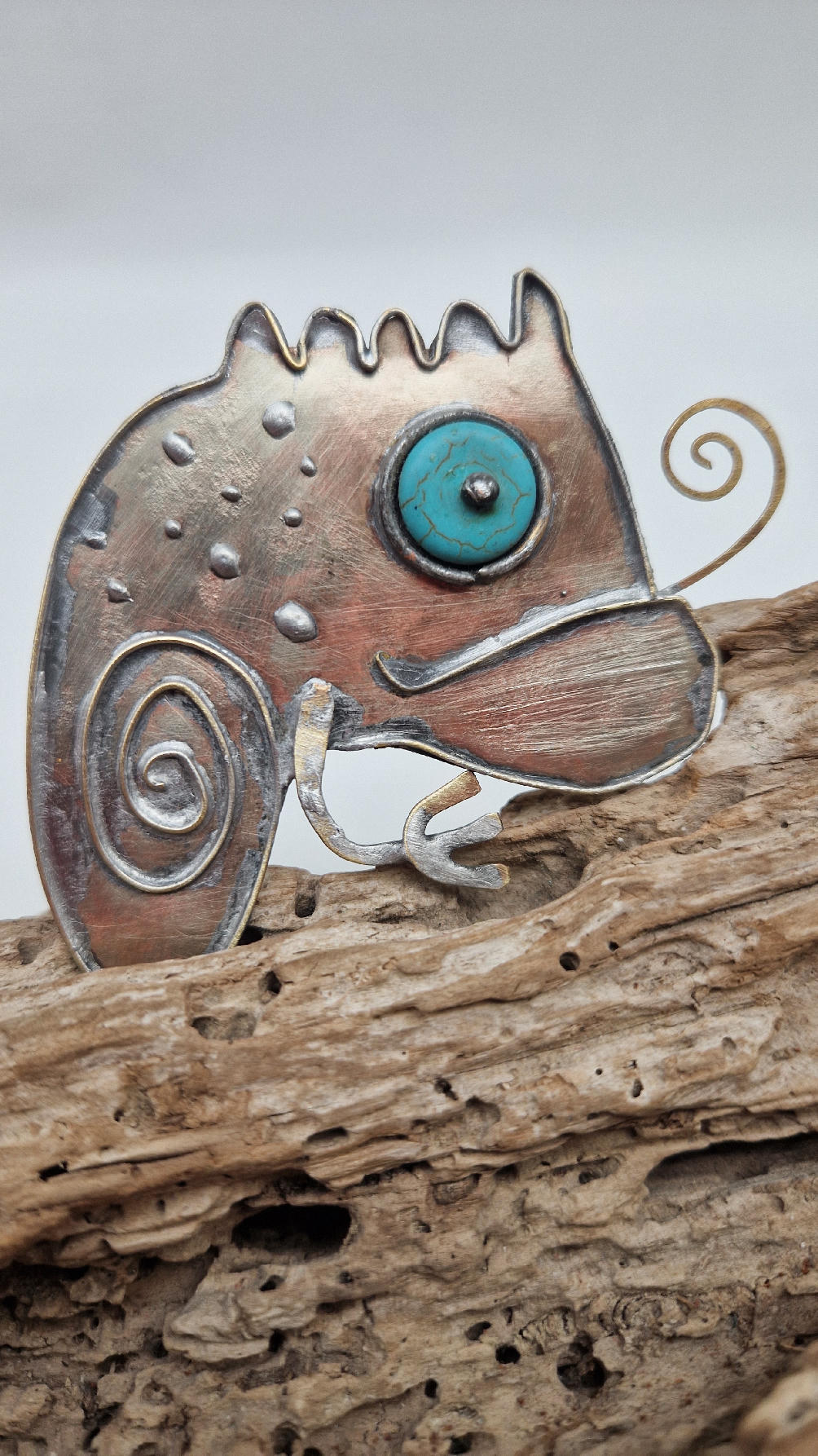 NIebieskooki kameleon. Piękna broszka wykonana z alpaki.