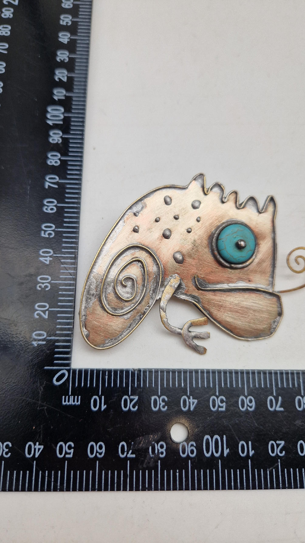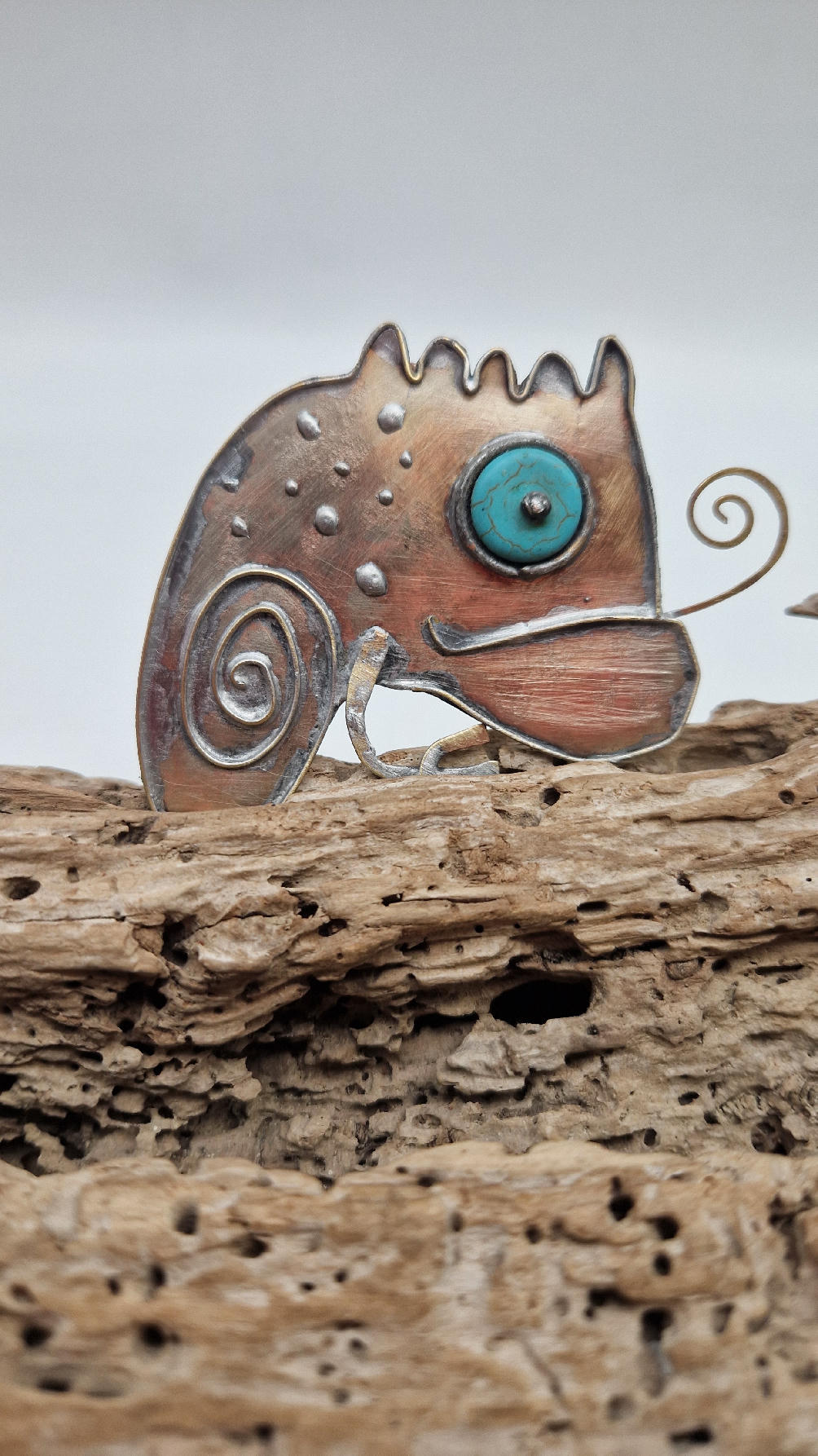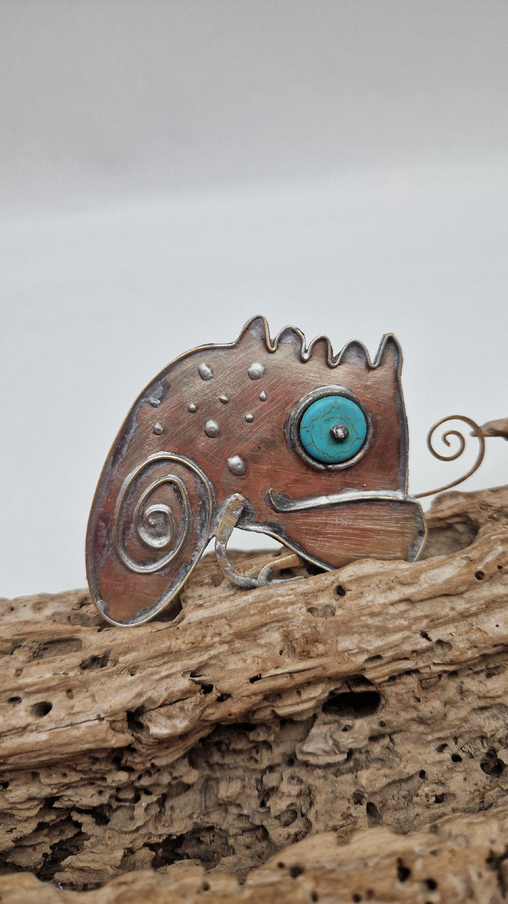 NIebieskooki kameleon. Piękna broszka wykonana z alpaki.