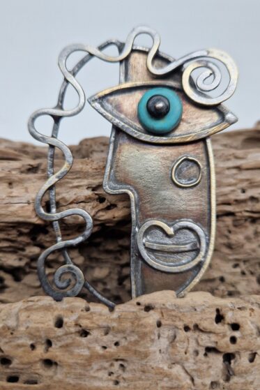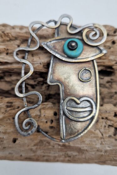 Brocha wykonana ręcznie z blachy alpakowej (alpaka tzw nowe srebro) i miedzi. Lutowana i patynowana.