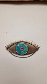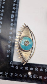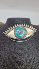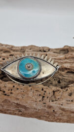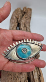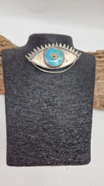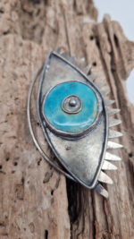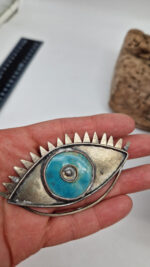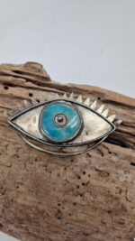 Duża, obłędna, metalowa brocha z alpaki, z ręcznie robioną ceramiką w kolorze blue; duże oko ,które przyciąga wzrok i nikt Ci się nie oprze…