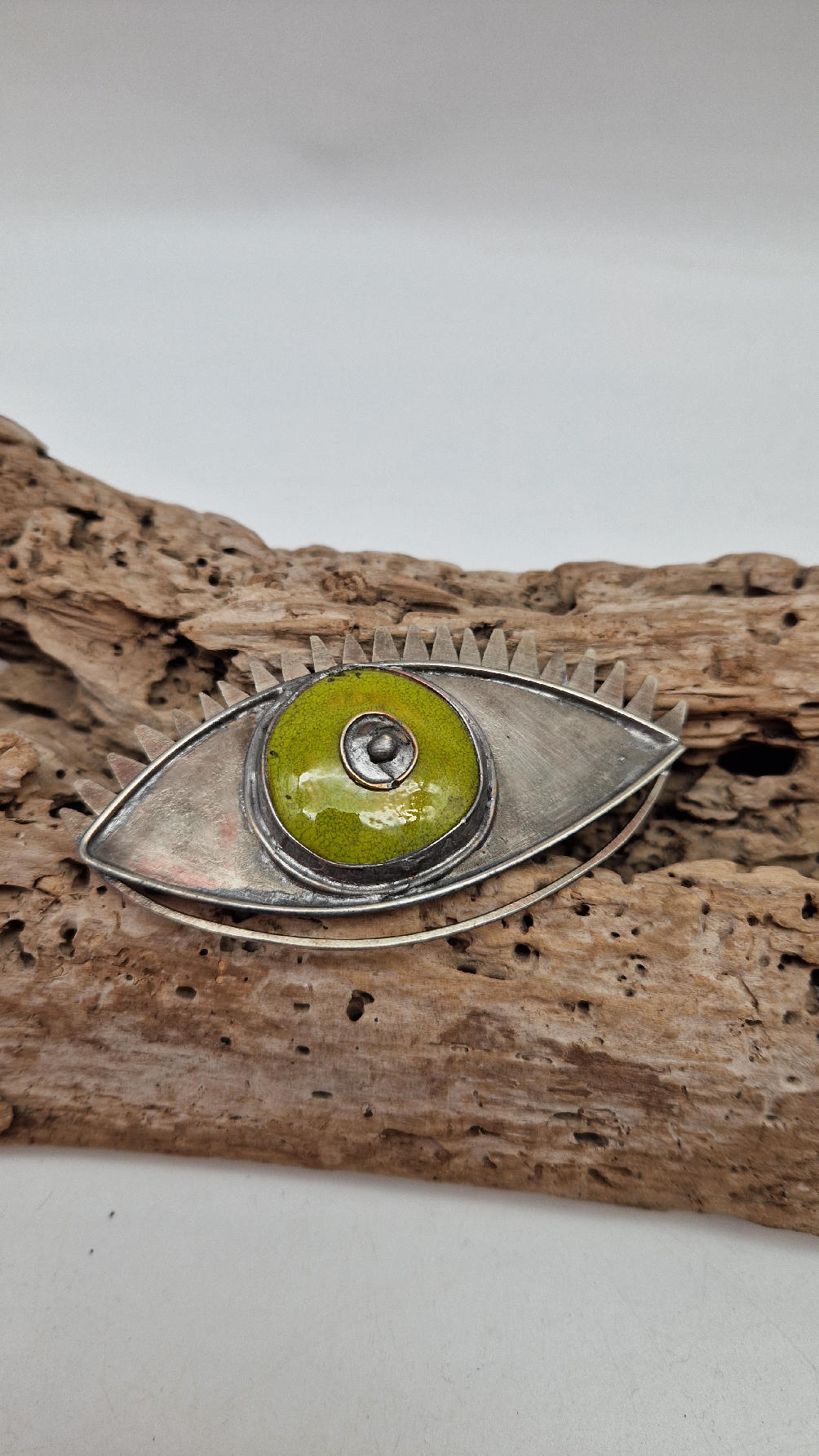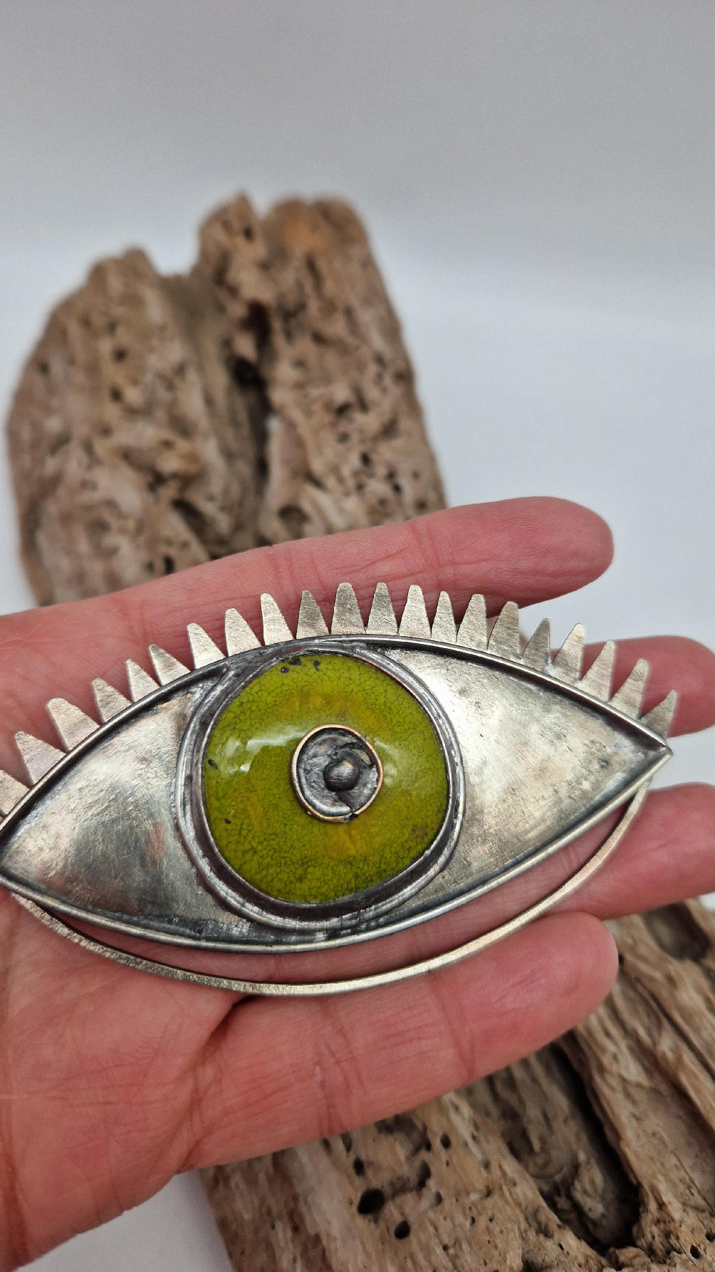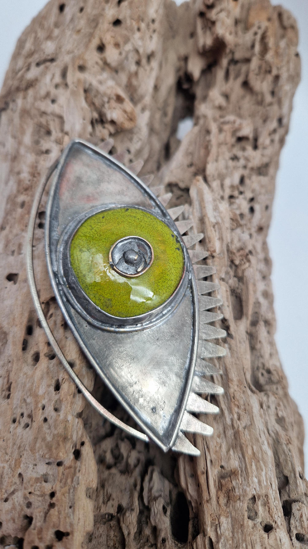 Duża, obłędna, metalowa brocha z alpaki, z ręcznie robioną ceramiką w kolorze cytrynowej zieleni; duże oko ,które przyciąga wzrok i nikt Ci się nie oprze…