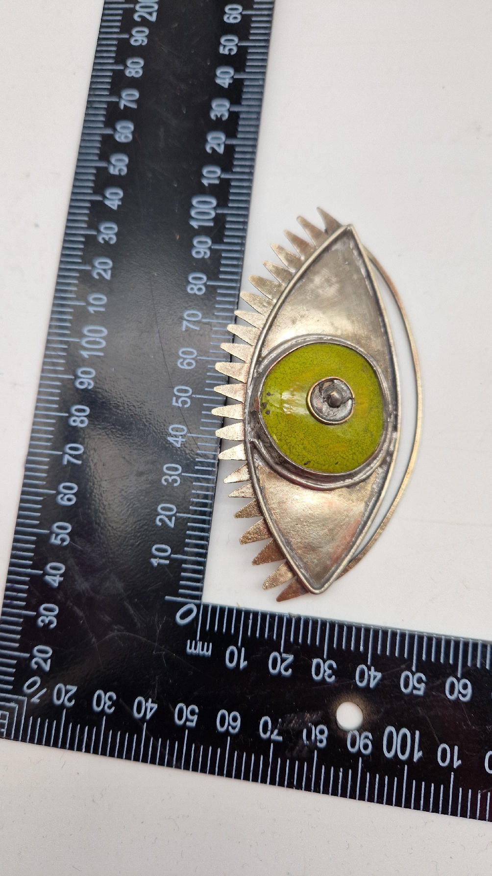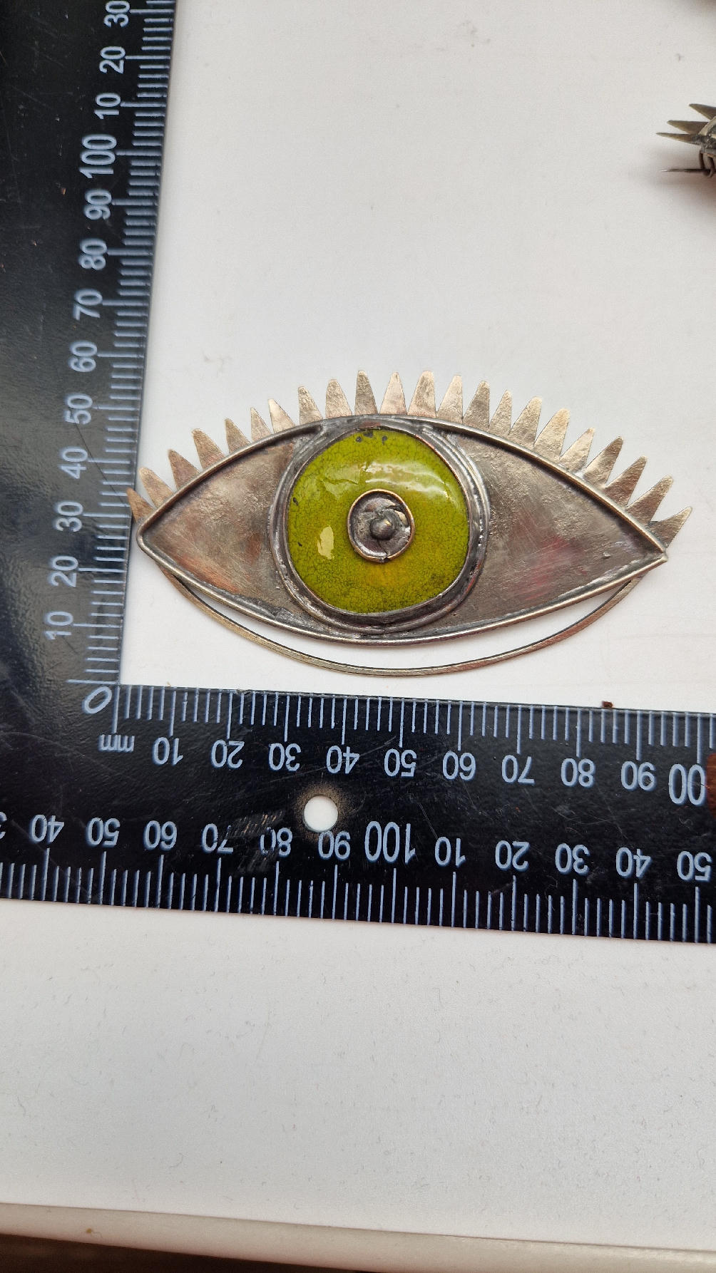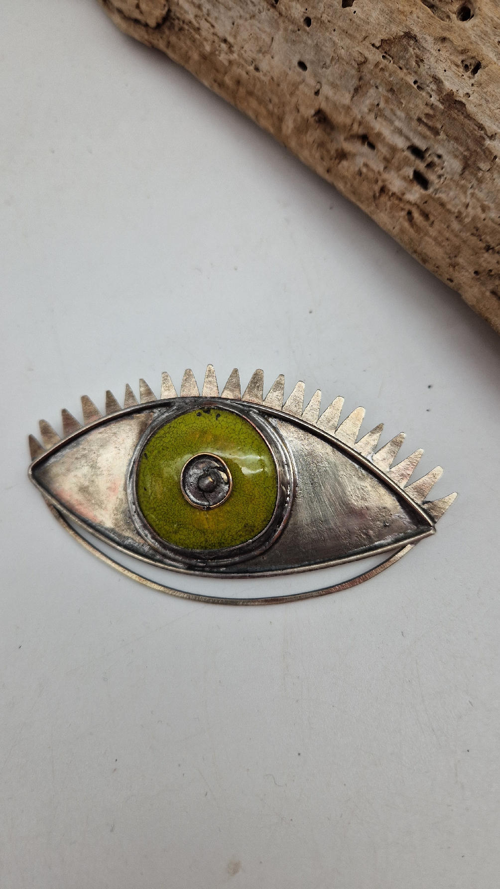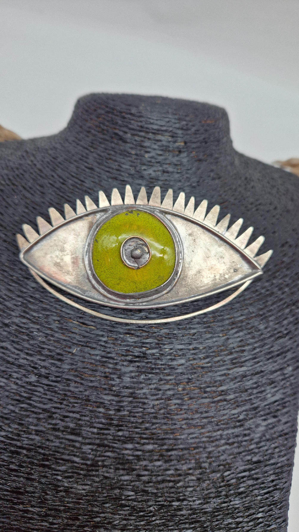 Duża, obłędna, metalowa brocha z alpaki, z ręcznie robioną ceramiką w kolorze cytrynowej zieleni; duże oko ,które przyciąga wzrok i nikt Ci się nie oprze…