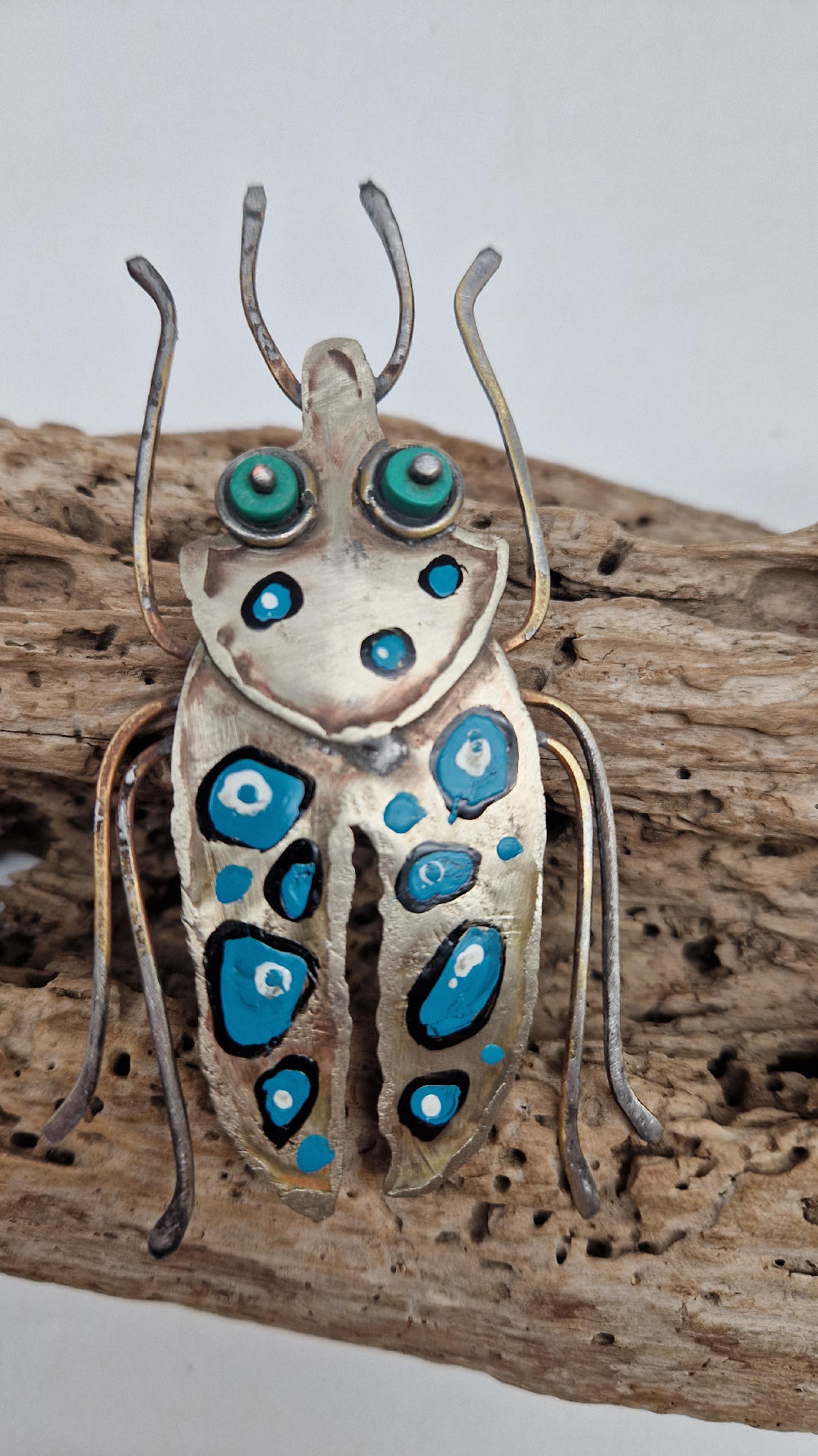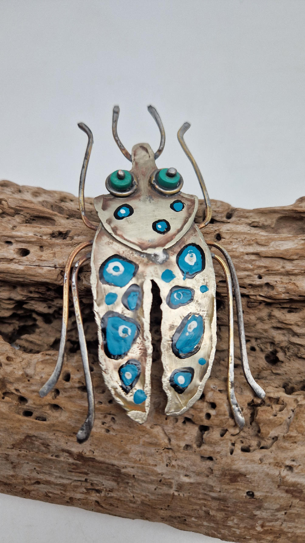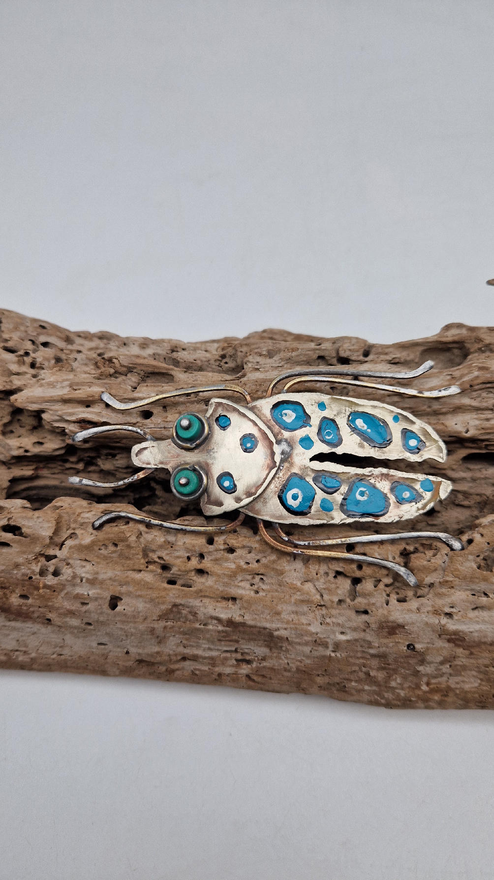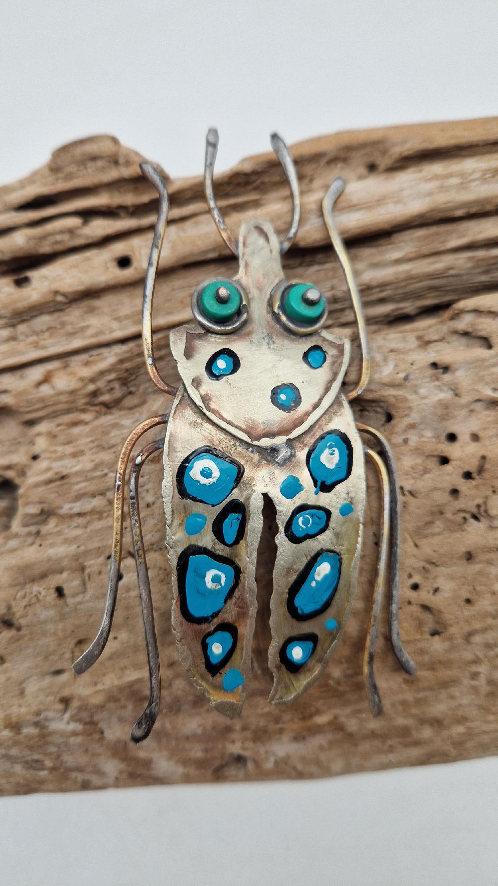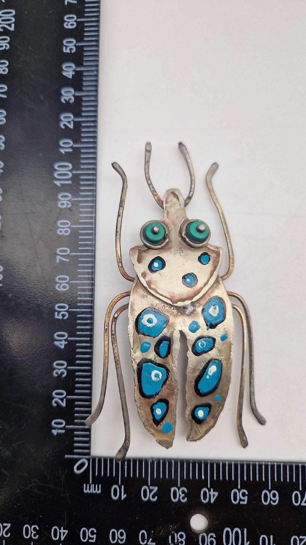 Piękna broszka wykonana z alpaki, cynowana, patynowana, malowana i lutowana ręcznie . Totalnie unikatowa, bo nawet jak ma siostrę, czy brata, to i tak jest całkiem wyjątkowa