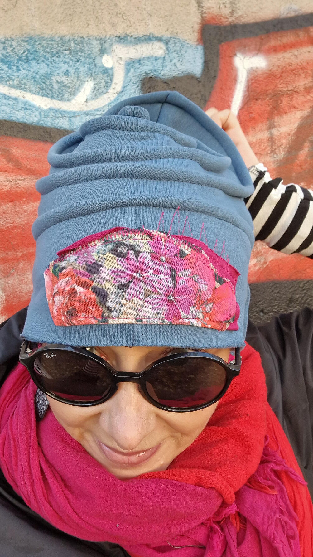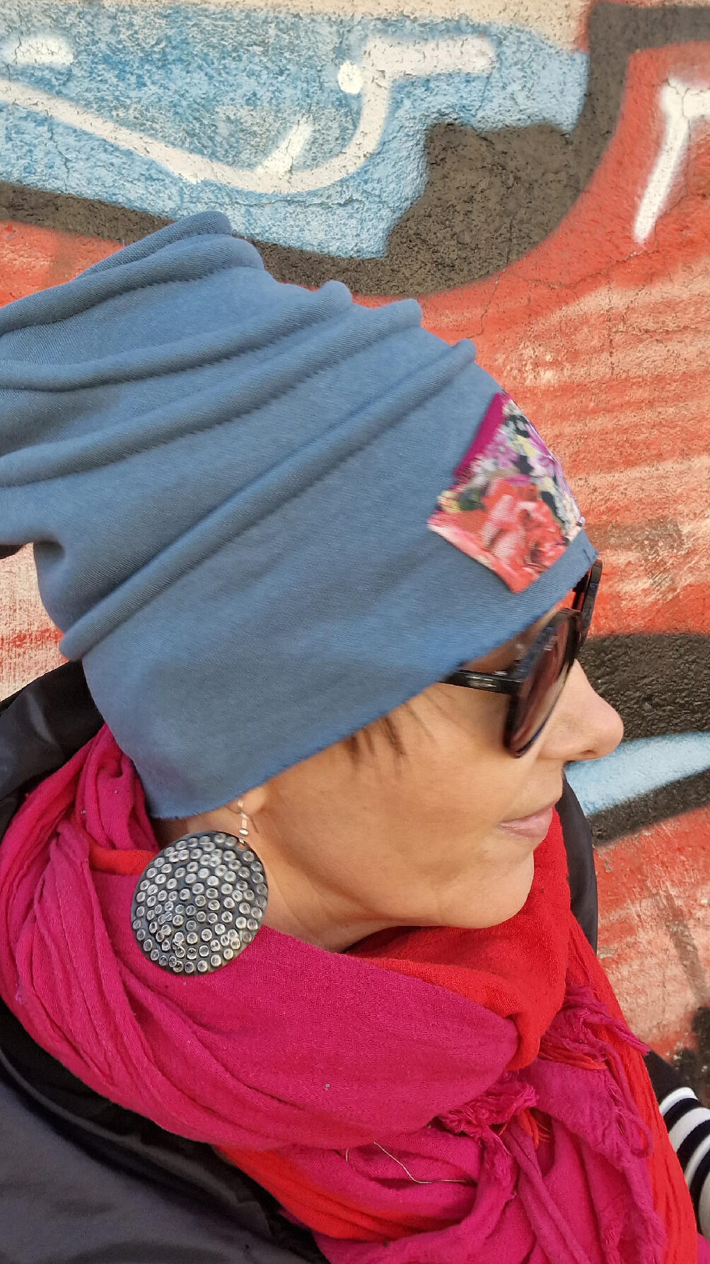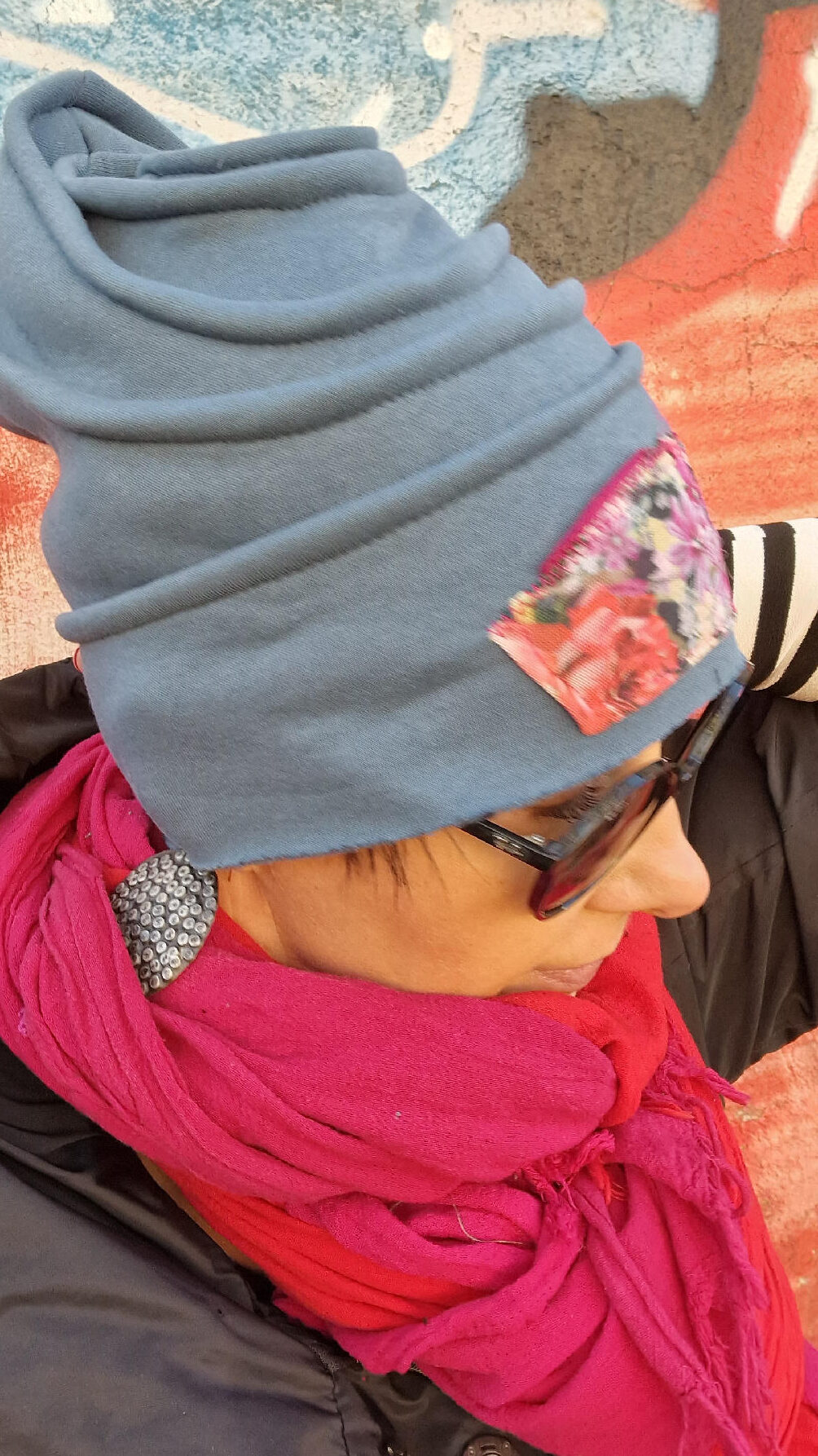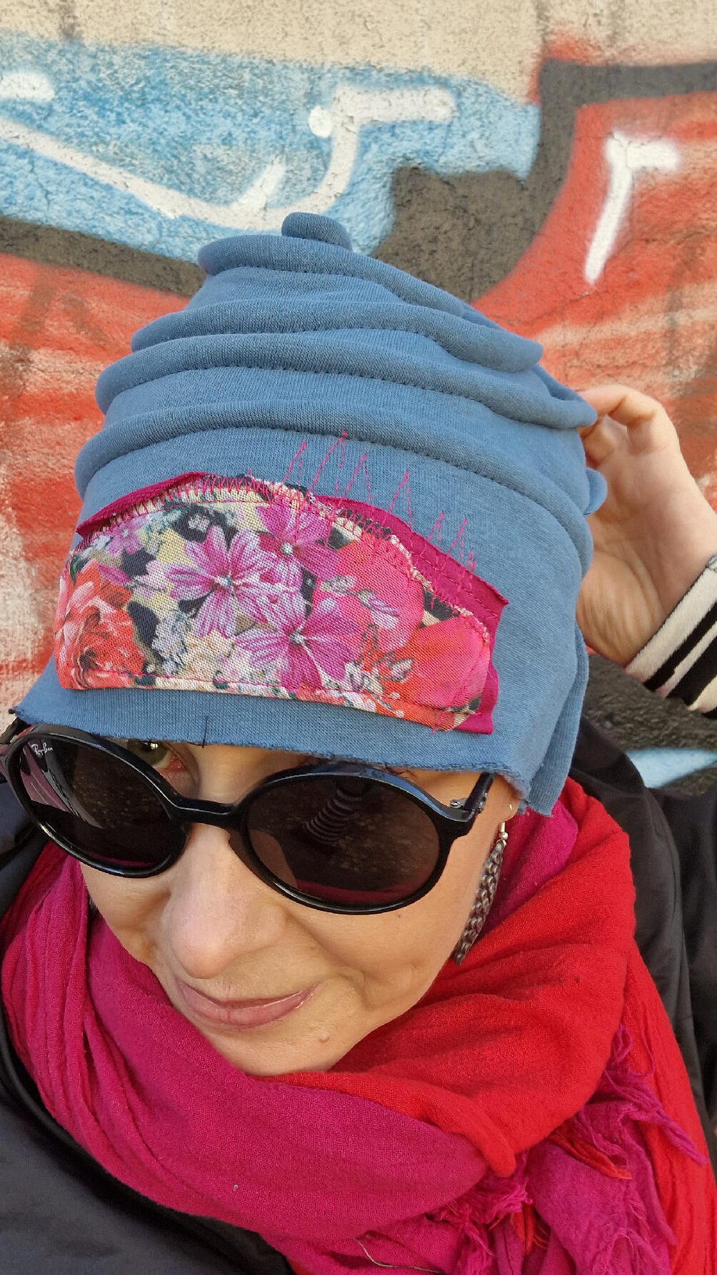 Uszyta z miękkiej, niebieskiej, drapanej bawełny, z przodu bukiet kolorowych kwiatów i niewielka madżentowa ramka…jedna i niepowtarzalna, z unikatową aplikacją z przodu, albo z boku, jeśli wolisz…kwiaty, nasycone kolory i przeszycia…