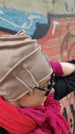 Czapka jest przestrzenna, architektoniczna, niegniecąca włosów.