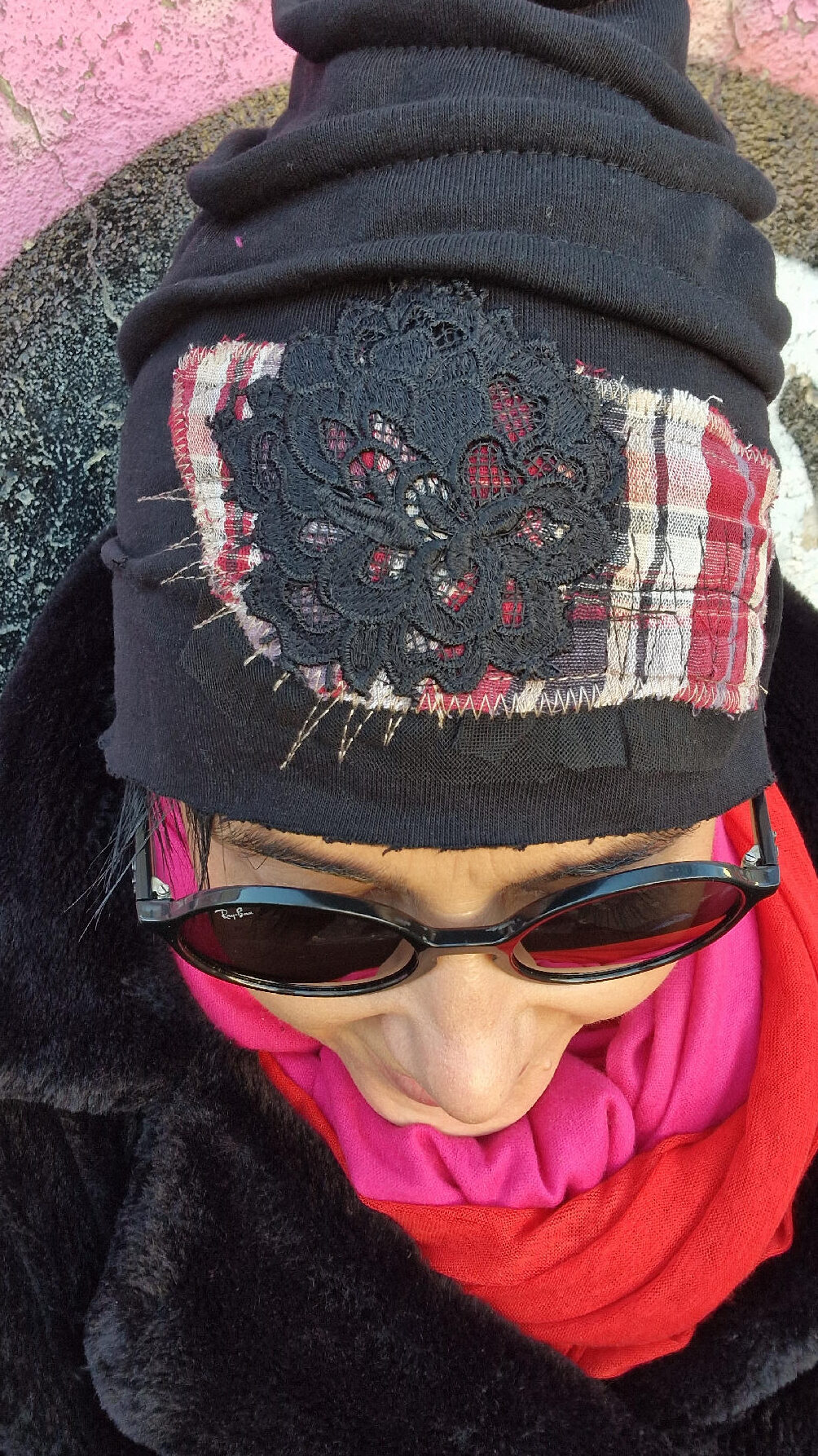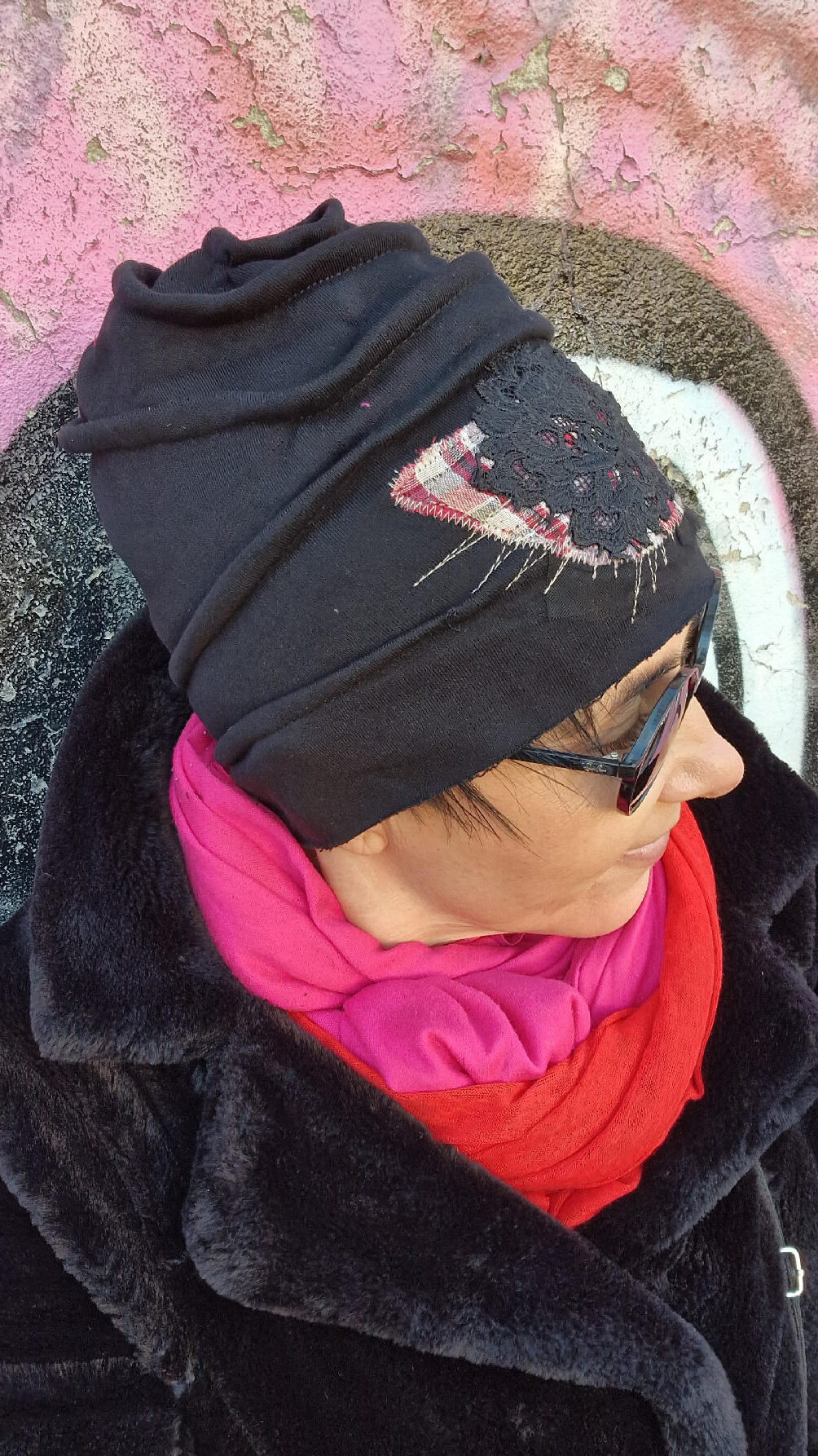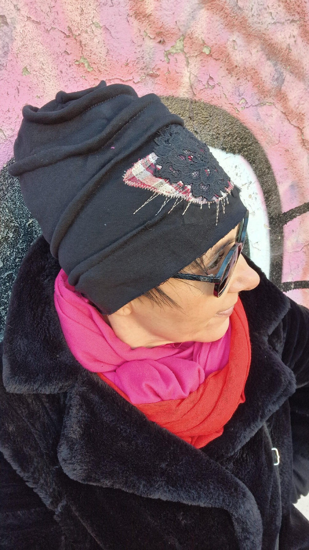 Czapka Marie-Alice uszyta z grubej bawełny z aplikacją – kratka , koronka, a właściwie piękna gipiurą i przeszycia…śliczna, uwodzicielska , kobieca na pewno nikt nie będzie mieć takiej czapki jak Ty!