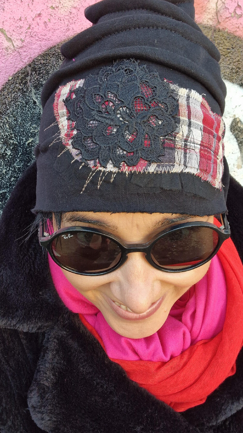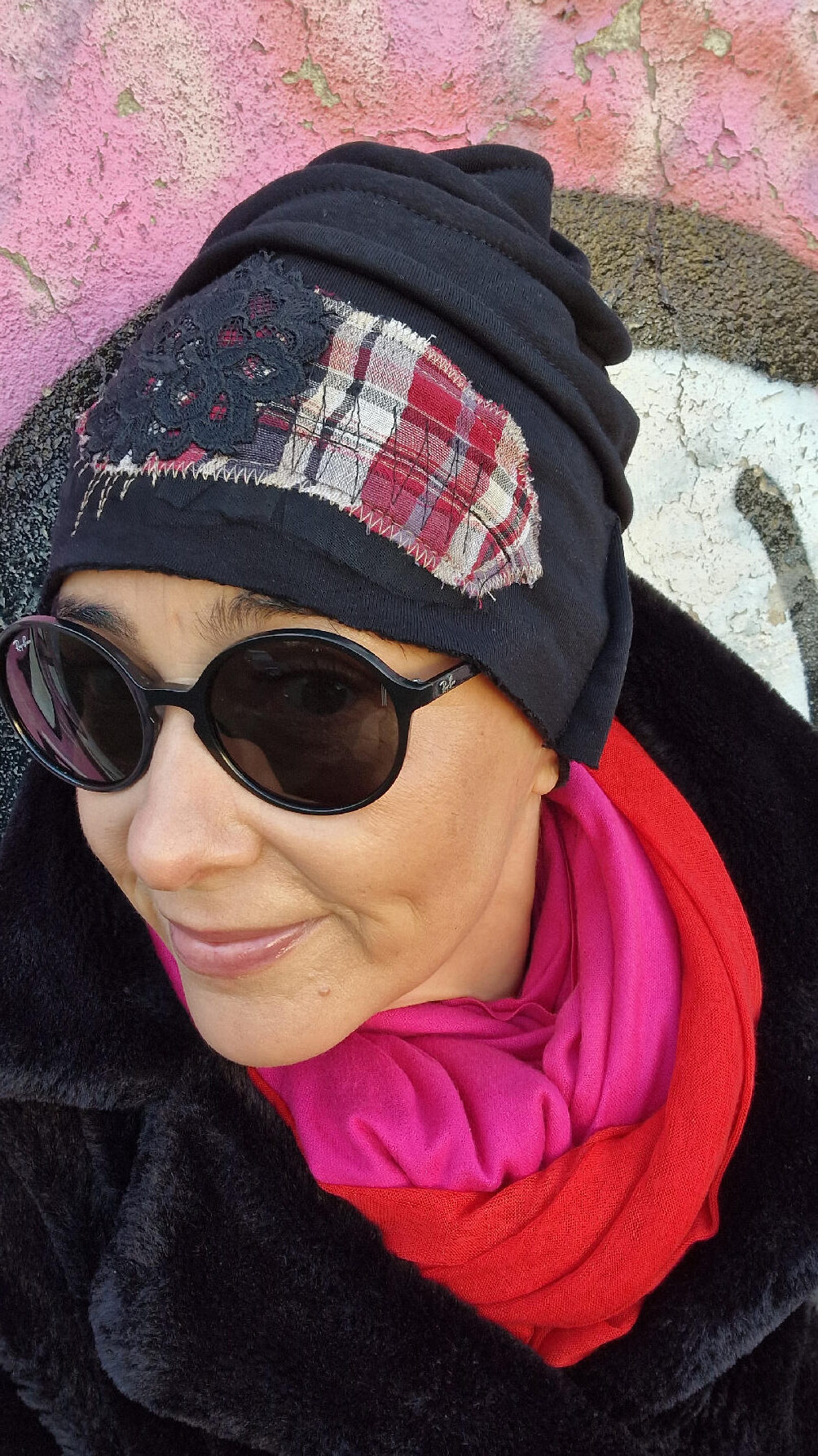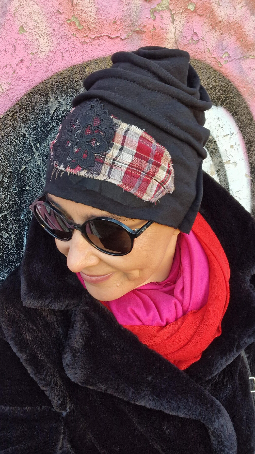 Czapka Marie-Alice uszyta z grubej bawełny z aplikacją – kratka , koronka, a właściwie piękna gipiurą i przeszycia…śliczna, uwodzicielska , kobieca na pewno nikt nie będzie mieć takiej czapki jak Ty!