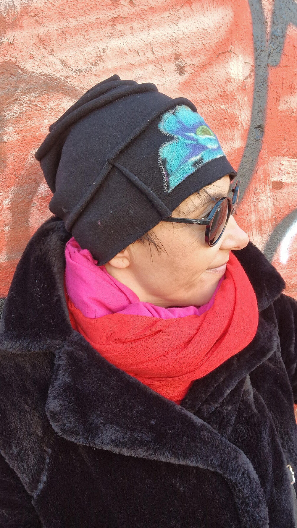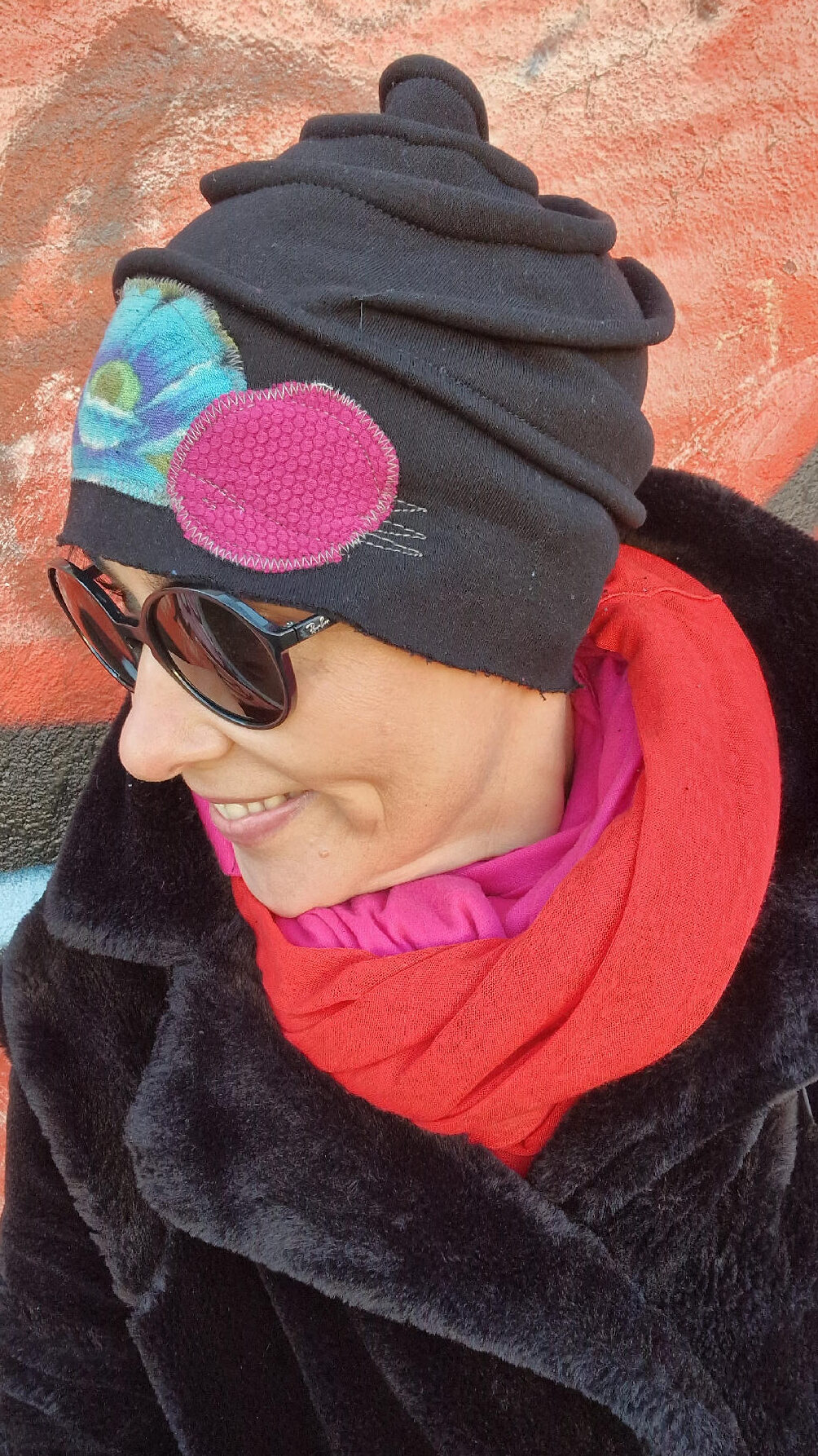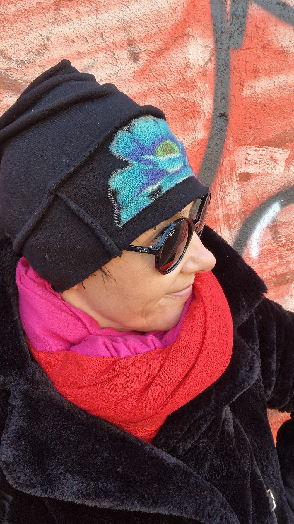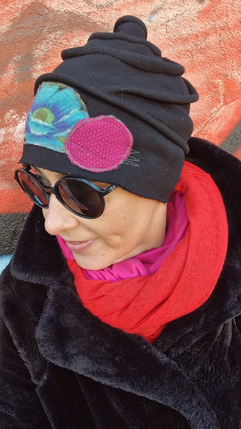 Uszyta z miękkiej, grubej, czarnej drapanej bawełny, jedna i niepowtarzalna, taka śliczna i kobieca… z dużym , pięknym kwiatem z przodu, albo z boku, jeśli wolisz…z ociupiną amarantu. Czapka śliczna