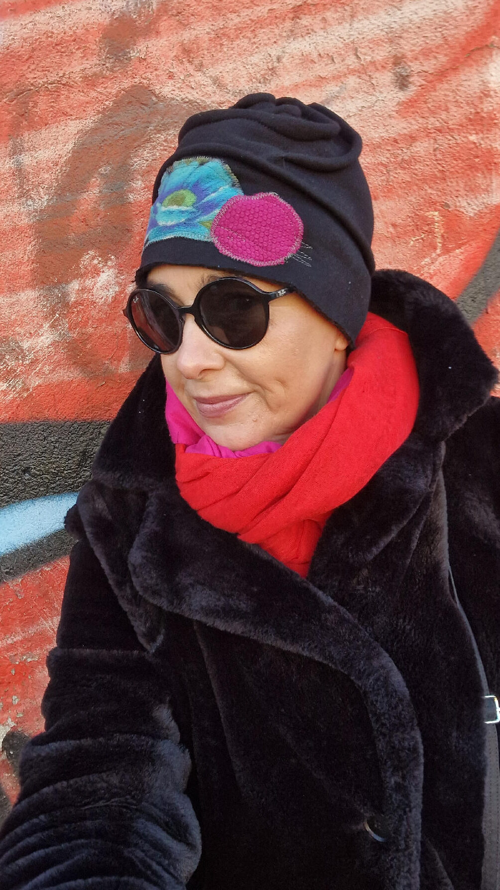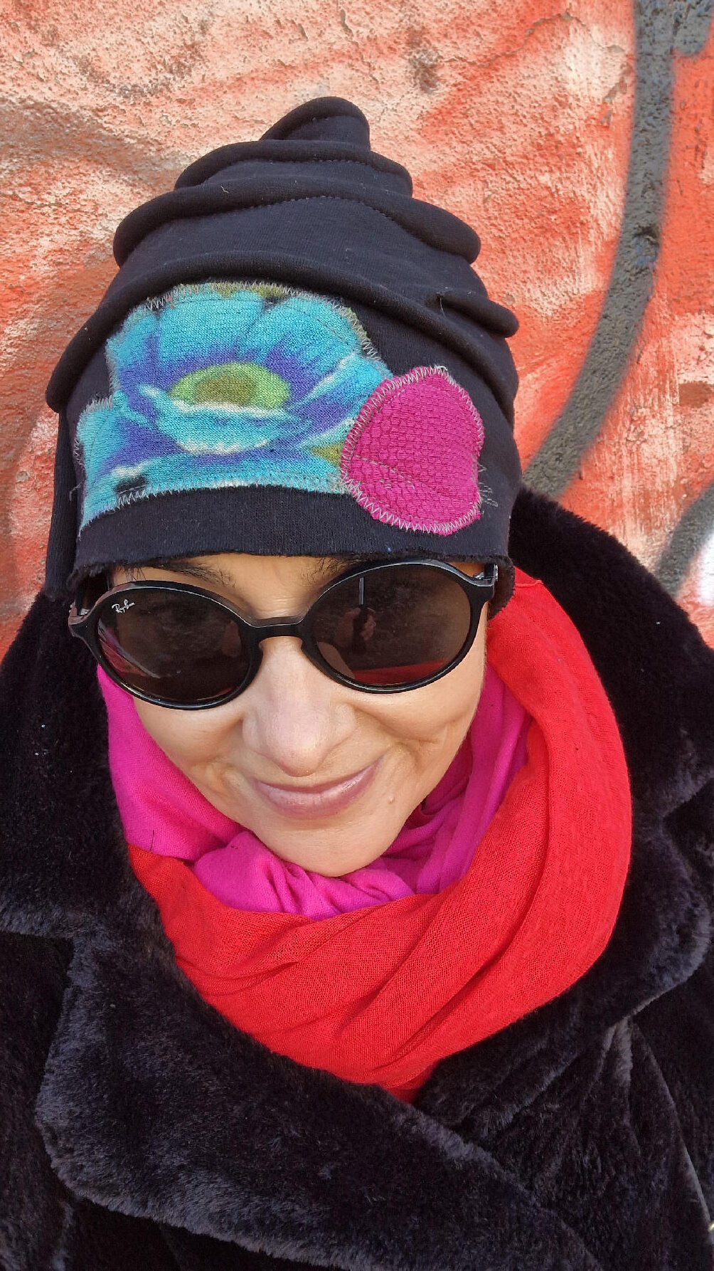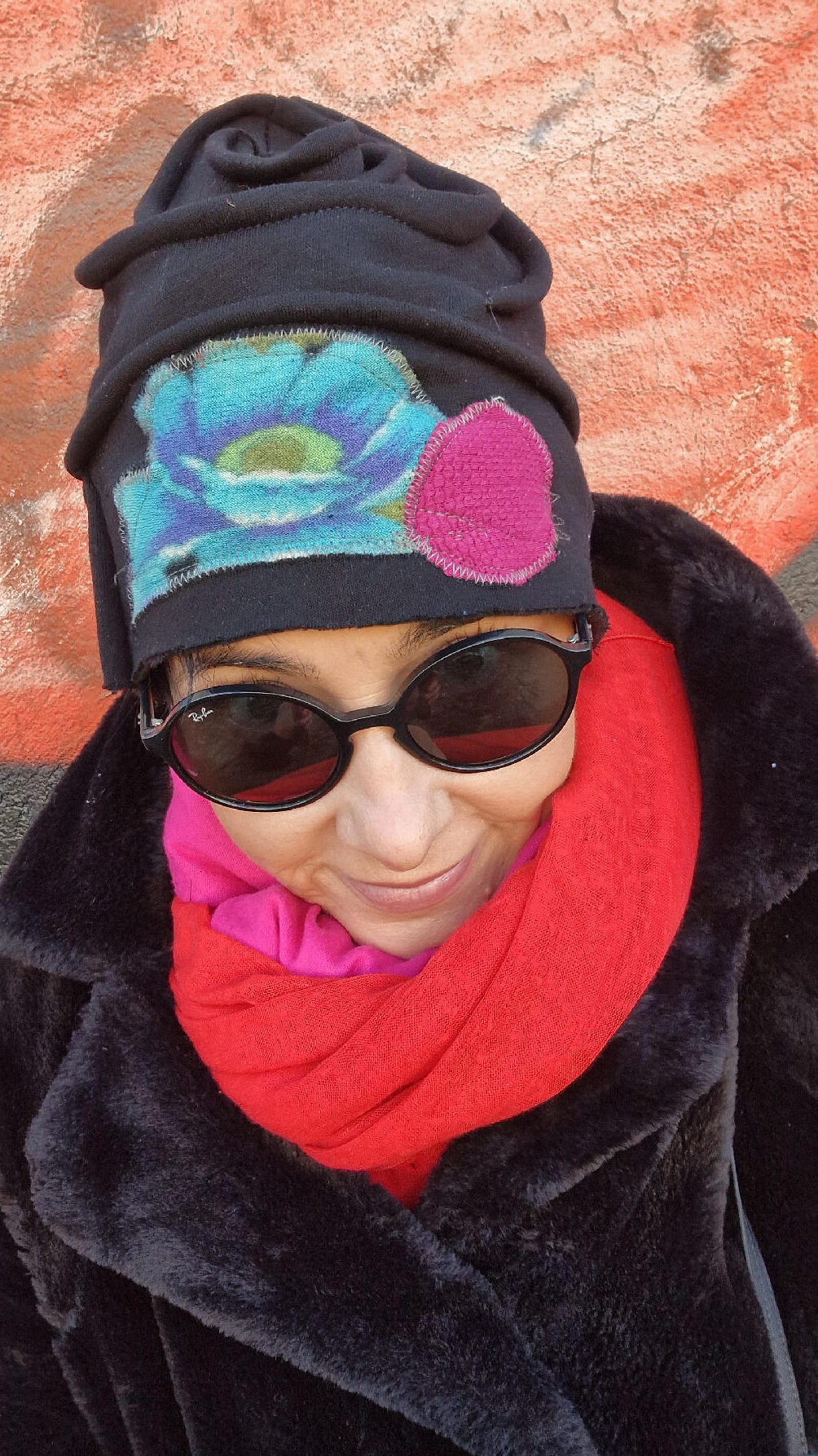 Uszyta z miękkiej, grubej, czarnej drapanej bawełny, jedna i niepowtarzalna, taka śliczna i kobieca… z dużym , pięknym kwiatem z przodu, albo z boku, jeśli wolisz…z ociupiną amarantu. Czapka śliczna