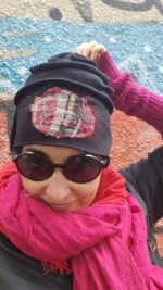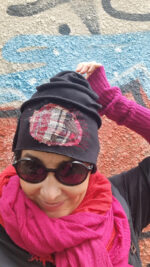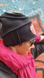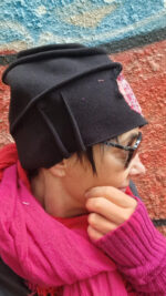 Uszyta z miękkiej, grubej ,czarnej, drapanej bawełny, jedna i niepowtarzalna, z unikatową aplikacją z przodu, albo z boku, jeśli wolisz…kratka, przeszycia…