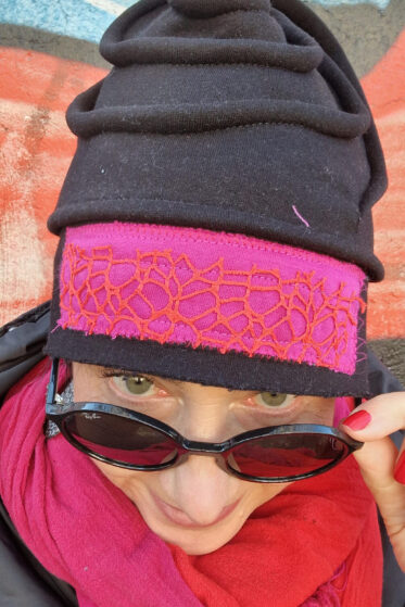 Uszyta z miękkiej, grubej, czarnej drapanej bawełny, czapka na małą głowę jedna i niepowtarzalna, z unikatową aplikacją z przodu, albo z boku, jeśli wolisz…czarna baza, nasycone kolory, falbanka i przeszycia…